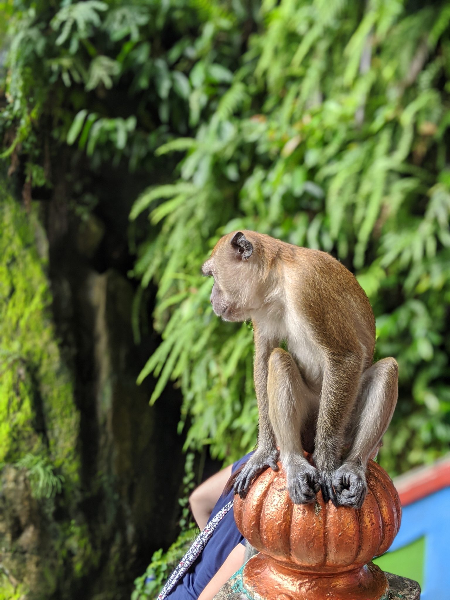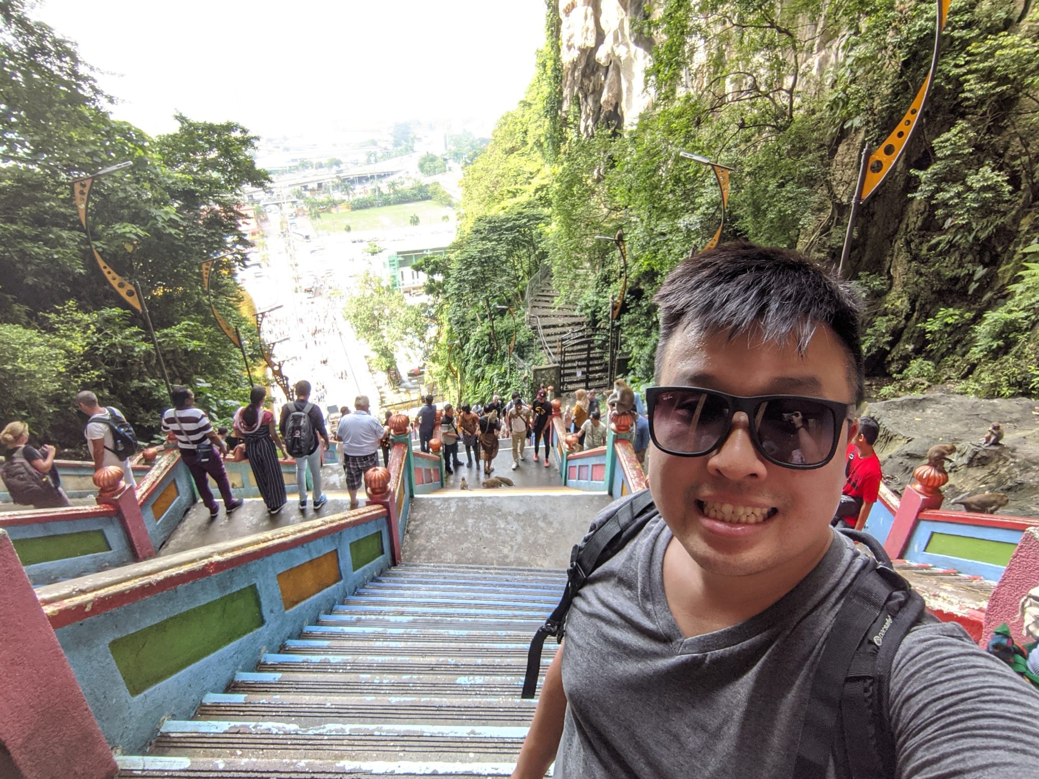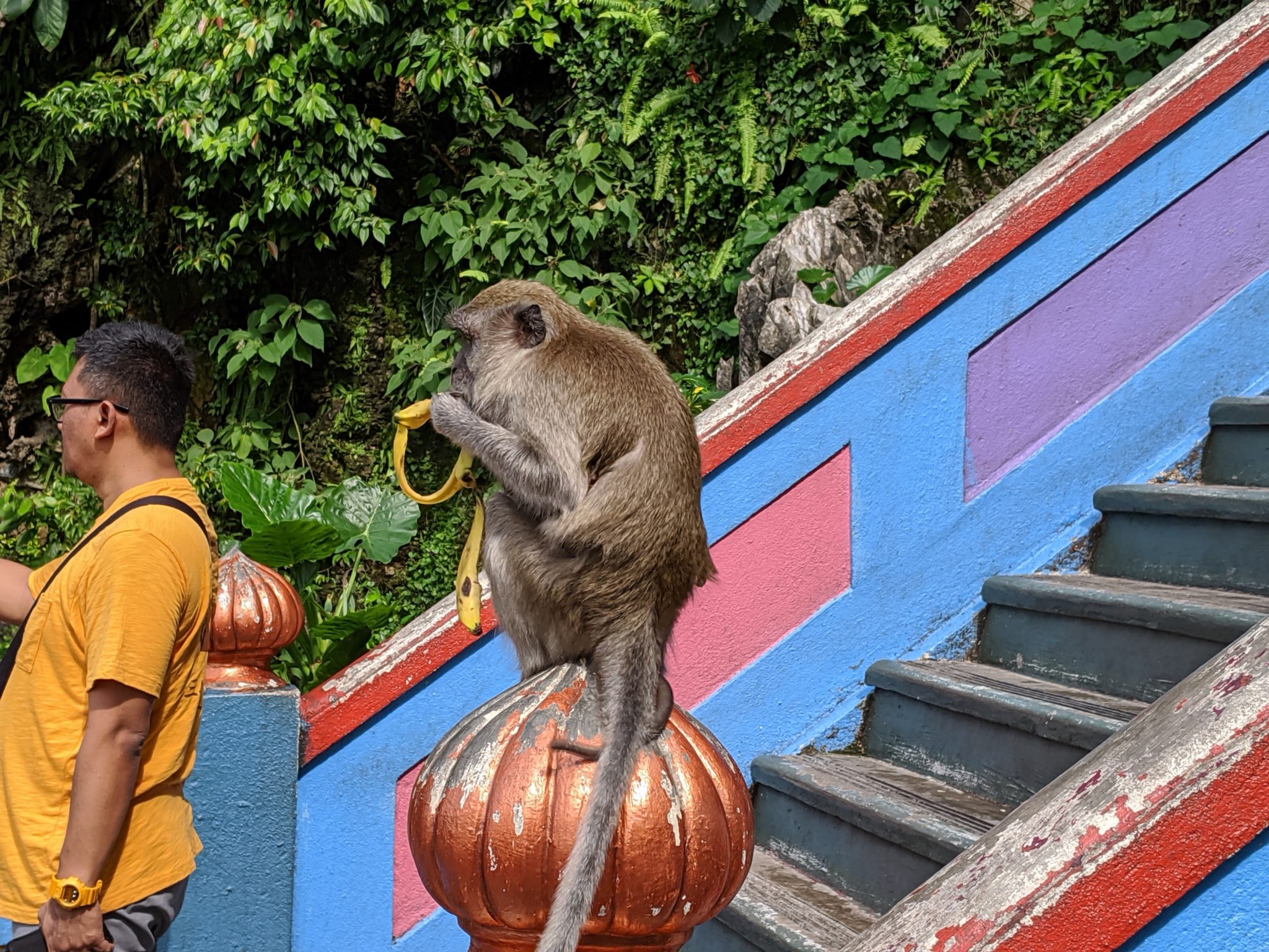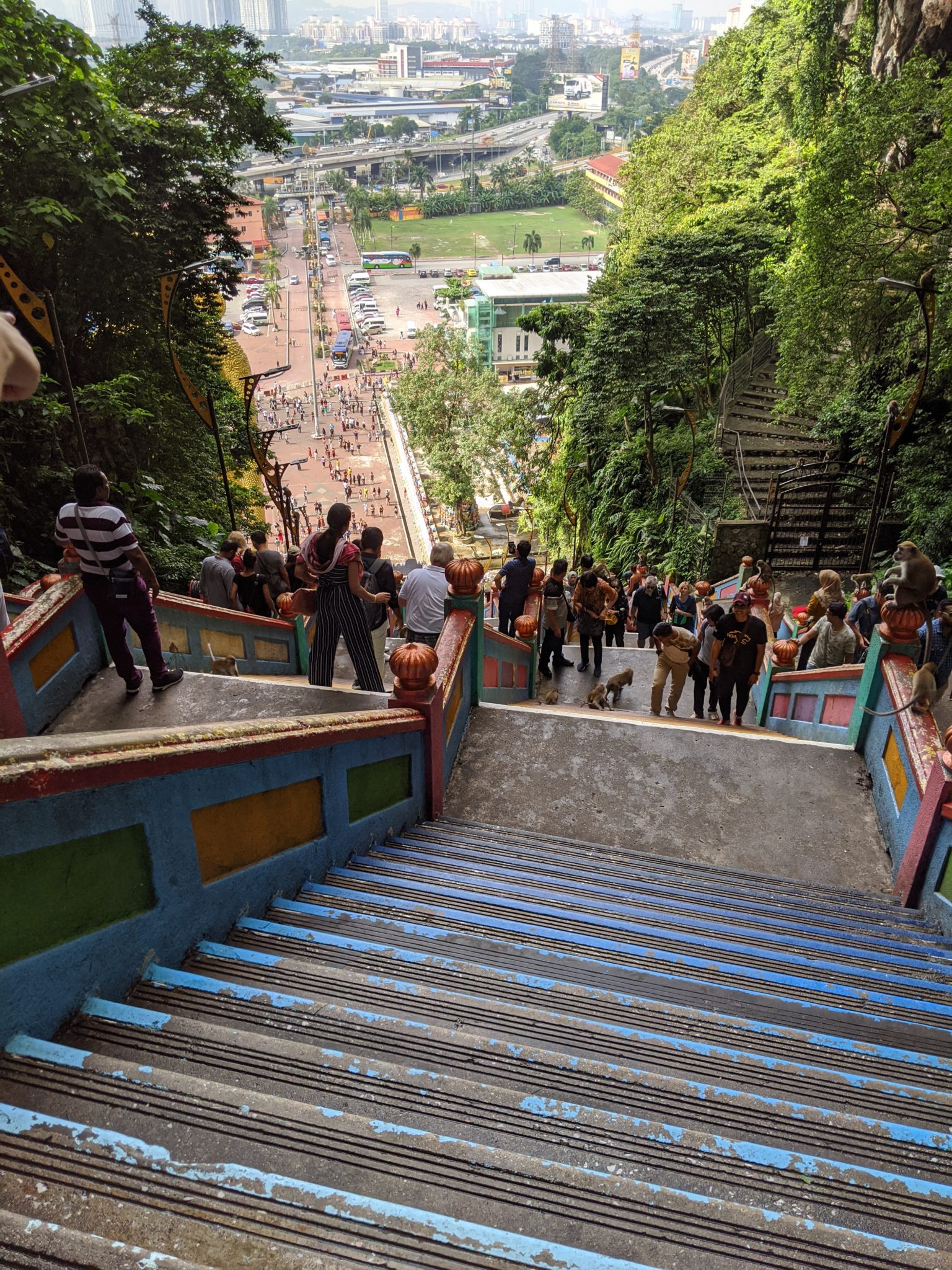 The temperatures in Kuala Lumpur isn’t all that different from Bangkok and in some cases more humid. After going up a few stairs, I already know this is going to be a sweaty affair! The stairs do look a bit daunting at first glance. And while I’m no athlete, its not super difficult to get up as long as you pace yourself. The combination of the stairs, heat and humidity can offer a bit of a challenge. Thankfully, I make a few stops to admire the colourful array of stairs, the playful monkeys darting around or take a few moments to look backwards at the view. If you are going to tackle these, I would suggest bringing water. On a hot day it can be taxing and I did notice a few having to move off the side in some rough shape.