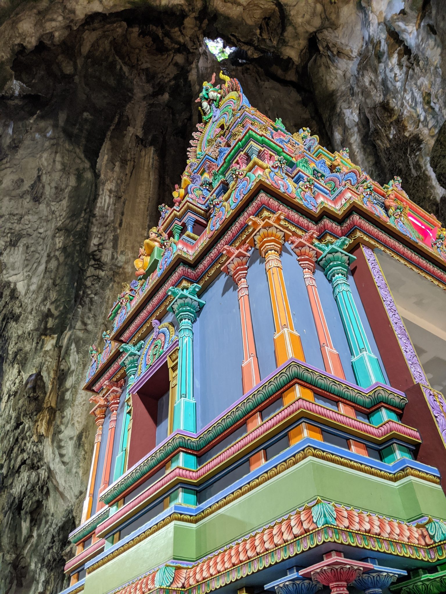 Once at the top, the stairs open up to this massive cave complex. I’m amazed to see that inside of the cave a pretty elaborate temple that is just as colourful as the stairs themselves. I take a little time to wander through the cave and appreciate what it must have taken for the original builders of the temple to actually build it. At the far end of the cave is another set of stairs which leads to an open part of the cave. You can no longer go any further since the cave ends. But the top is open to the sky and its a neat inversion to the first cave.