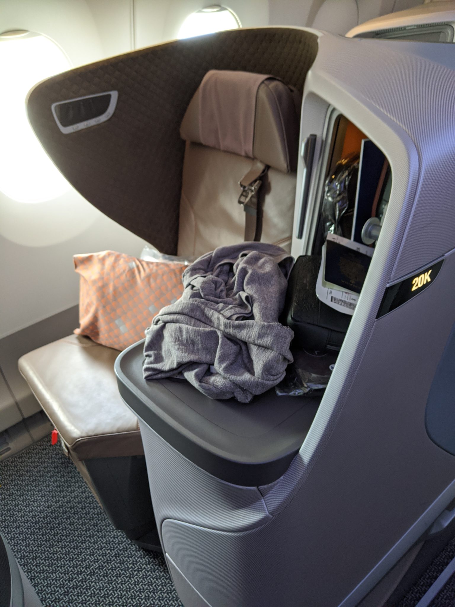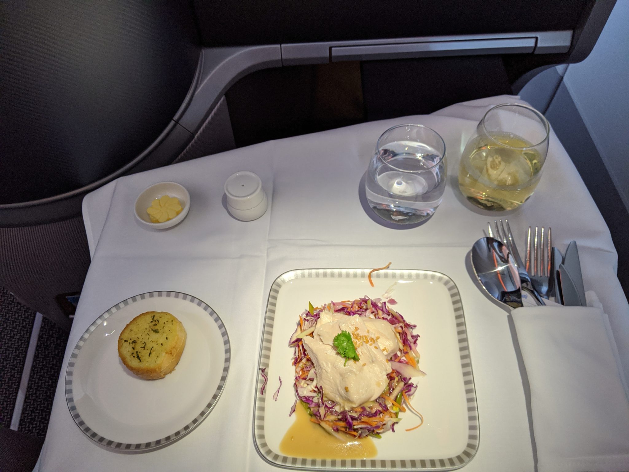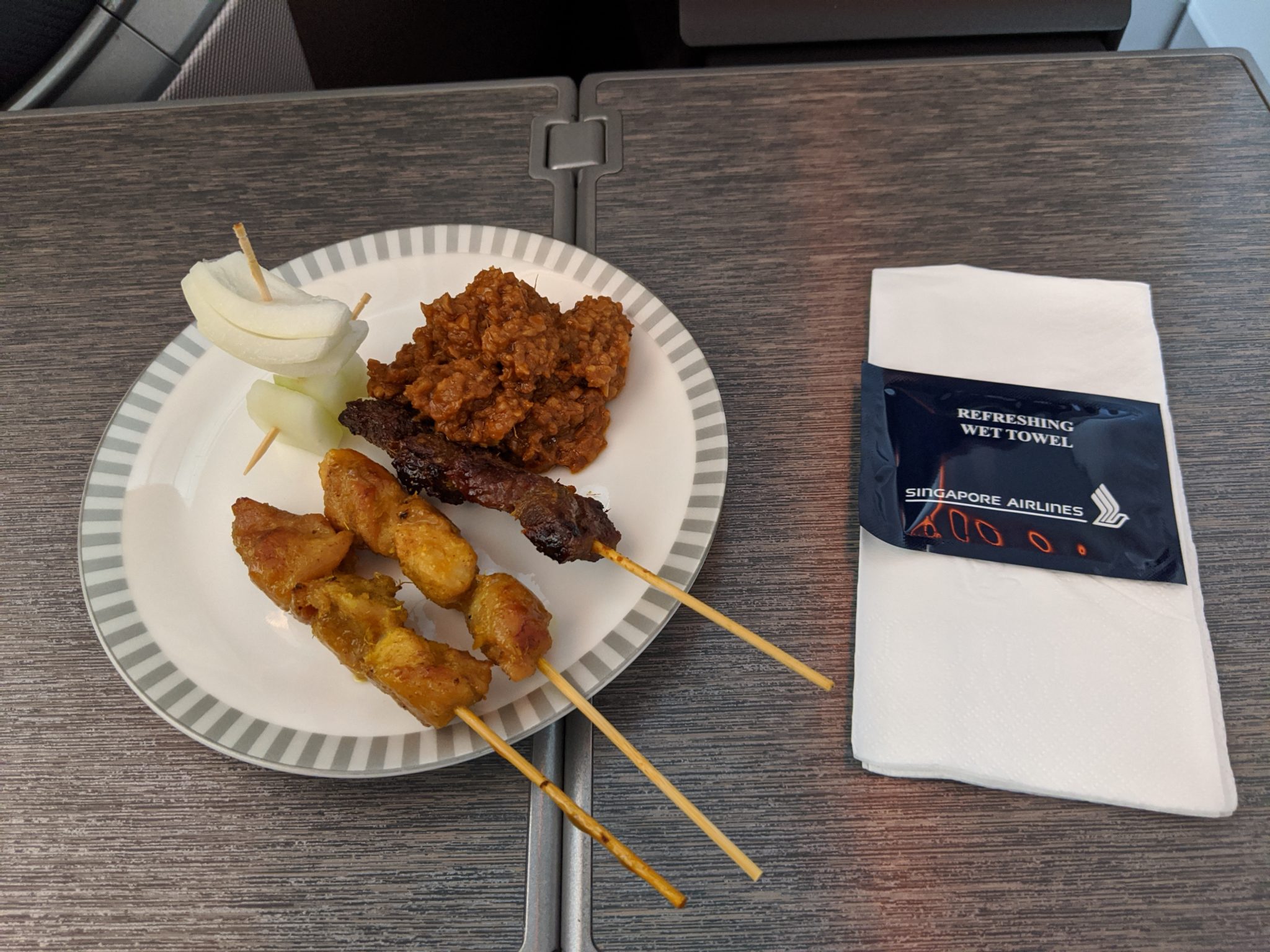 Soon after breakfast, it was time to fly! I walked to my gate, boarded, and settled into my seat to Perth. This is one of my more anticipated flights because it’s a longer light on a newer Singapore Airlines A350 Business class product. To my surprise, the seat is actually the same as the one that I flew into Singapore and is just as comfortable. The signature Singapore Airlines service is always great and this flight is no different. Lunch is served on this flight and the food is spectacular! It started with chicken and lamb satay and a poached chicken salad to start. For the entree I chose a coconut poached fish. Meanwhile dessert is Hagen Daz cookies and cream ice cream.