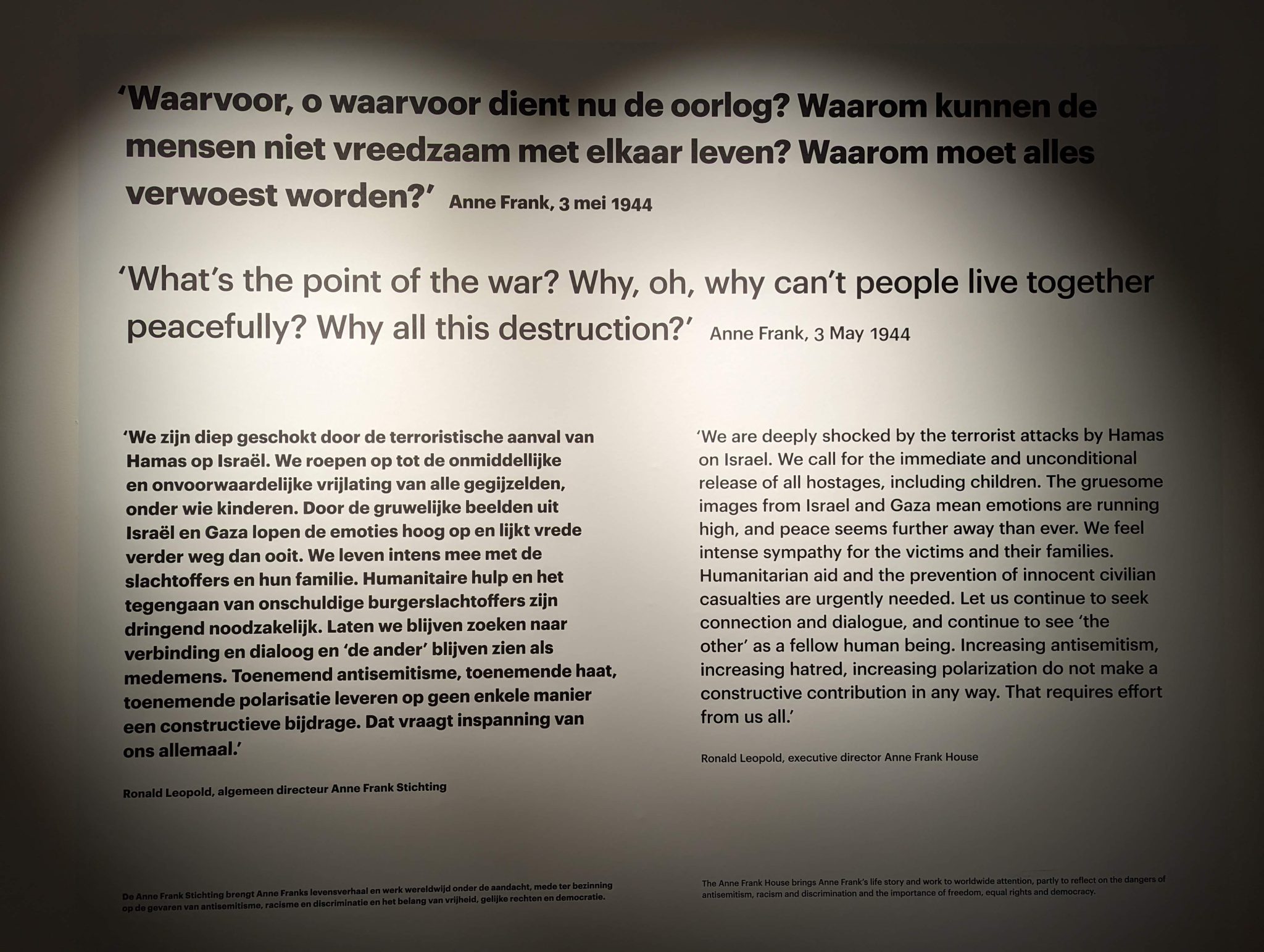 Ann Frank”s question: “Why is there war? Why can’t people live together peacefully? Why all this destruction?” A very relevant question particularly for today.