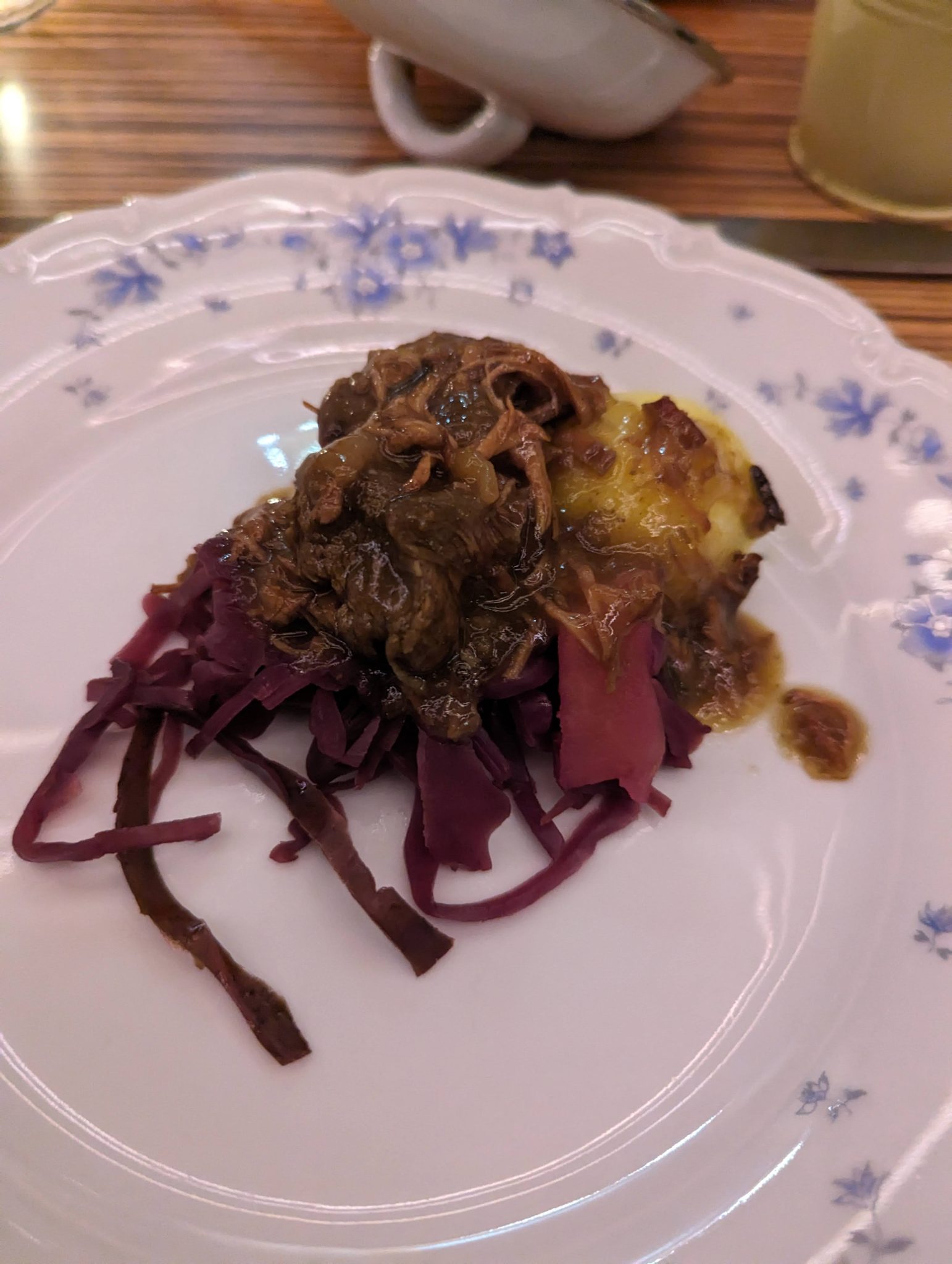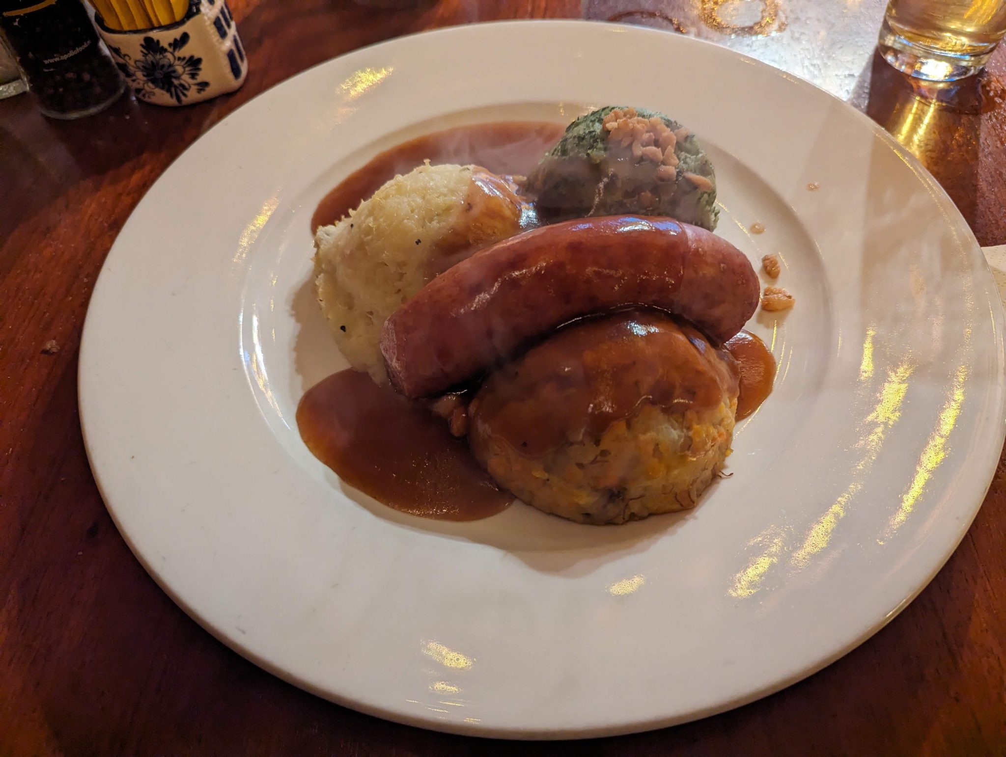 However what I do have a photo of is another local dish called stamppot. This is a mash of different vegetables with a smoked sausage. In my case there were three versions of mash, potatoes with carrots and onions, potatoes with sauerkraut and potatoes with kale. Given that it is a cold day, both comfort dishes really hit the spot!