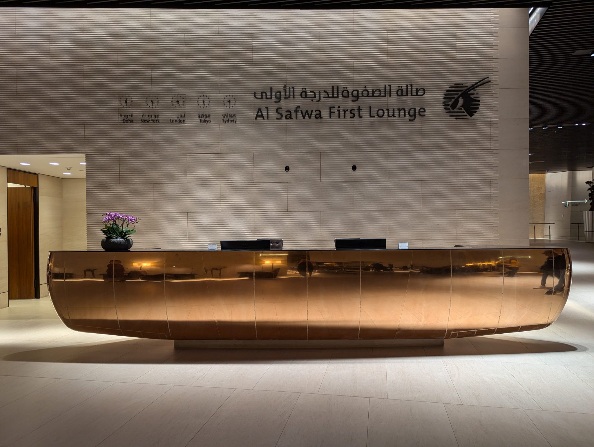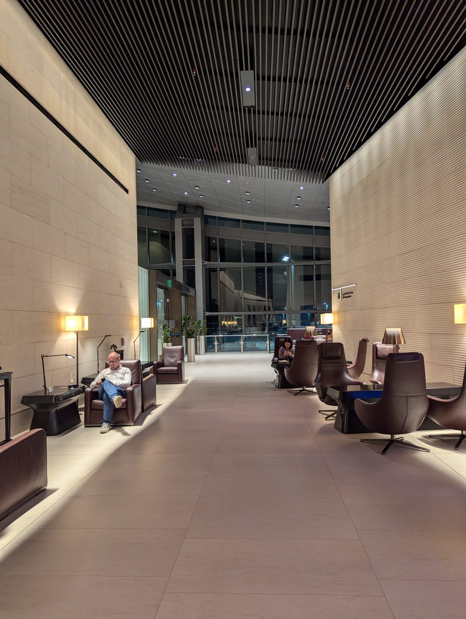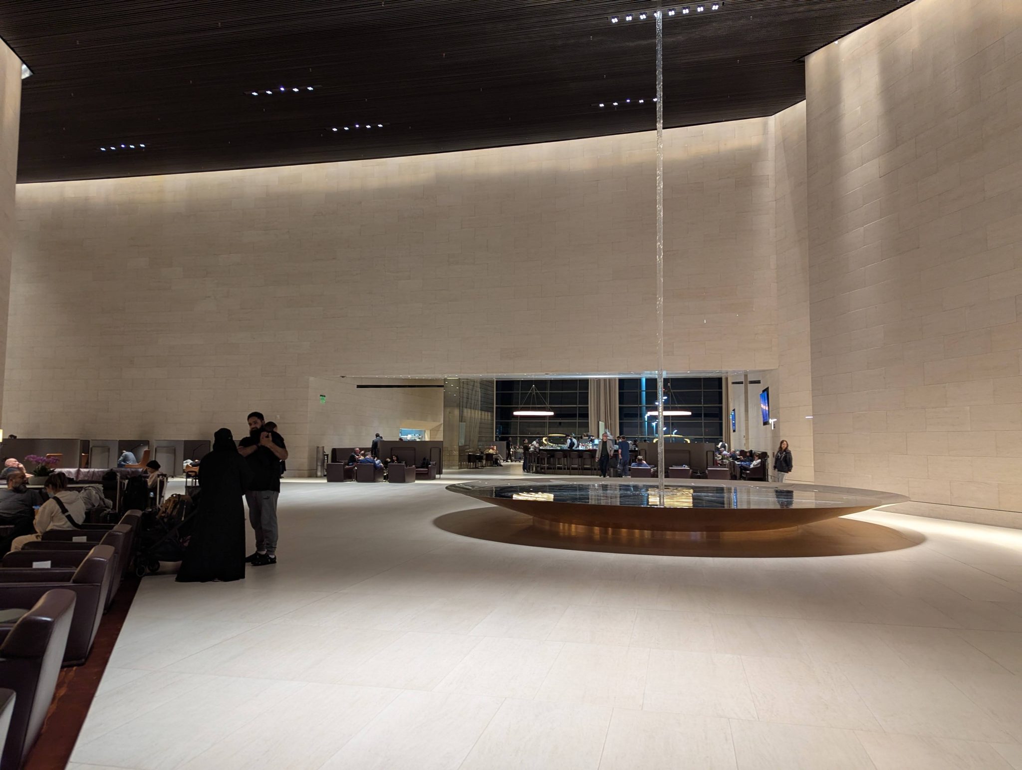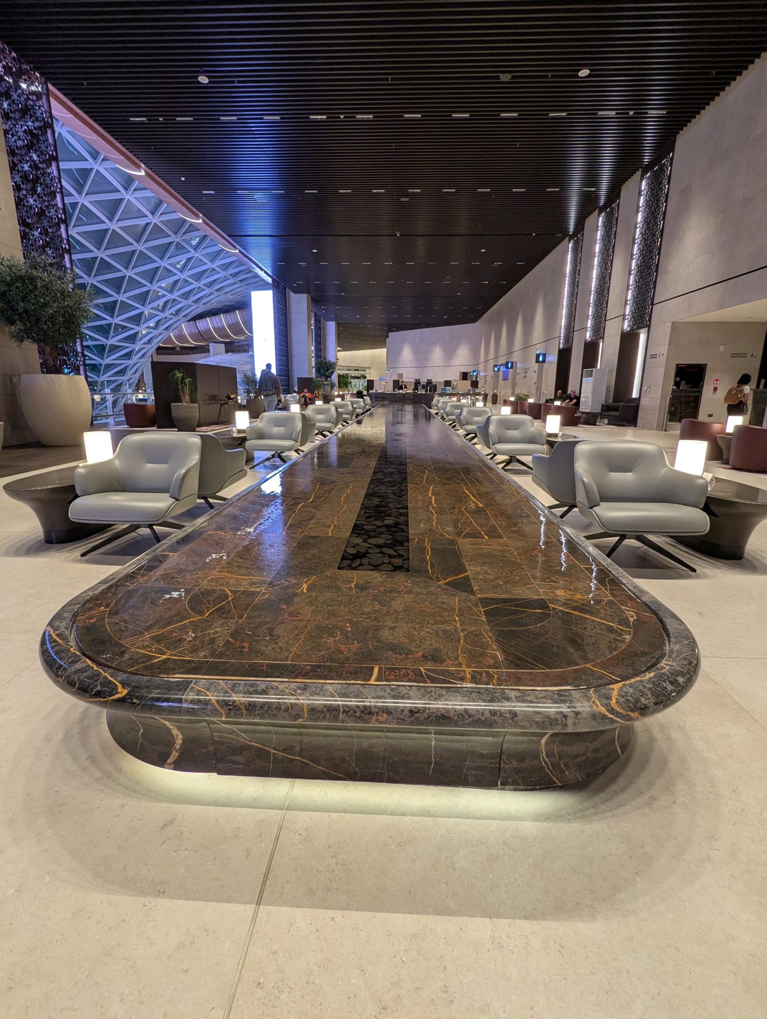 Next we make our way to the Al Safwa First Lounge. The vibe here is very different to the business lounge. I think the best way I can describe it is its much more sterile and serene. It’s very quiet and very cavernous. It almost feels like a museum in some cases but still very fancy. We spend some time exploring this massive lounge before settling down to rest a little.