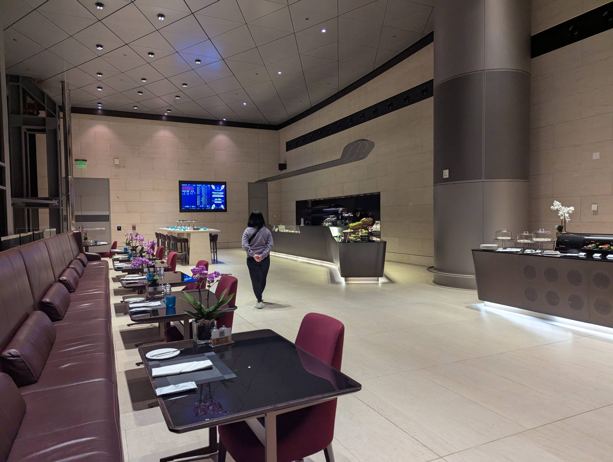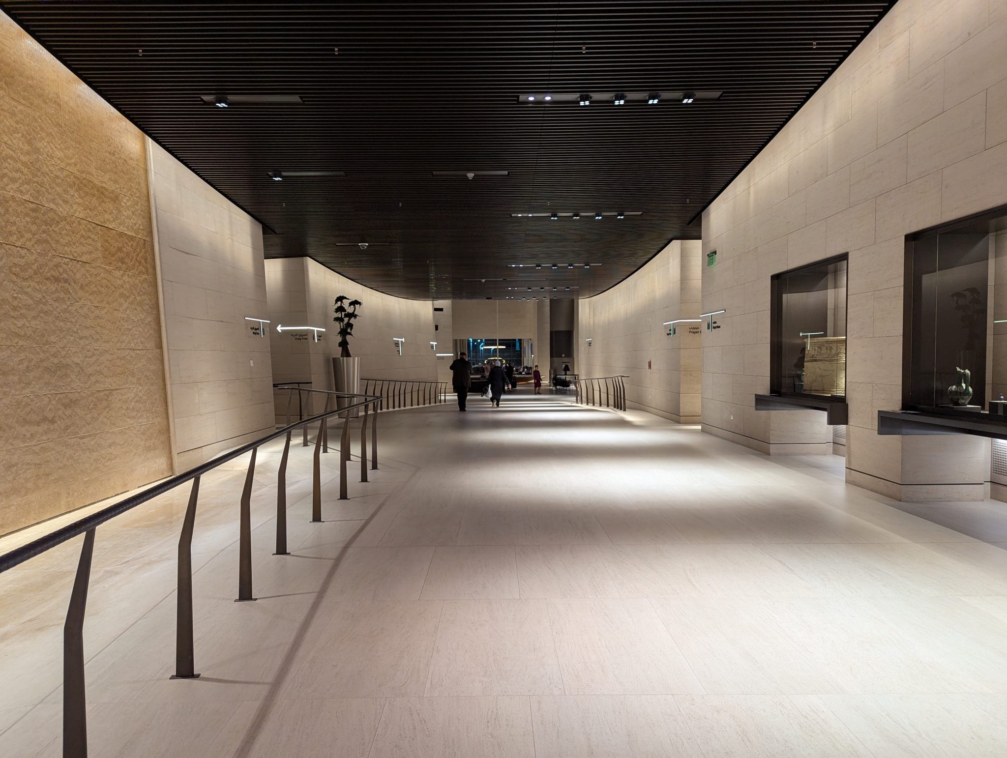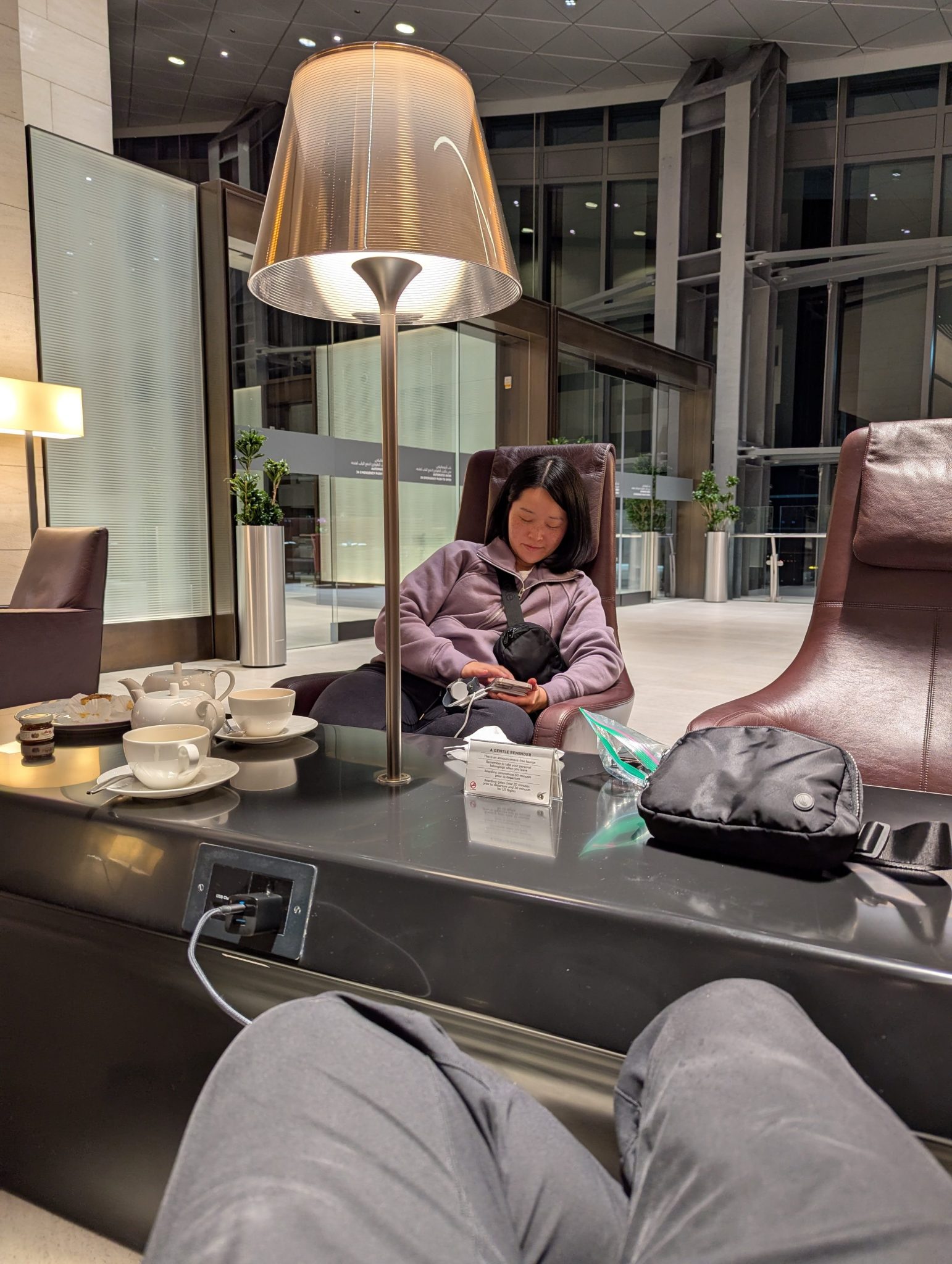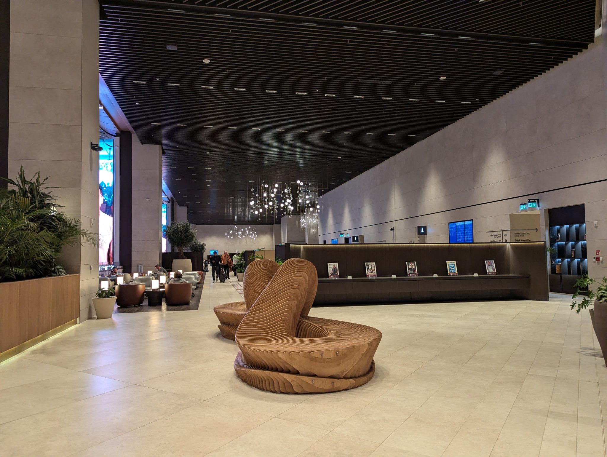 Next we make our way to the Al Safwa First Lounge. The vibe here is very different to the business lounge. I think the best way I can describe it is its much more sterile and serene. It’s very quiet and very cavernous. It almost feels like a museum in some cases but still very fancy. We spend some time exploring this massive lounge before settling down to rest a little.