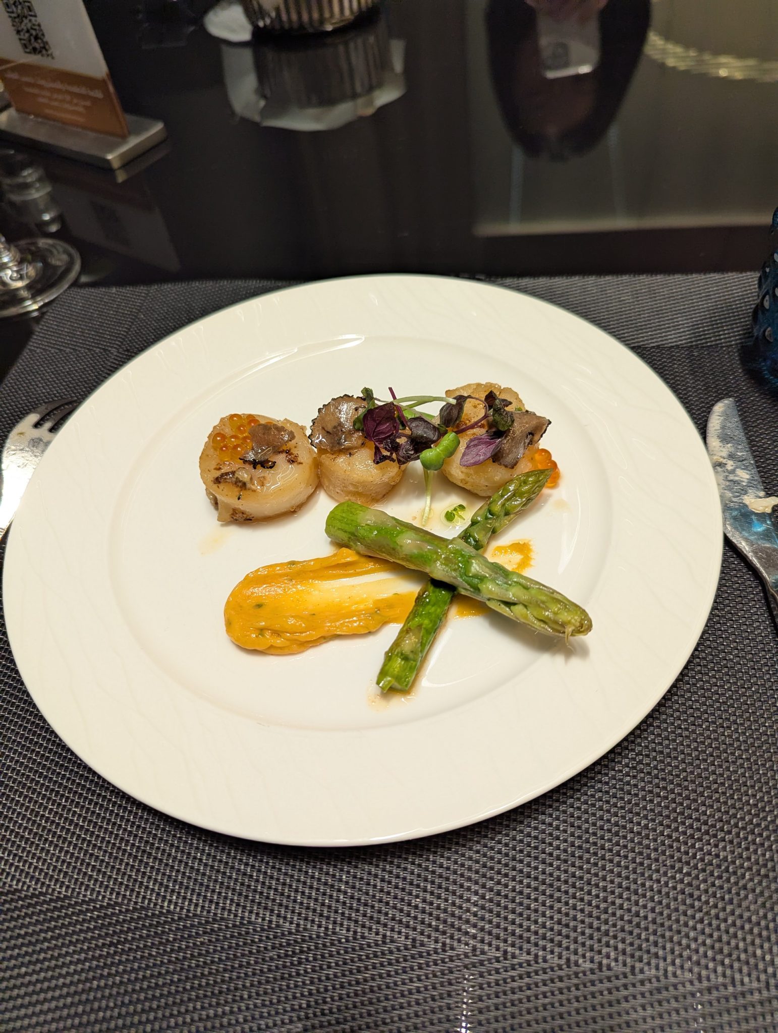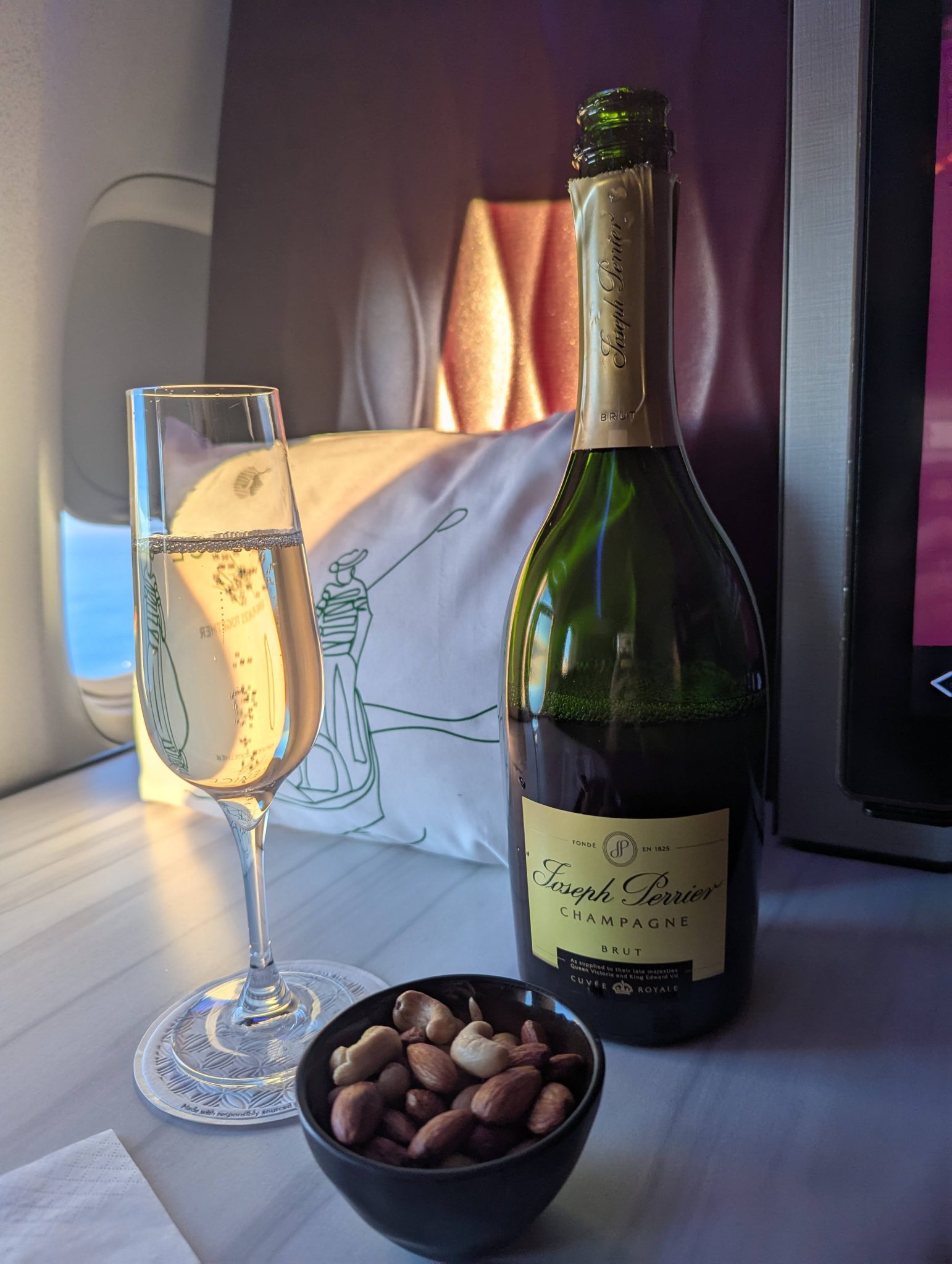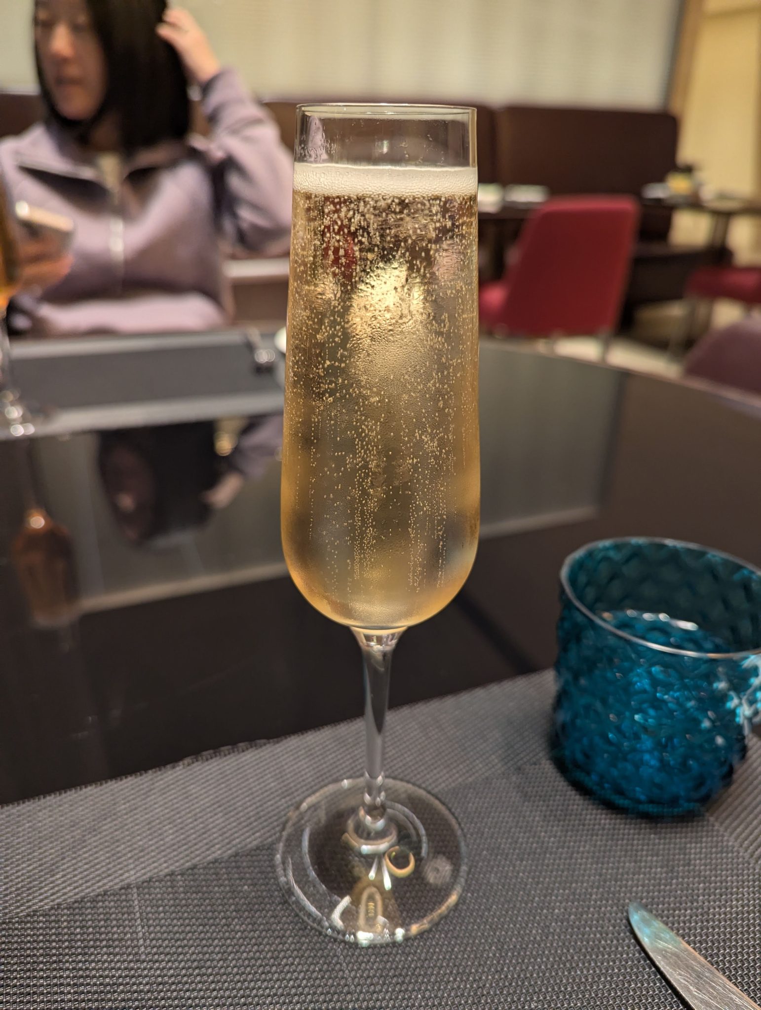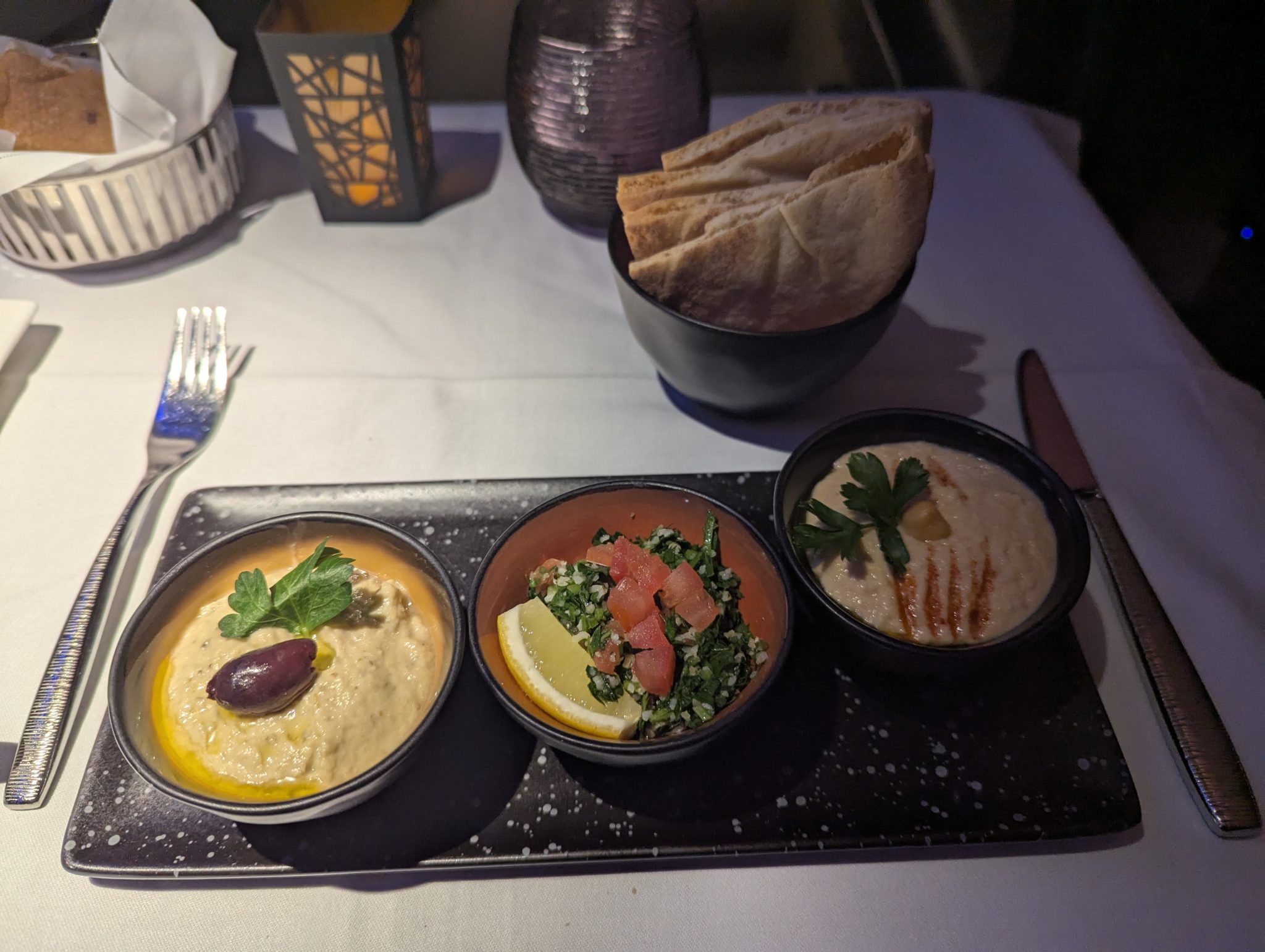 One of the cool features of this lounge is the a la carte dining option. They have some fairly high end dining options which the Sister and I decide to indulge in. For drinks I opt for a watermelon cooler (how could I not!) and a Lanson brut. We get two appetizers in the Arabic mezze and Seared scallops. For my main I order the Sea bass. All the food is actually really good! In fact we liked the scallops so much we end up ordering it again, so have two helpings of the scallops!