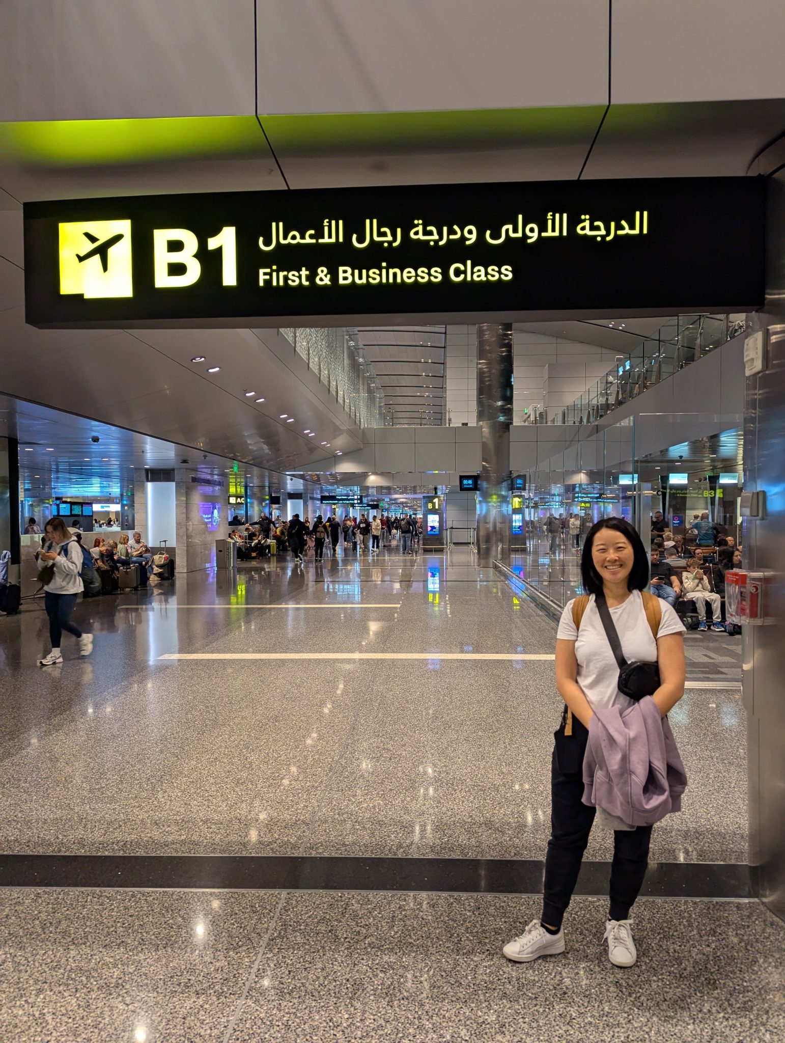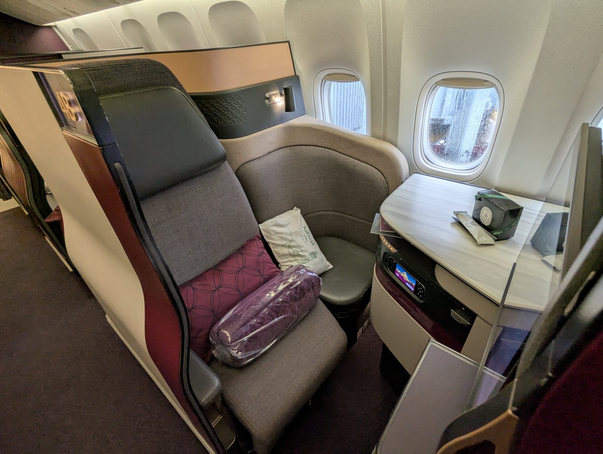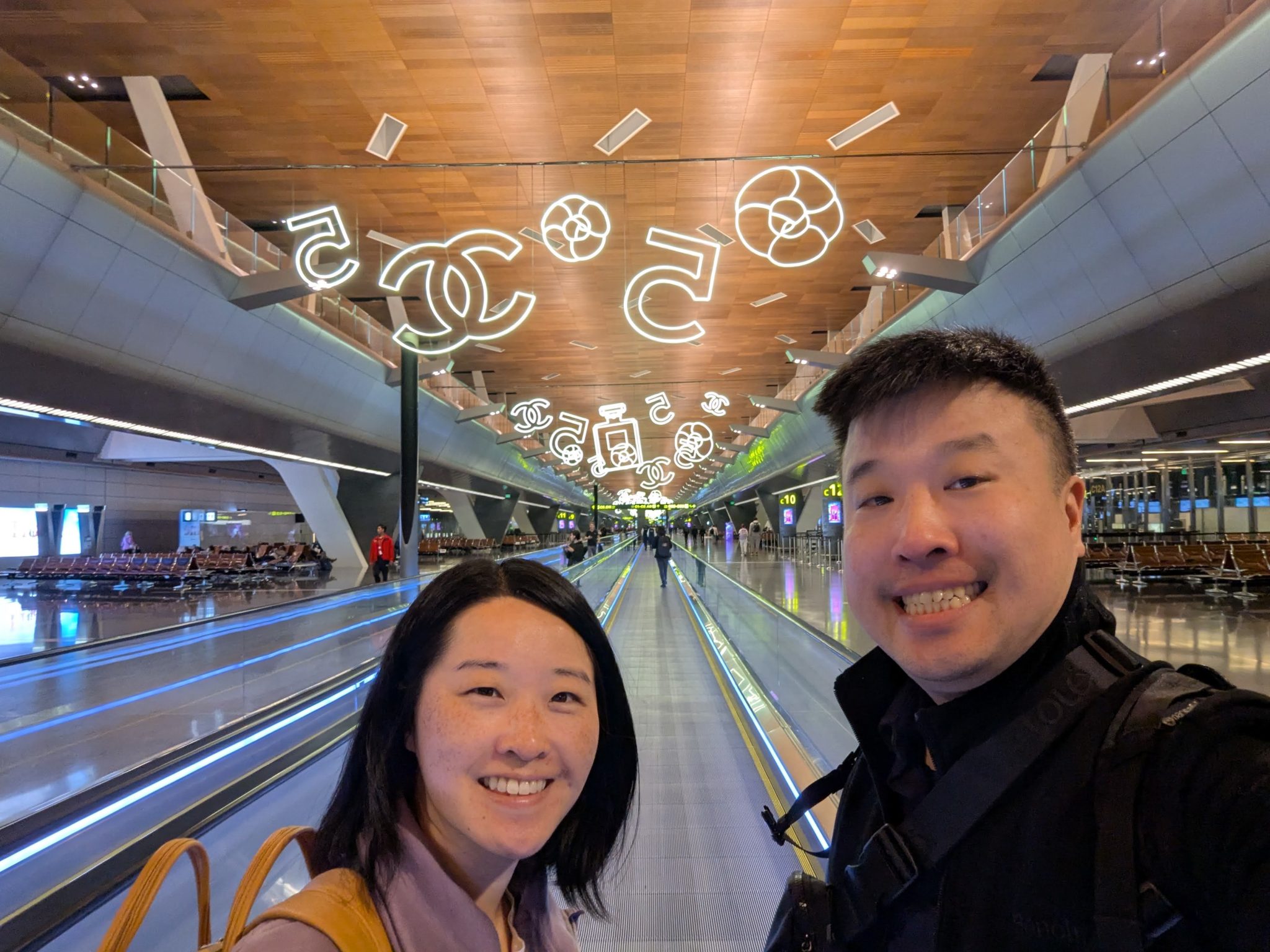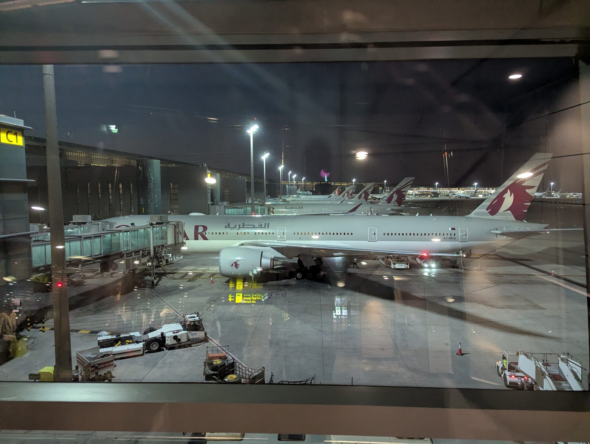 Another cool thing about Qatar airways is they are an official sponsor of Formula 1. And so the provided pajamas have formula 1 livery on it which is pretty cool for a fan like me! The Qsuite bed is also quite nice and private with the addition of a door. This allows your “pod” to be completely closed off. I did catch a few hours of sleep here and there. Even though the pods are comfortable, I find that as I get older, it gets harder and harder to sleep on airplanes. Regardless it’s still an excellent way to get to the other side of the world and am very happy to get to do it! And after a smooth journey across the Atlantic we touch down in Hamad International Airport in Doha!