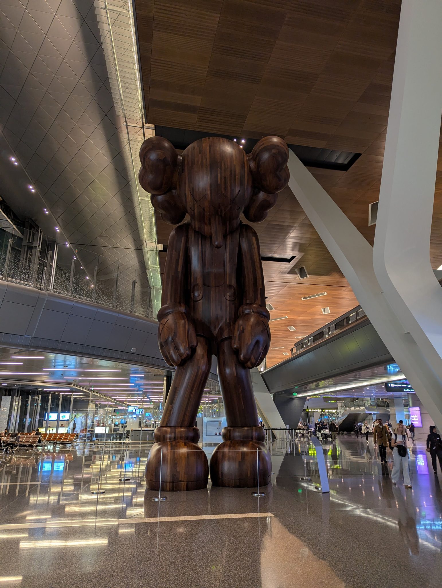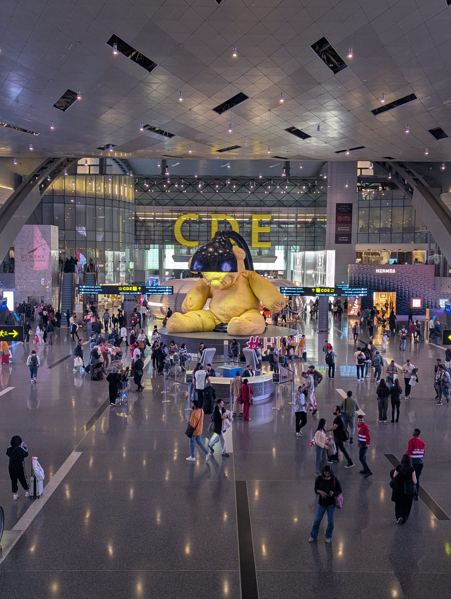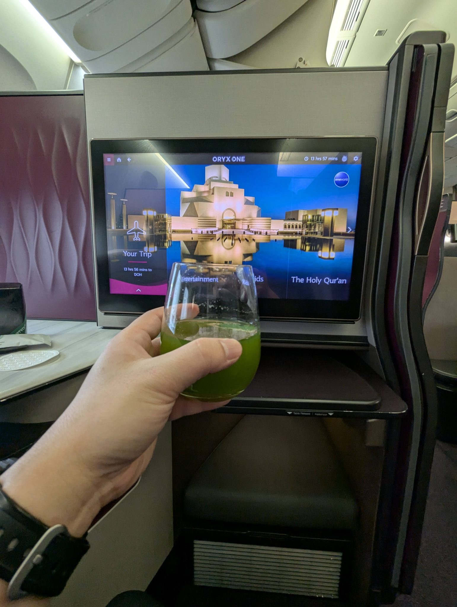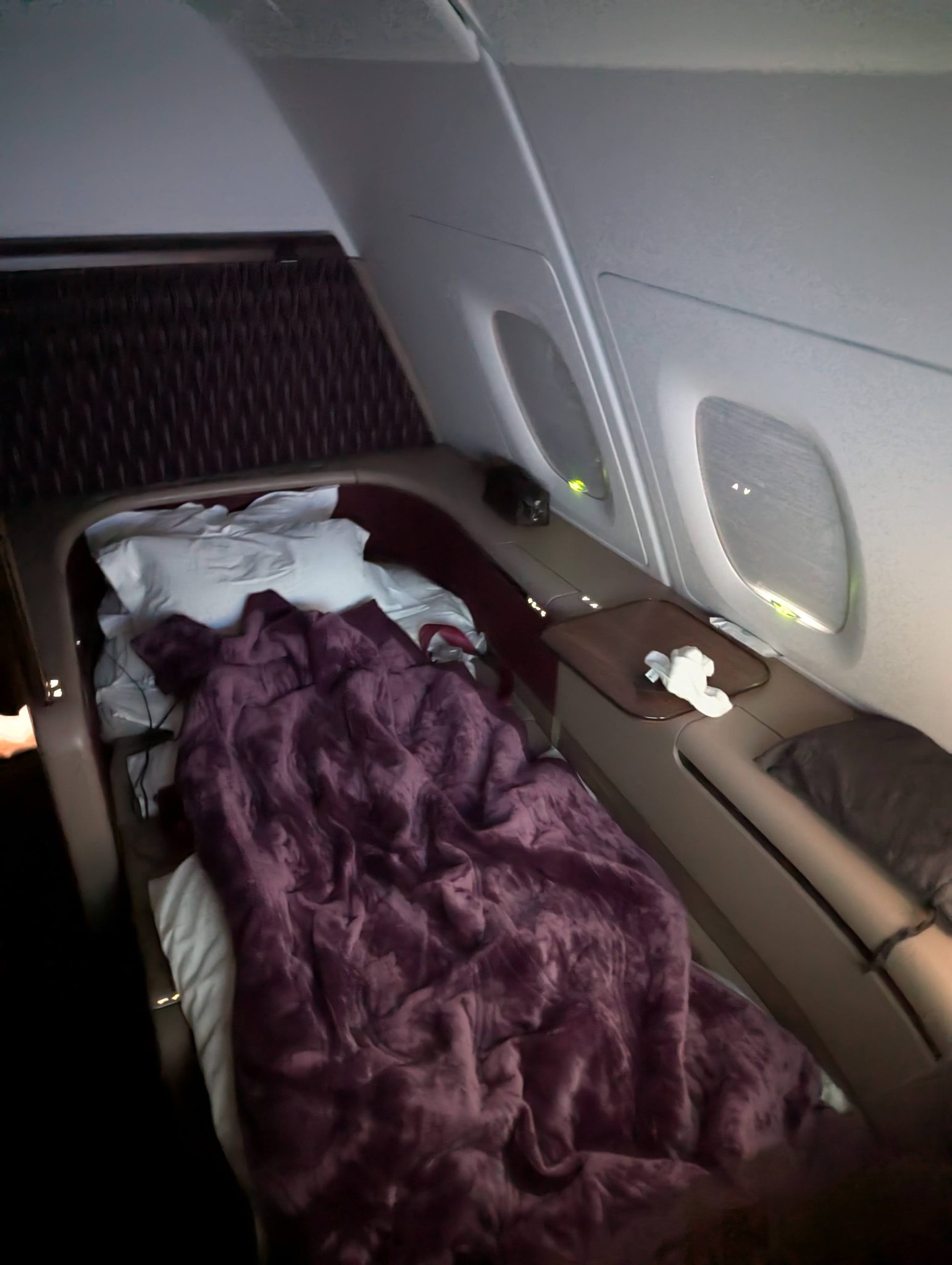Another cool thing about Qatar airways is they are an official sponsor of Formula 1. And so the provided pajamas have formula 1 livery on it which is pretty cool for a fan like me! The Qsuite bed is also quite nice and private with the addition of a door. This allows your “pod” to be completely closed off. I did catch a few hours of sleep here and there. Even though the pods are comfortable, I find that as I get older, it gets harder and harder to sleep on airplanes. Regardless it’s still an excellent way to get to the other side of the world and am very happy to get to do it! And after a smooth journey across the Atlantic we touch down in Hamad International Airport in Doha!