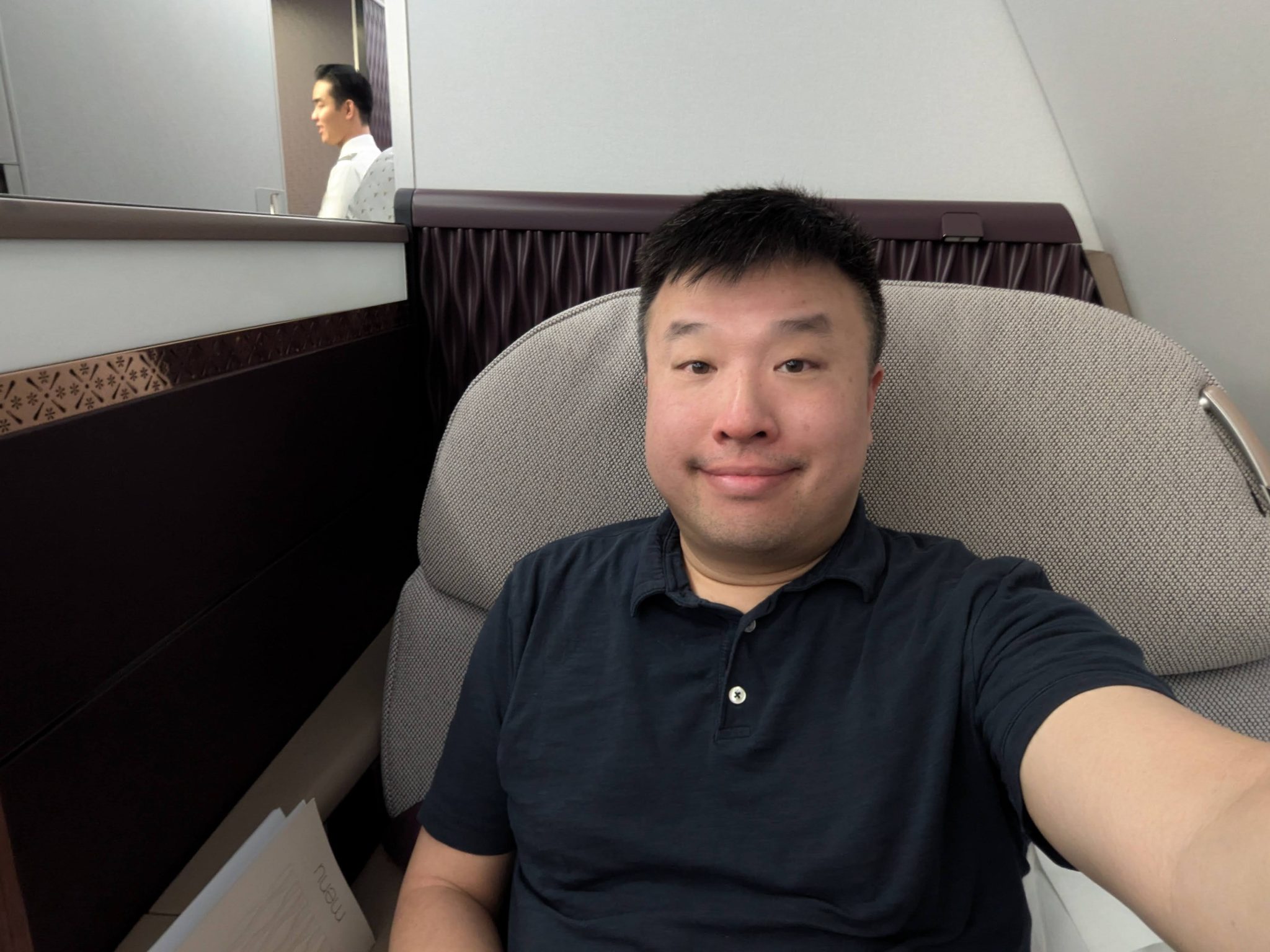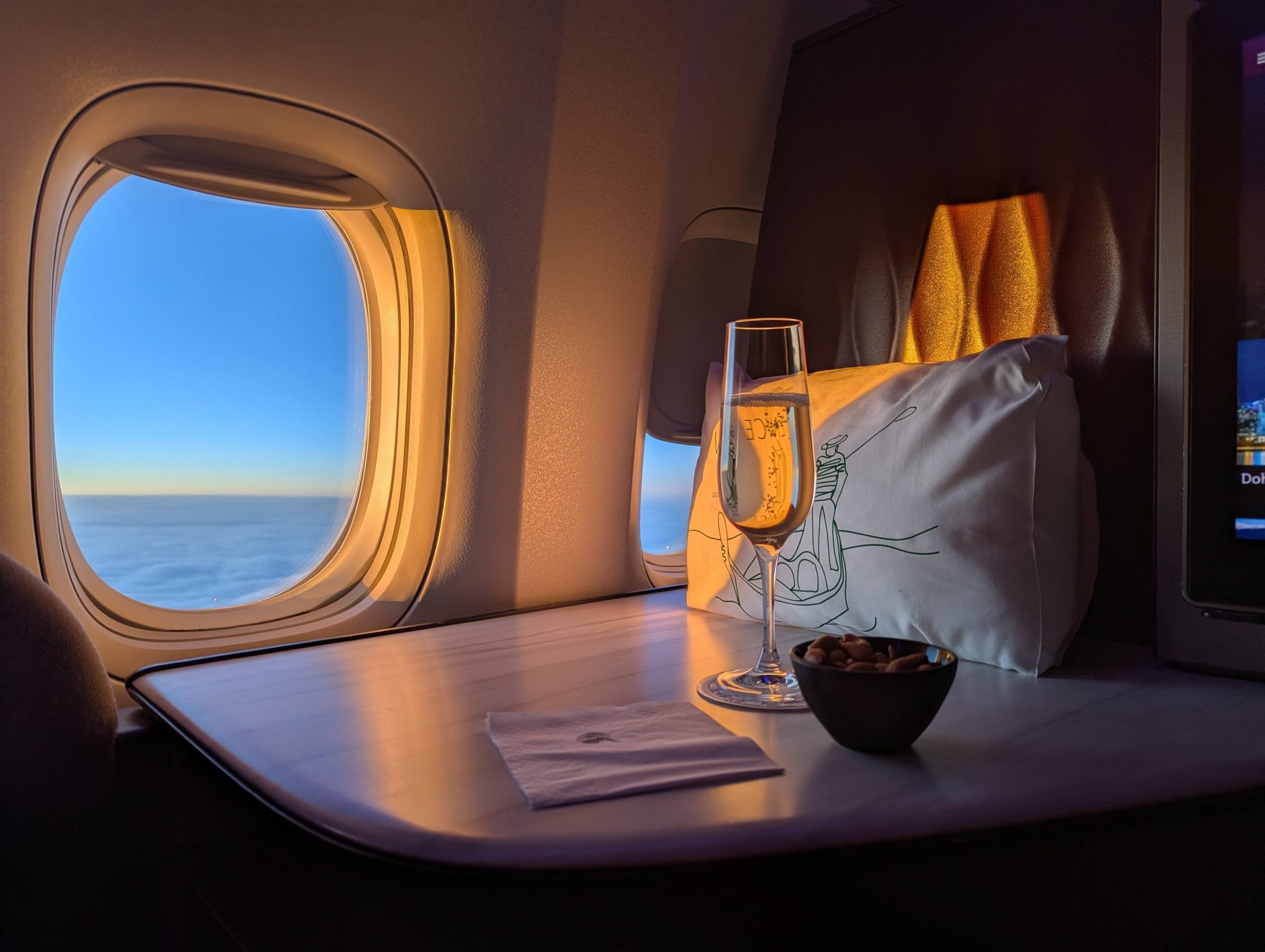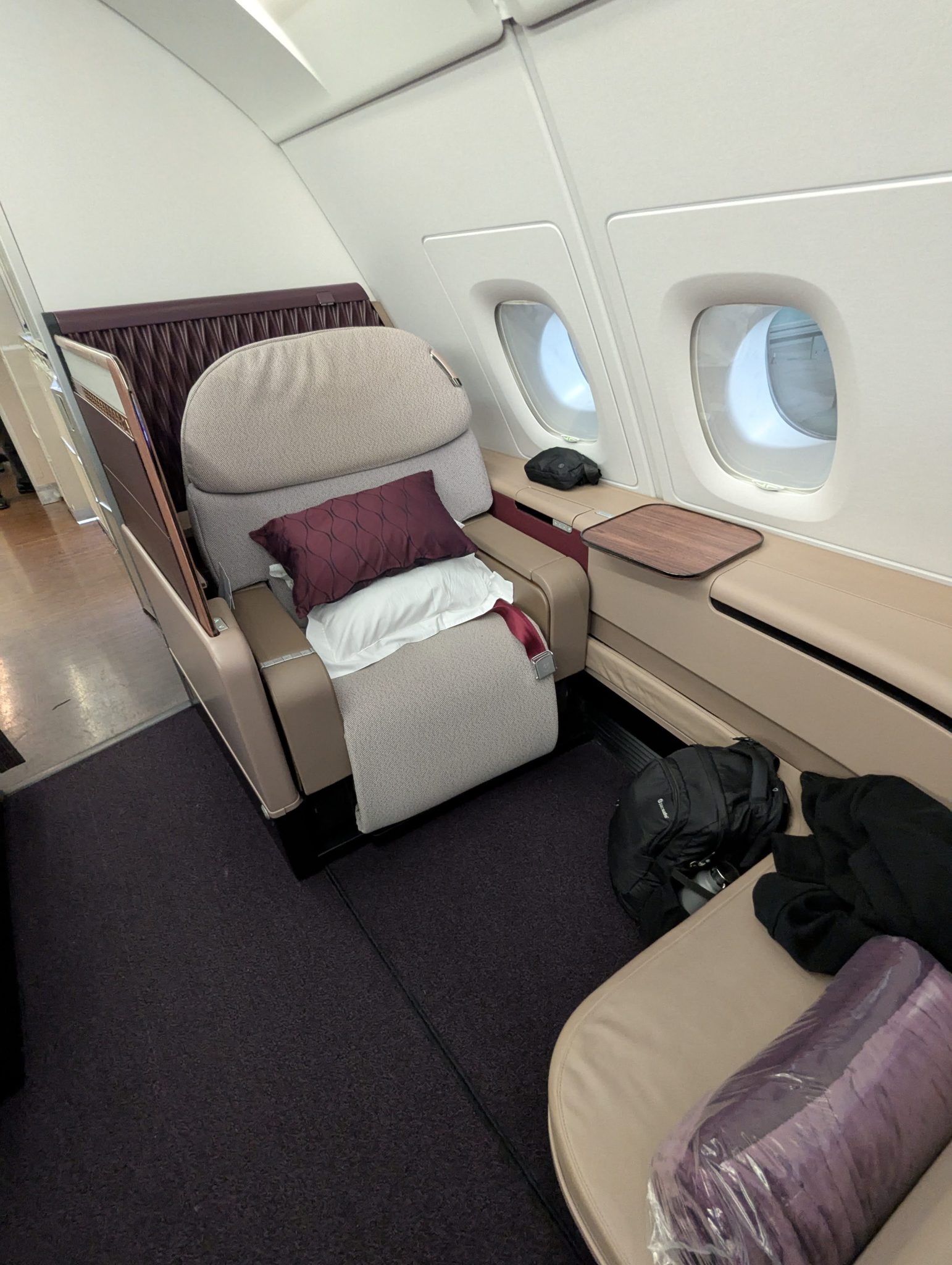 Eventually its time for us to take our next flight to Bangkok. So we head to the gate and get ready to board. The Qatar First class product is a little bit older than the Qsuite product we flew over from Seattle on. But it’s still very exclusive as there is only 8 seats in the cabin. As this is on one of their A380 double decker planes, we also get the unique ability to board from a separate jet bridge that takes us directly to the second floor and to our seats.