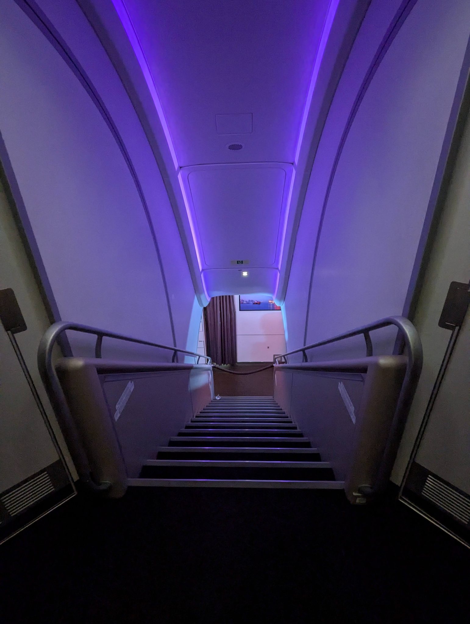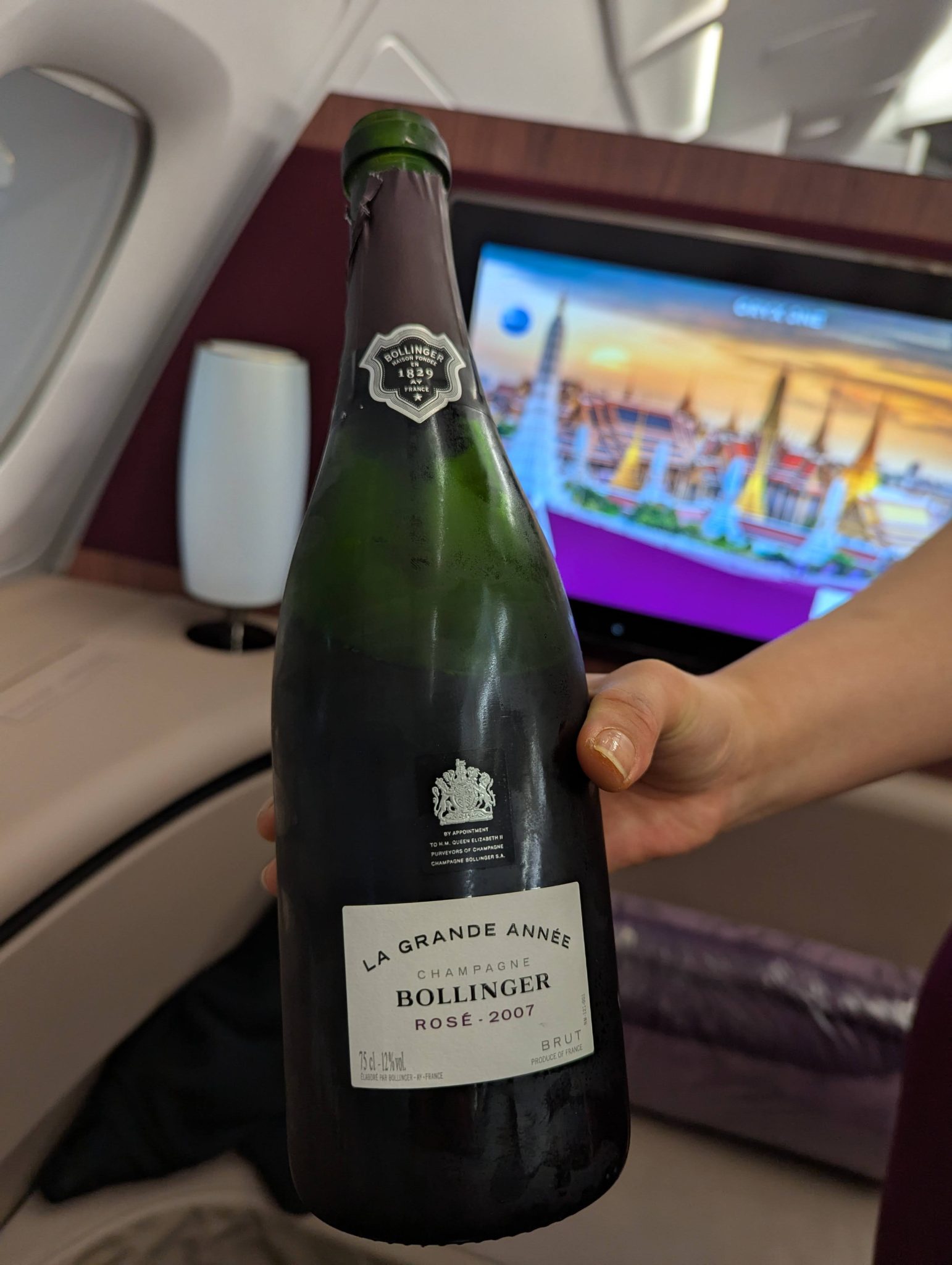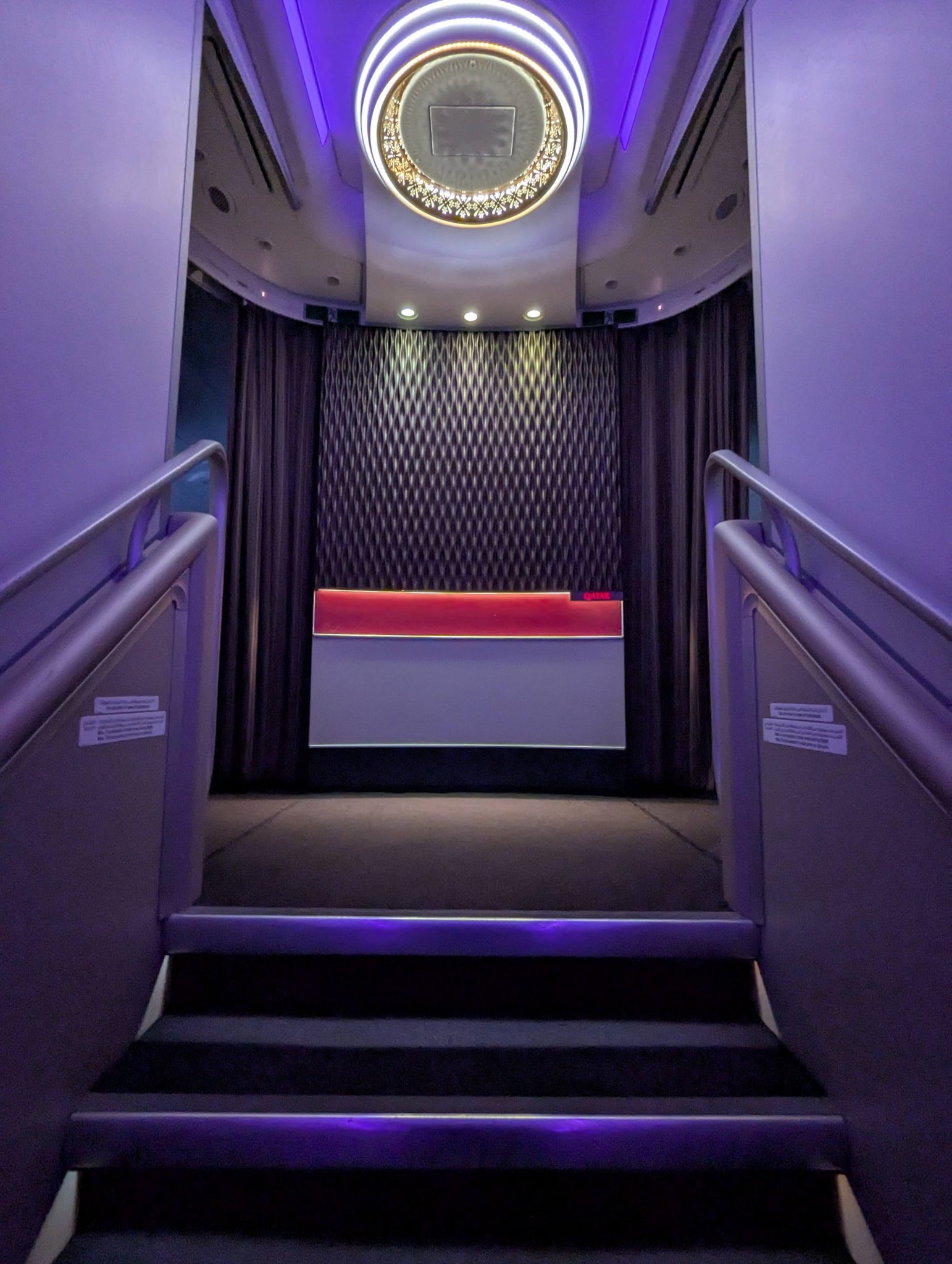 Eventually its time for us to take our next flight to Bangkok. So we head to the gate and get ready to board. The Qatar First class product is a little bit older than the Qsuite product we flew over from Seattle on. But it’s still very exclusive as there is only 8 seats in the cabin. As this is on one of their A380 double decker planes, we also get the unique ability to board from a separate jet bridge that takes us directly to the second floor and to our seats.