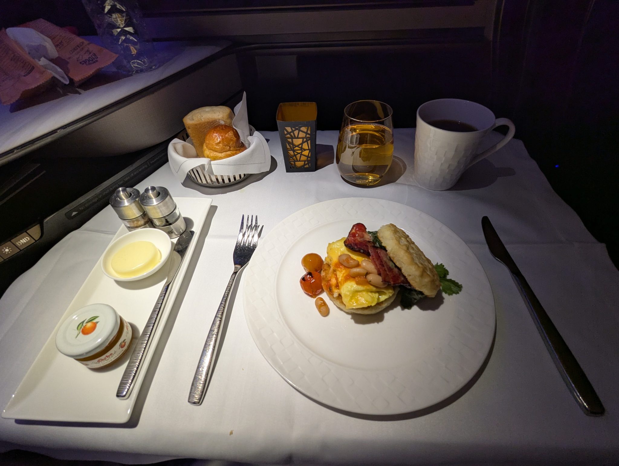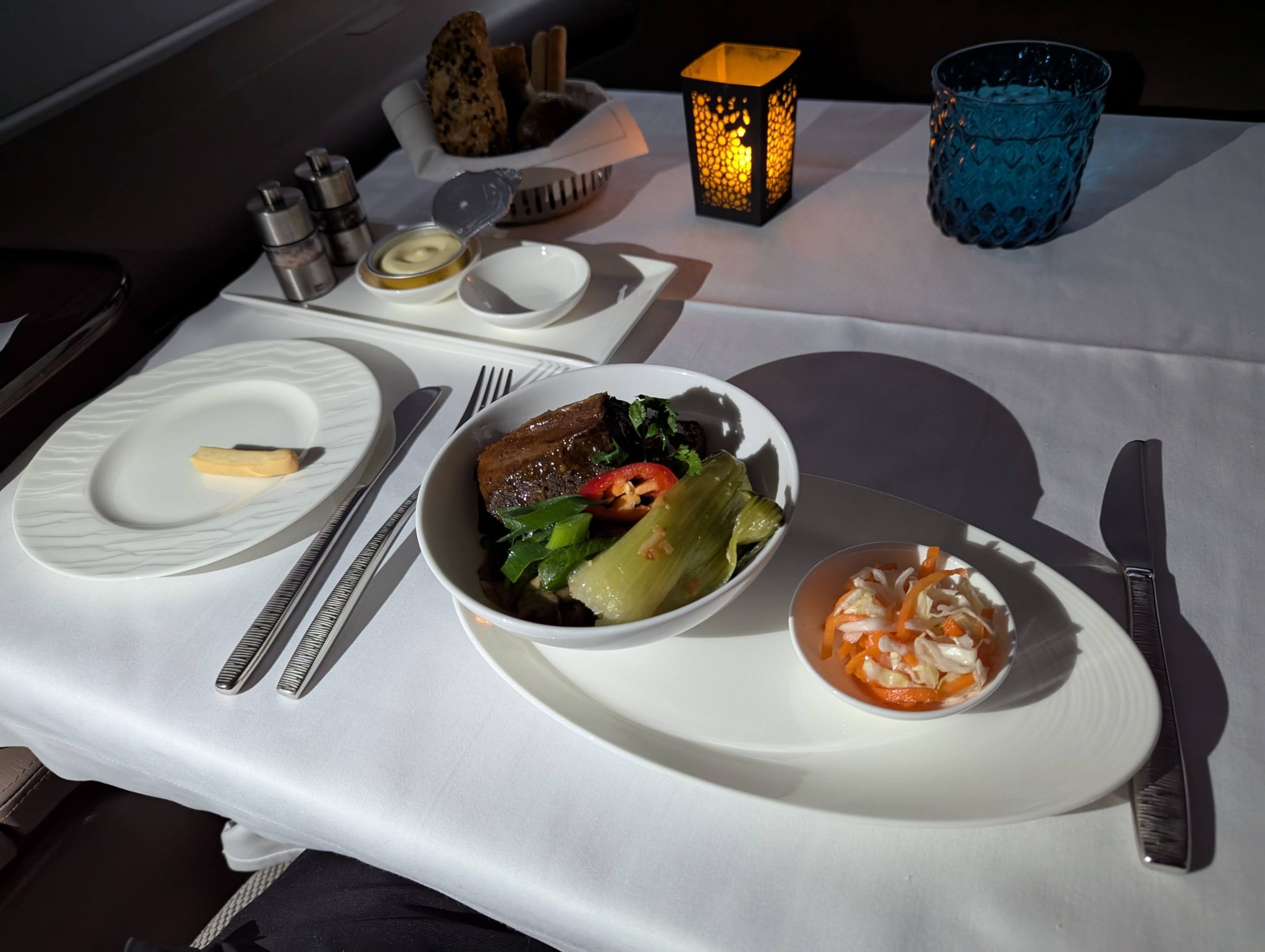 It’s roughly a 14 hour flight from Seattle to Doha and after reaching cruising the crew starts their dinner service. You can’t go wrong with some fine dining in the air. I will say though that while the food is pretty good. The choices felt a bit limited. Especially near the latter half of the trip they started running out of options and for a fourteen hour flight you would hope that they would be better stocked. Perhaps its because they are departing from an outstation rather from their home base, but it is something I noticed when a few of my choices were no longer available when I asked for them.