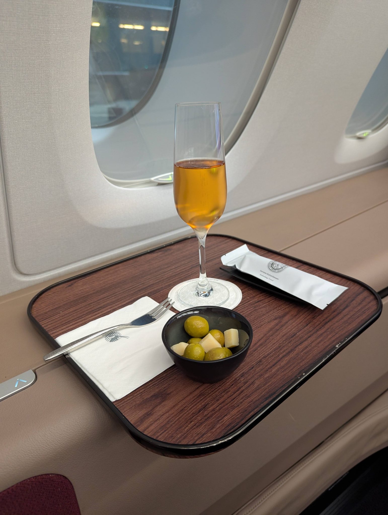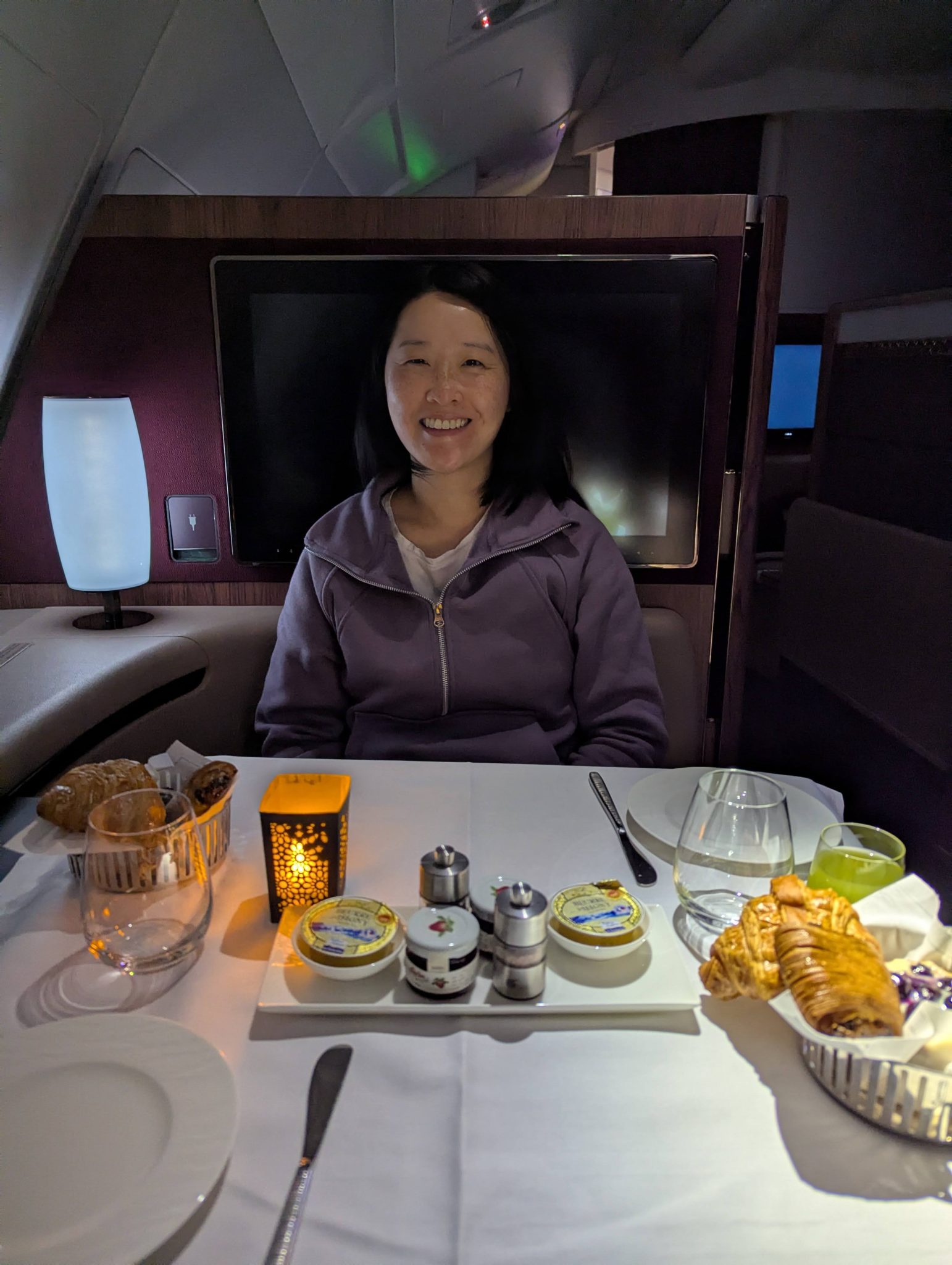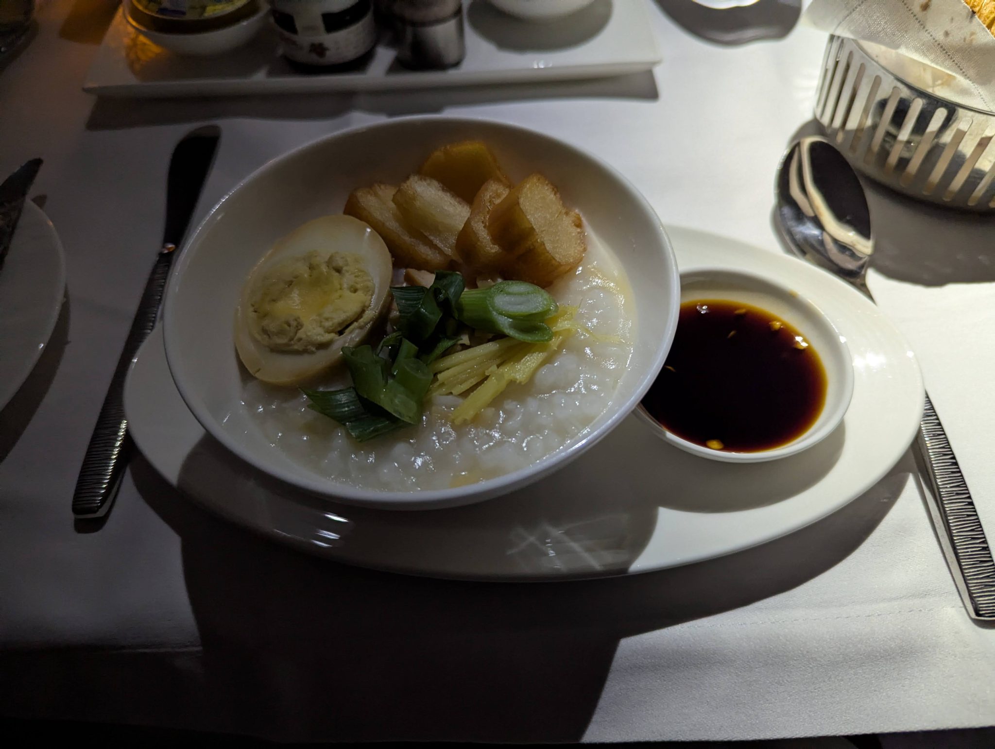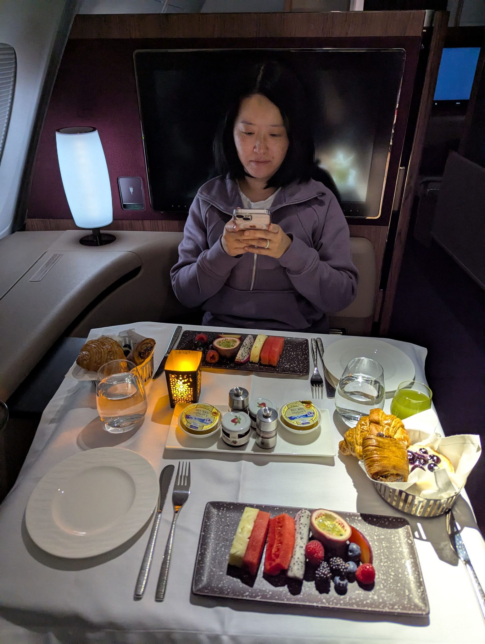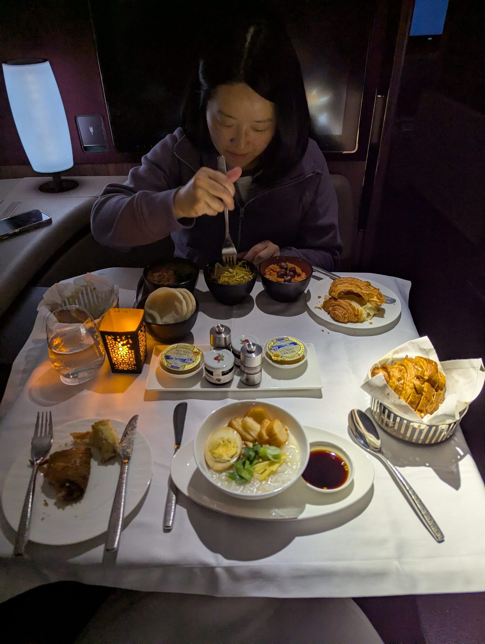 After getting a few hours of sleep the flight attendants wake us up for breakfast prior to landing. A unique feature to Qatar’s seats is the ability to have a meal with a companion. It’s something the Sister and I couldn’t pass up and so we end up having breakfast “together” before landing. After all the rich food in the past day, I opt for some comfort food in an abalone congee and fruit. It’s good and tasty, that’s made even better by the novelty of sitting across from a travel companion having a meal together while in the air!