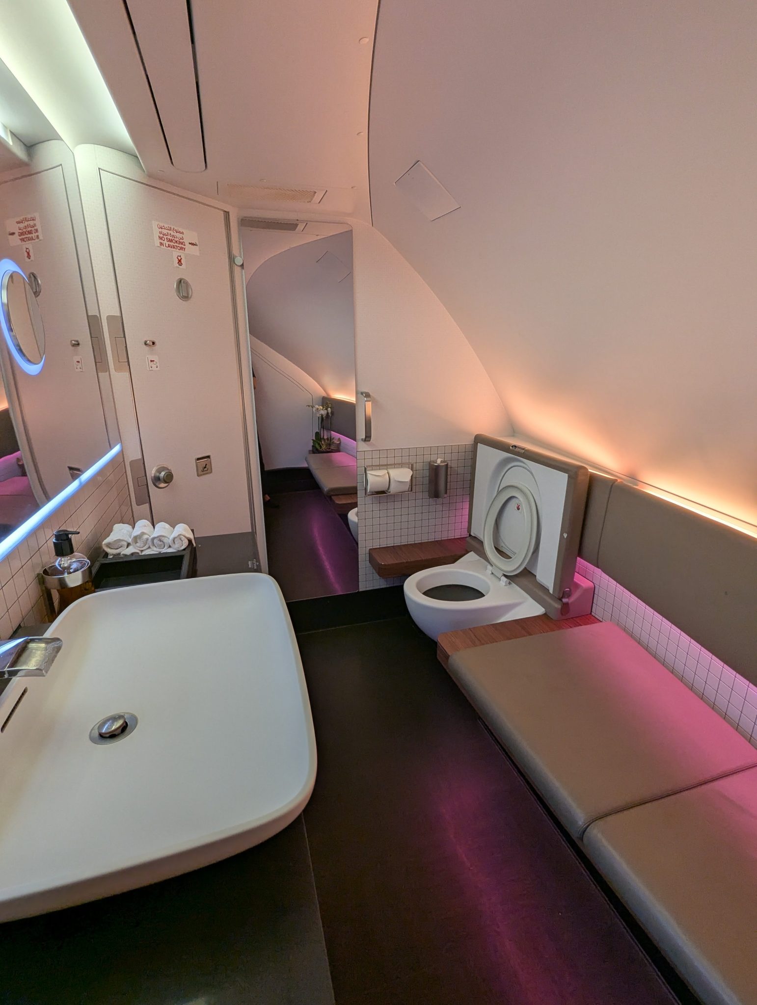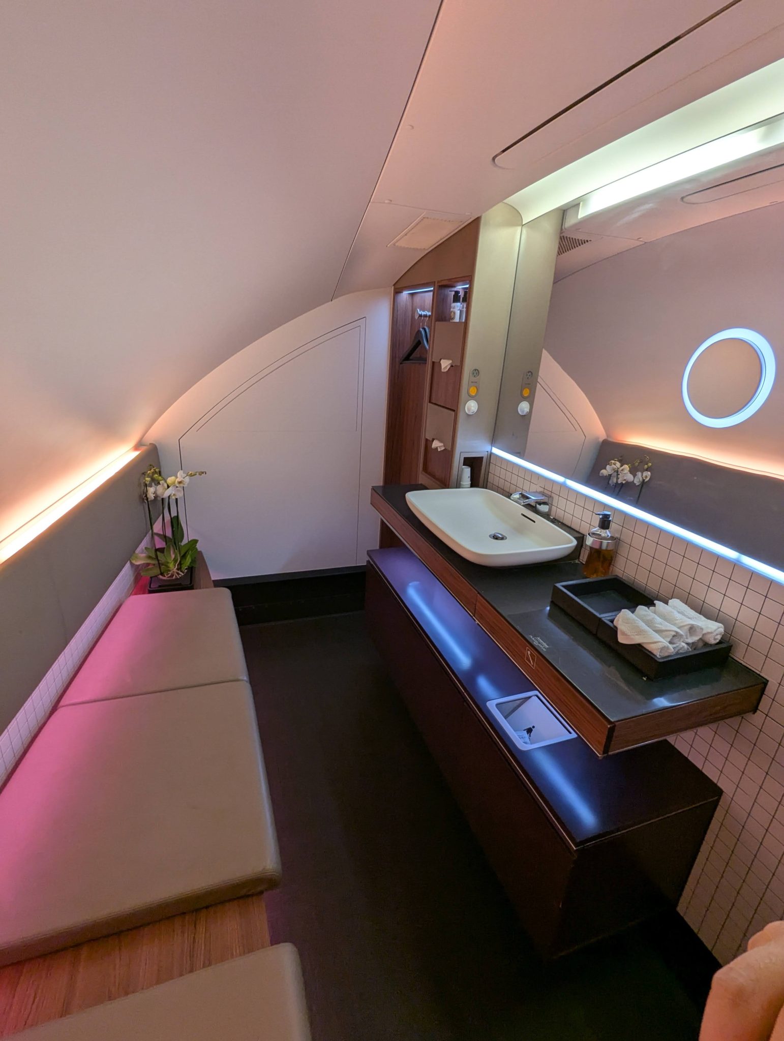 The Qatar first class seat is a slightly older than the QSuite seats that we flew over from Seattle on. It’s a bit less private but its extremely spacious and there are only 8 seats in the cabin. So it makes for a very exclusive environment. The bathroom is also huge and extremely well appointment. The only other bathroom that I’ve seen that’s larger is the Emirates First Class bathroom with the shower. All in all it’s a very comfortable cabin and both the Sister and I agree far more enjoyable than the business class flight.