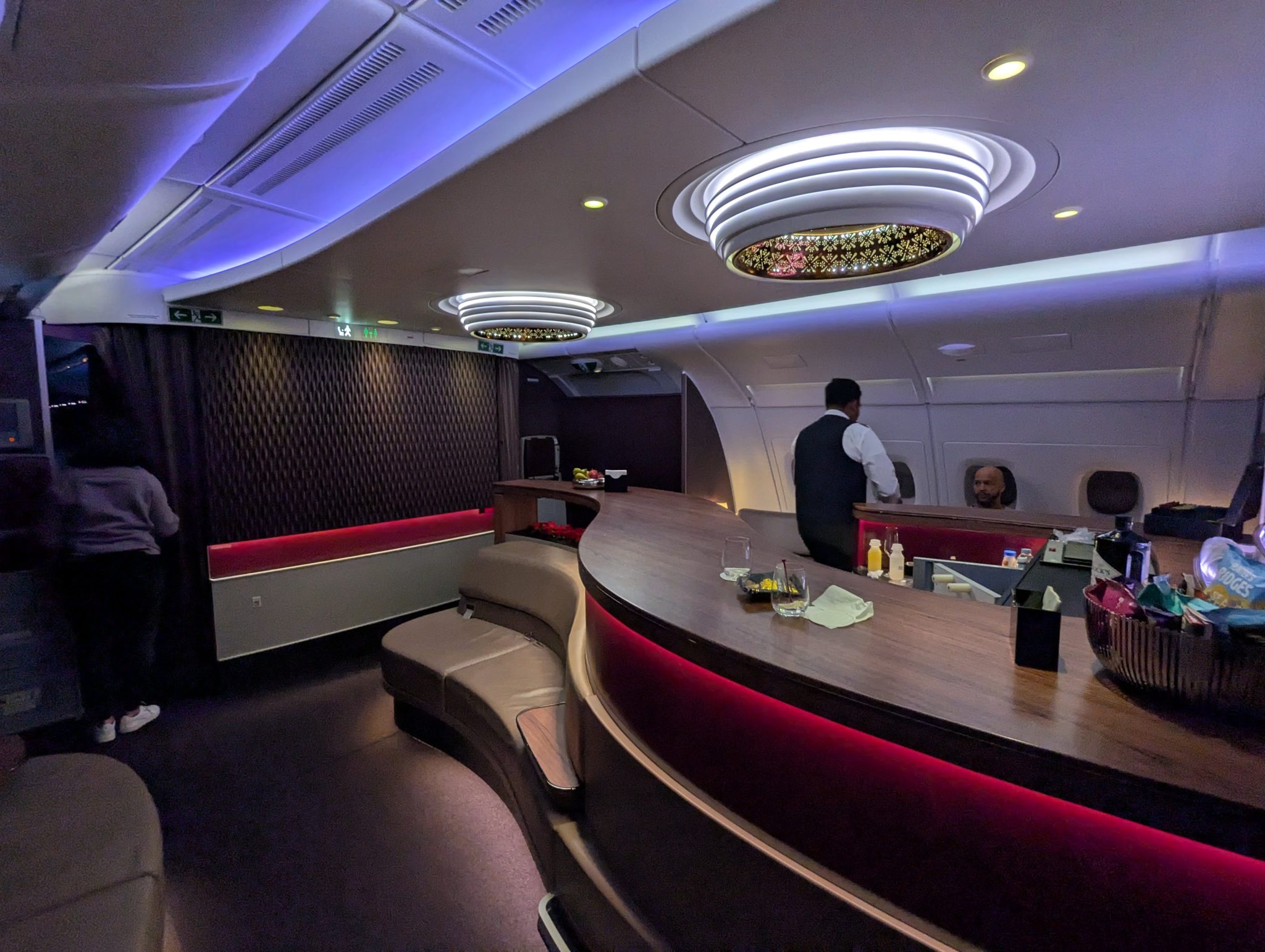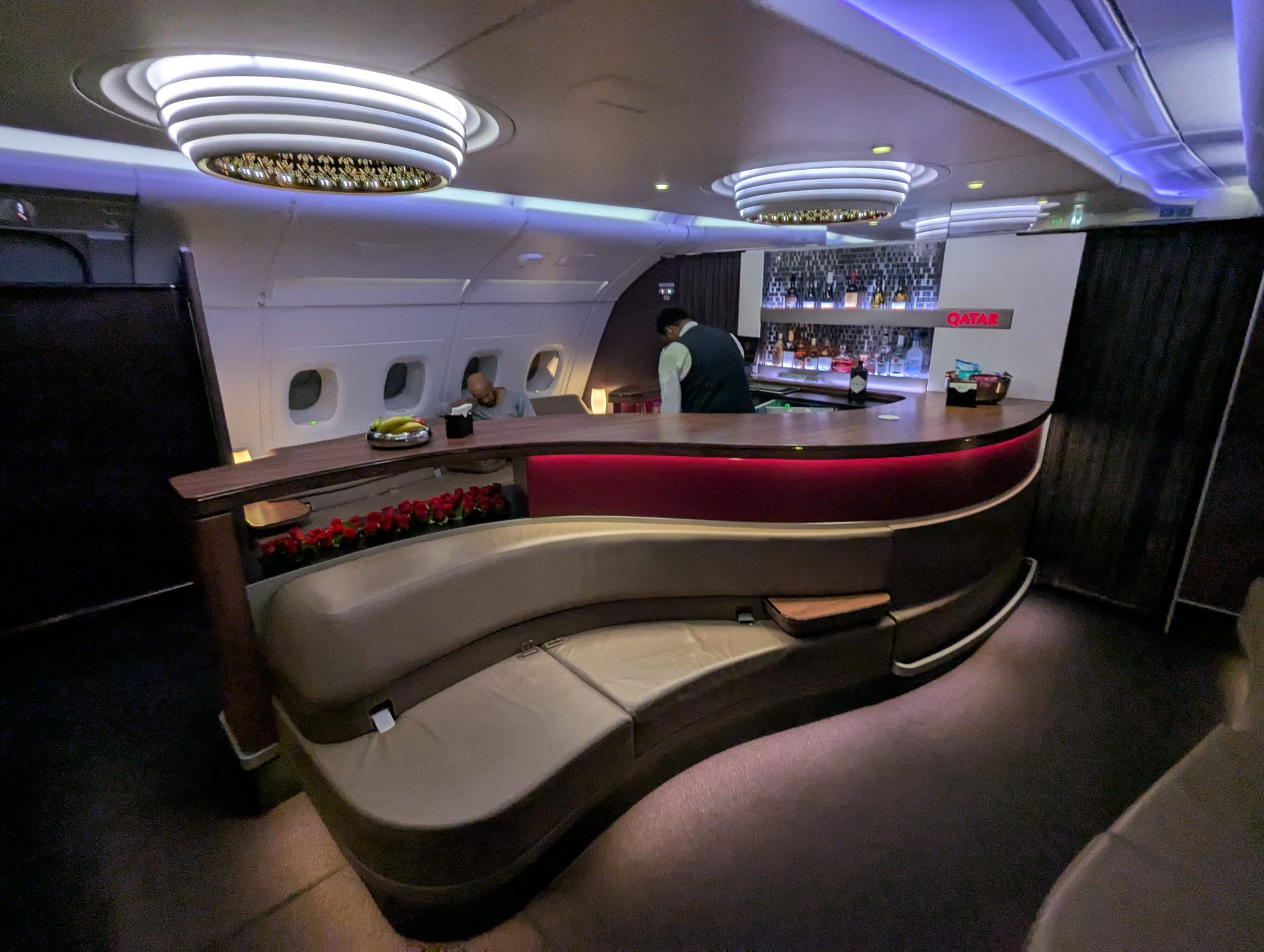 Another unique feature of the Qatar A380 is the onboard lounge for their premium class passengers. It’s similar to the Emirates bar in the sky and a place the Sister and I go to check out soon after take off. Fortunately, it isn’t too busy and we seemingly get the whole bar to ourselves. The staff are even nice enough to take a few photos of us behind the bar.