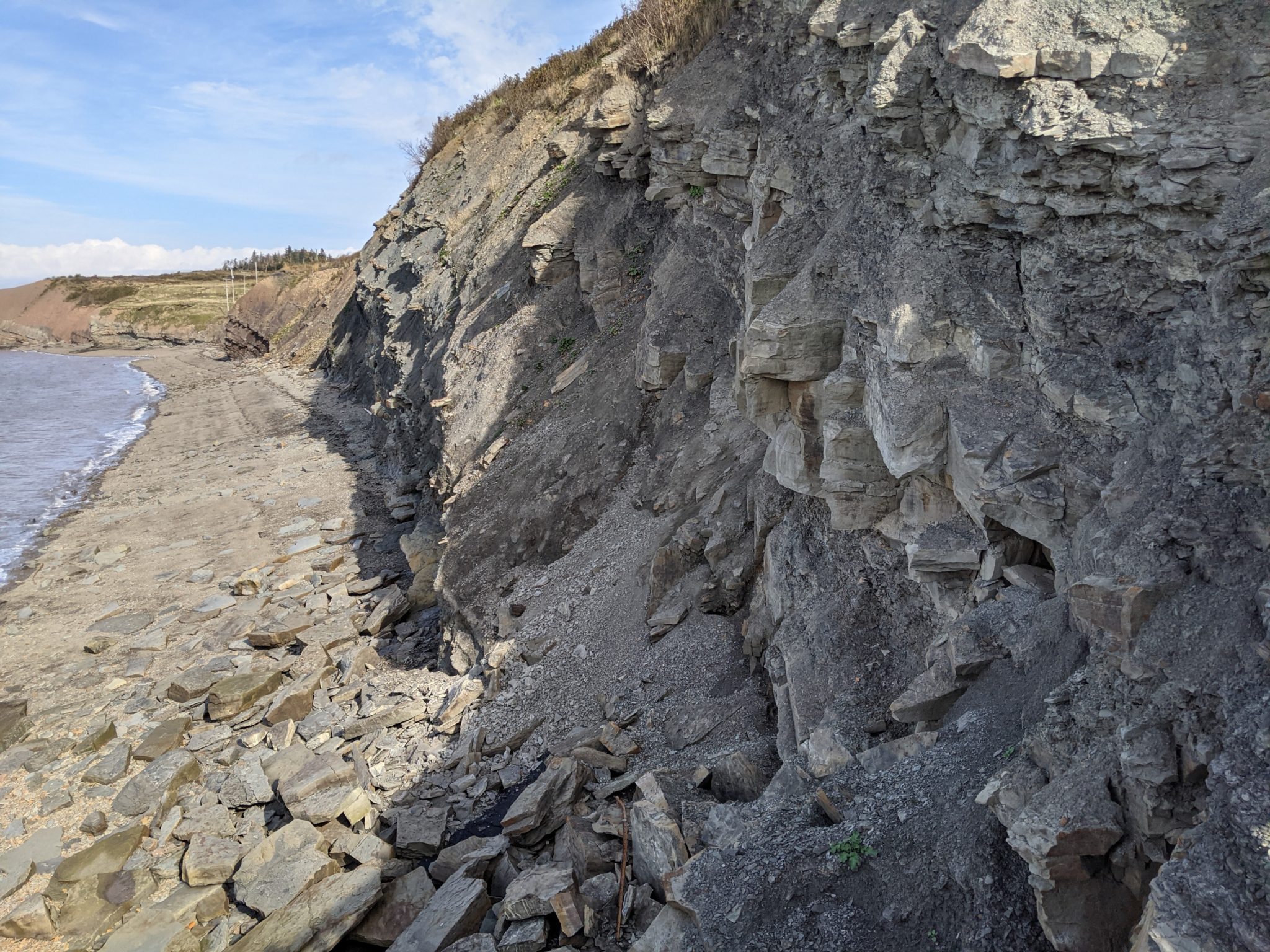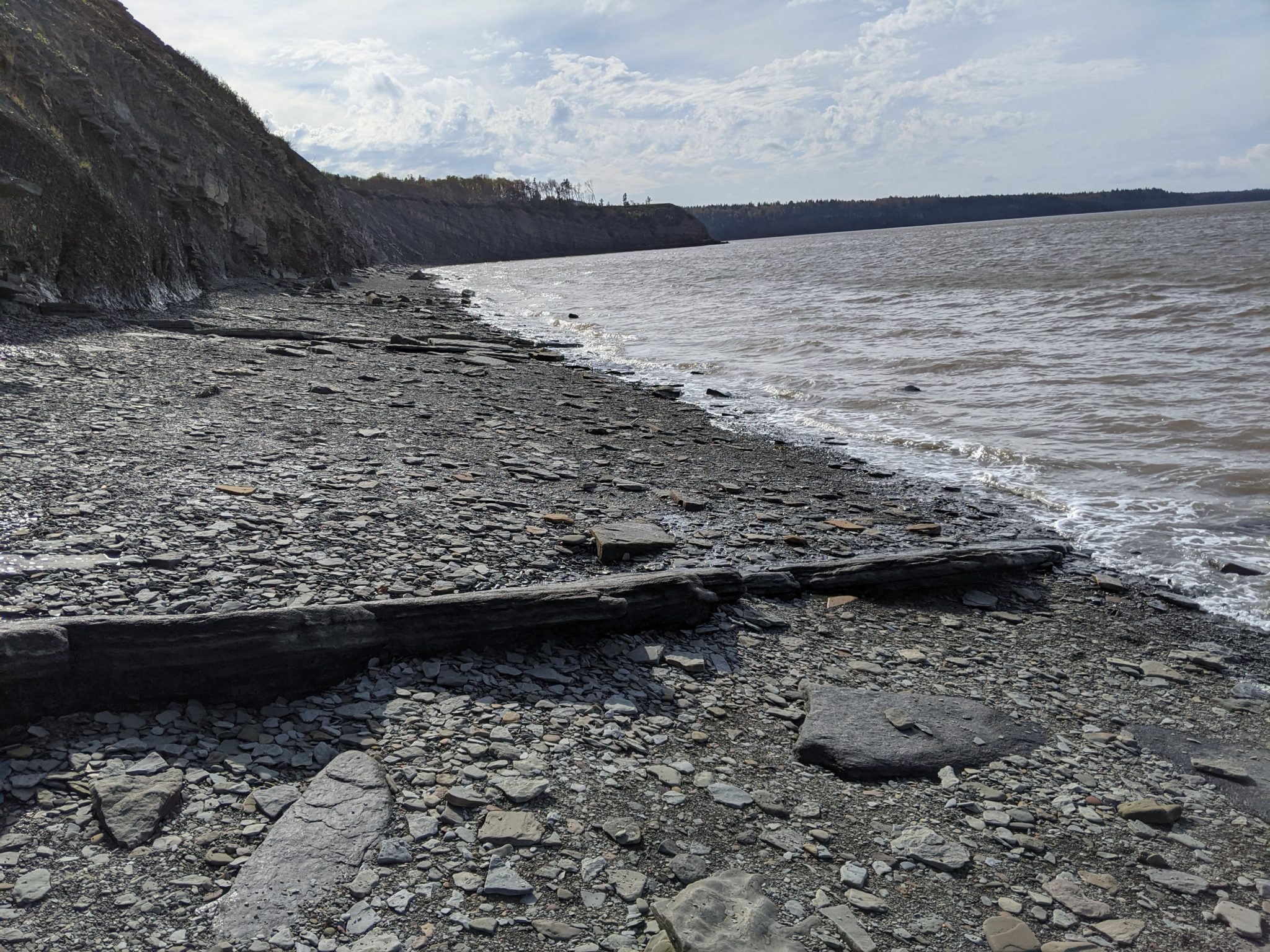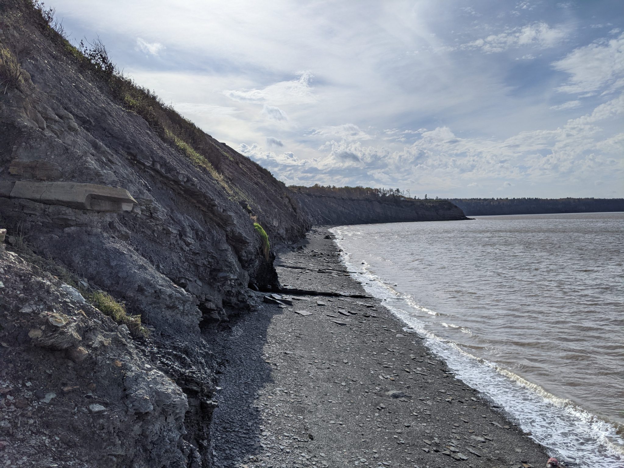 Along the way is a stop at Joggins Fossil Cliffs. I didn’t know anything about this stop, but its something Papa Minion had researched and insisted we go to. The Joggins Fossil Cliffs is a Unesco World Heritage Site. It exposes layers of rock for a full fossilized record of the Coal Age. Because of the high and powerful tides in the Bay of Fundy, more rock is exposed over time and the potential for new fossil discovery can happen! As is the theme for our trip, the actual centre is closed for the season. However, we did get to wander down to the beach and see the cliffs up close.