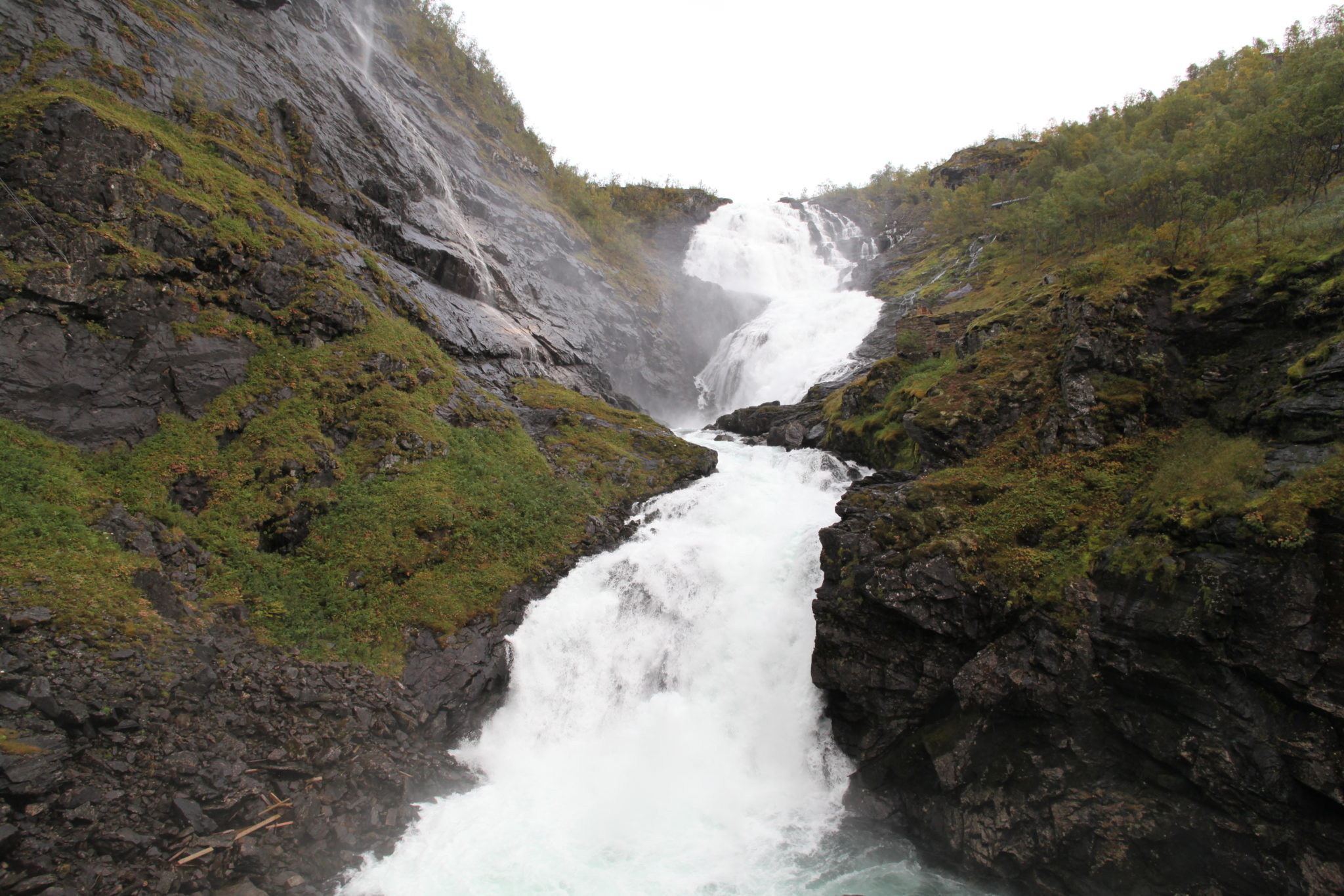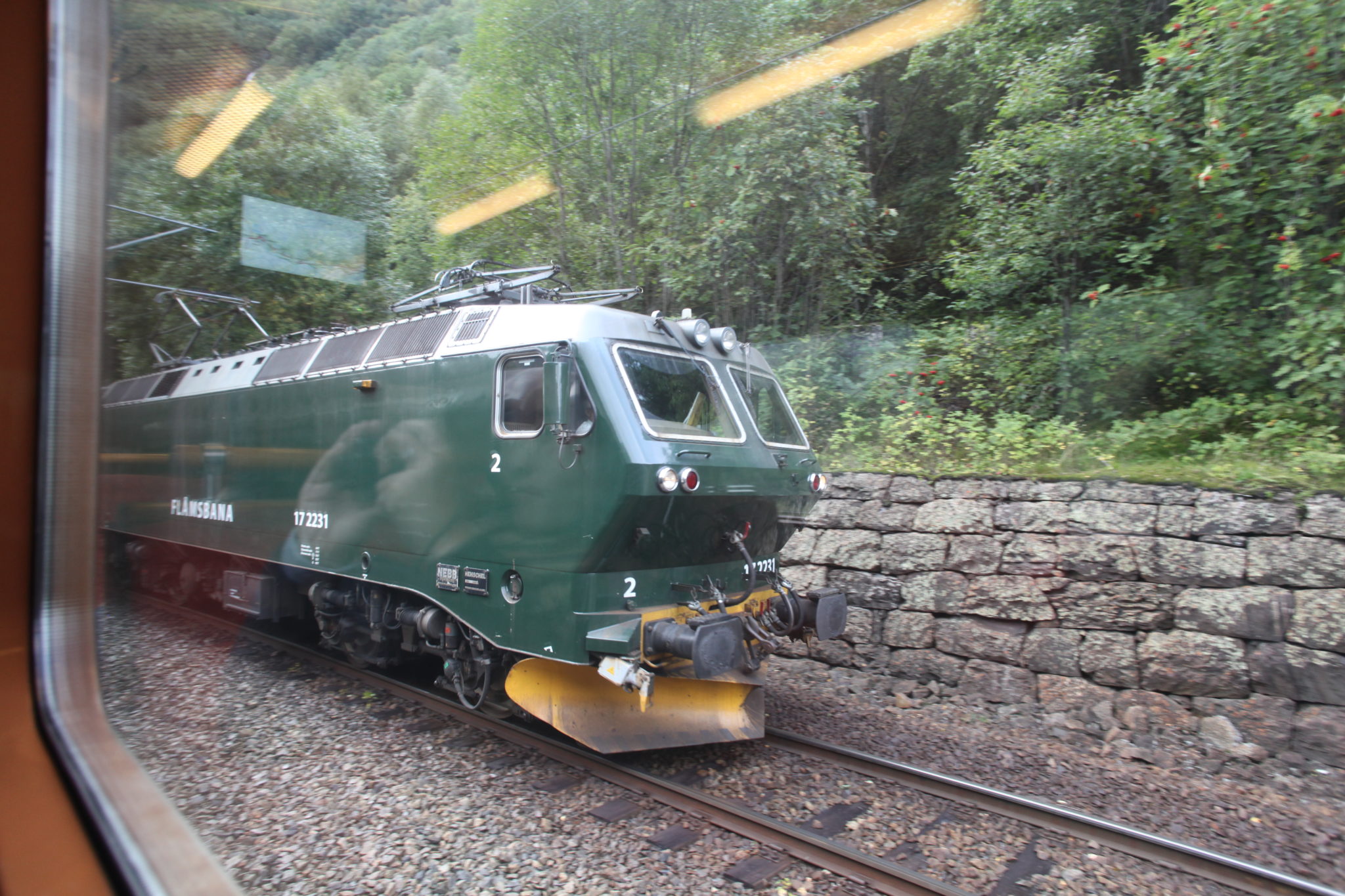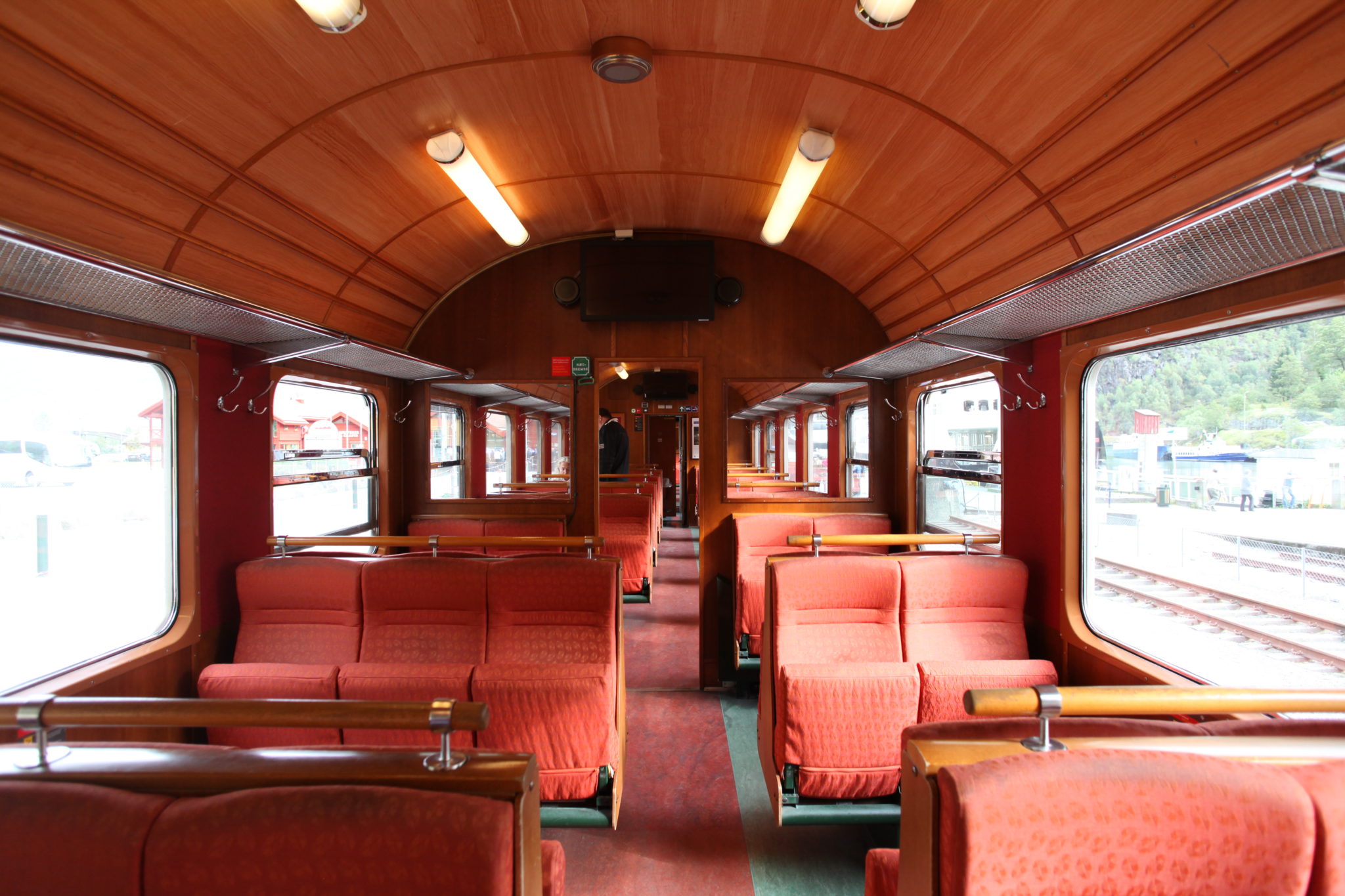 Upon arriving in Flam and disembarking from our boat, the railway station for the Flam Railway is conveniently right there! We simply had to wait (with our tickets) for our train to board and depart. The Flam railway is a scenic 20 km train ride that climbs (or descends) mountainous terrain and offers some amazing views of nature. It’s considered one of the steepest lines in the world with a 5.5% gradient. We boarded our car and settled in for the exciting journey.