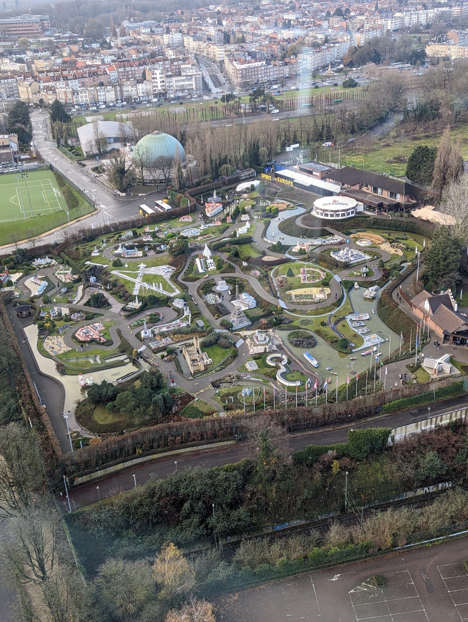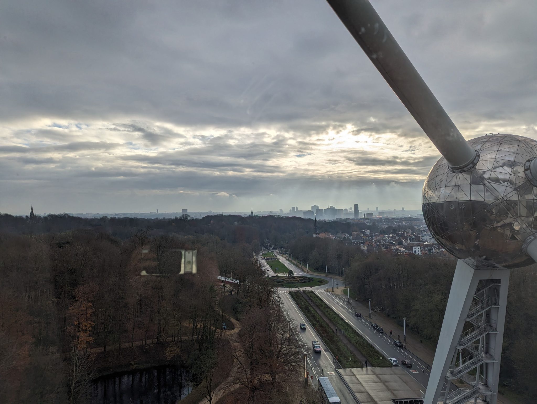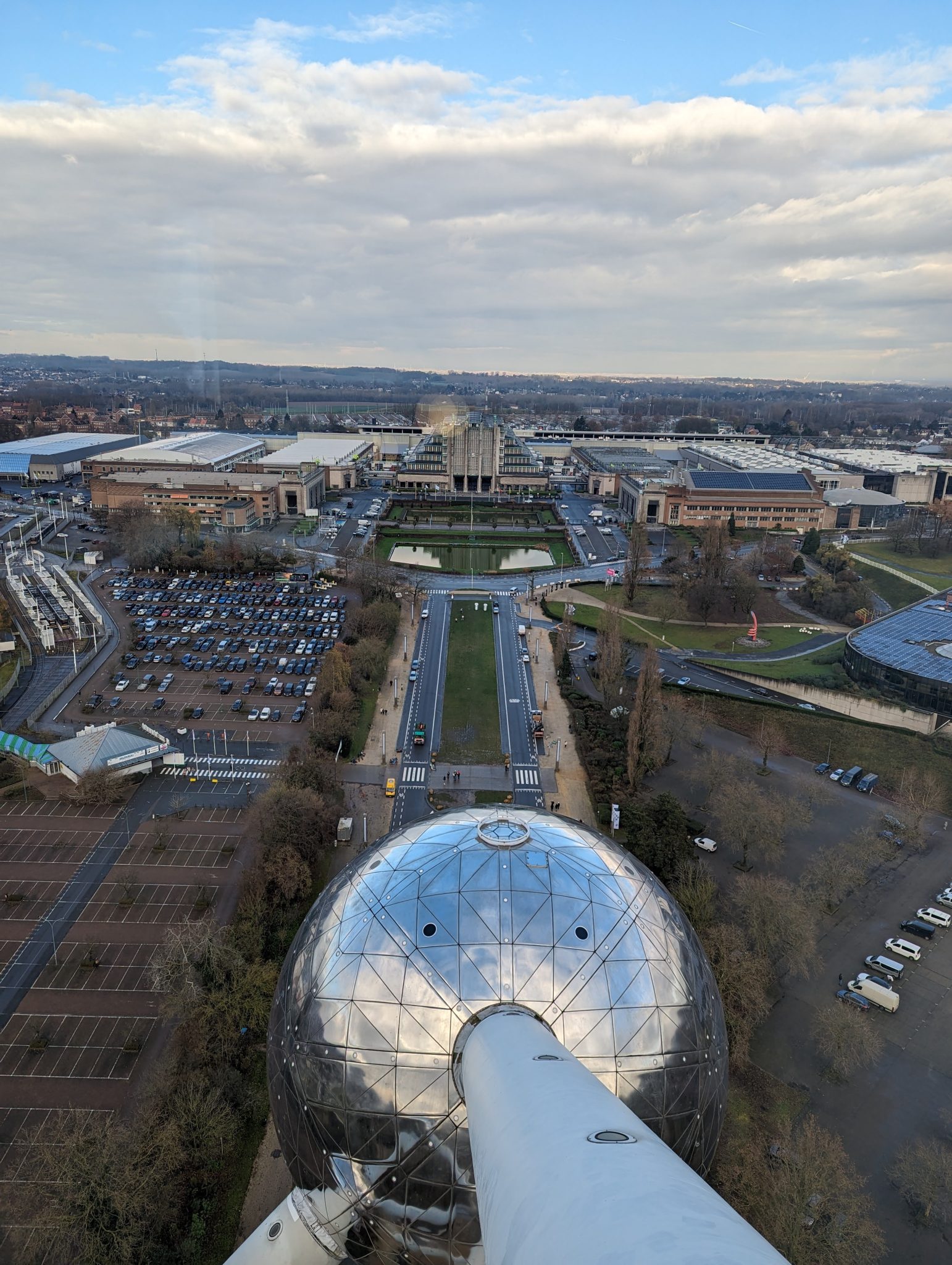 After I pay for admission, I enter the central lobby area where I take an elevator to the top of the Atomium. Here is where you get some spectacular views of the area surrounding the structure. You also get a pretty good view of the Brussel skyline. From there you return back to the ground floor where you then are led to an escalator that takes you to the middle few “pods”. In each of the pods are displays that talk about the history and development of the Atomium. It also talks about the life of the structure after Expo and how they restored it to what it is now.