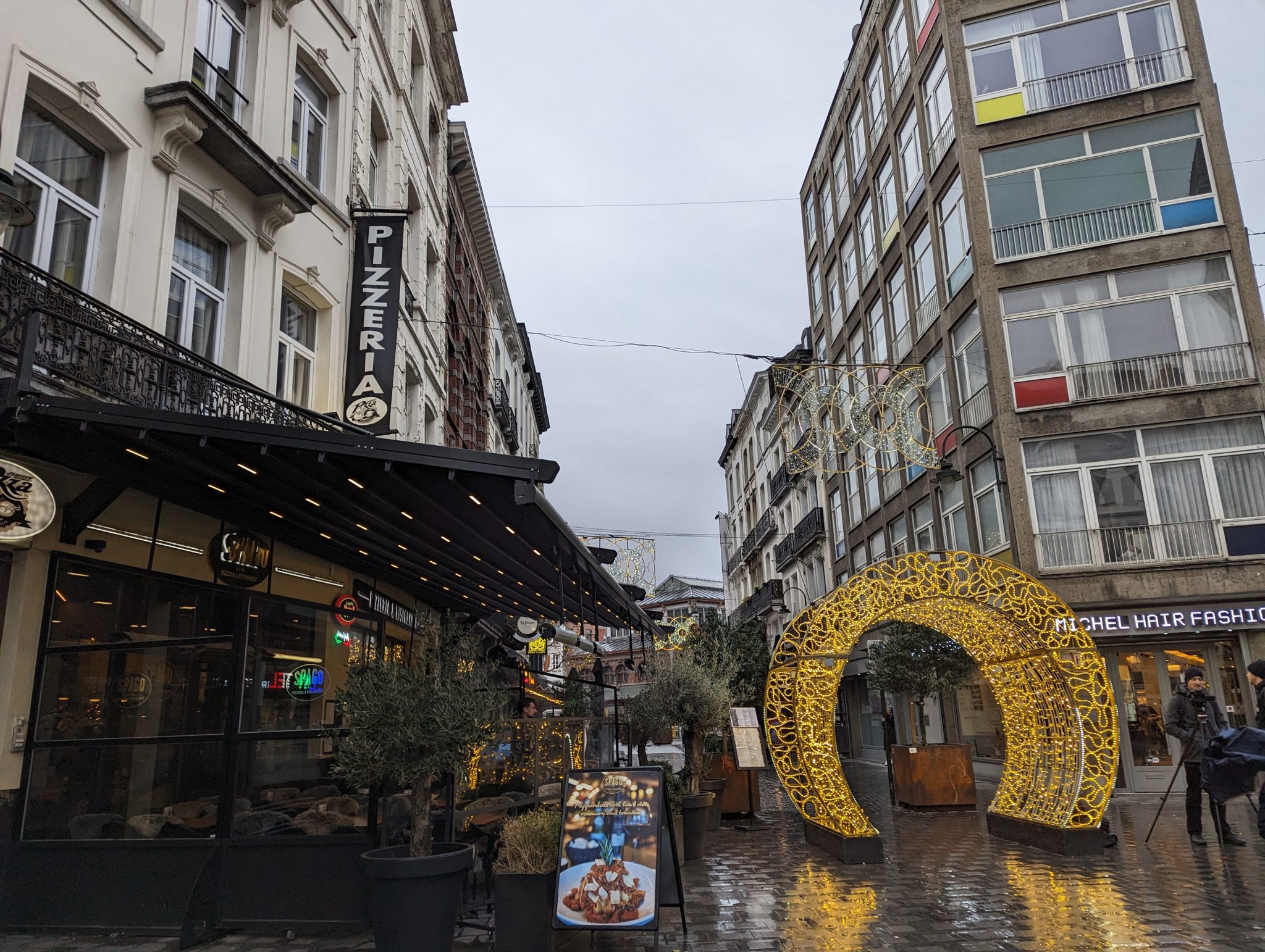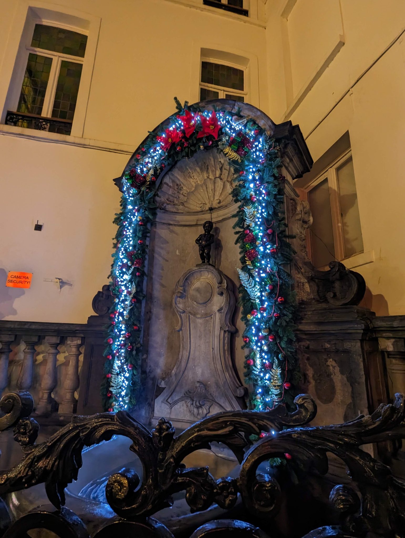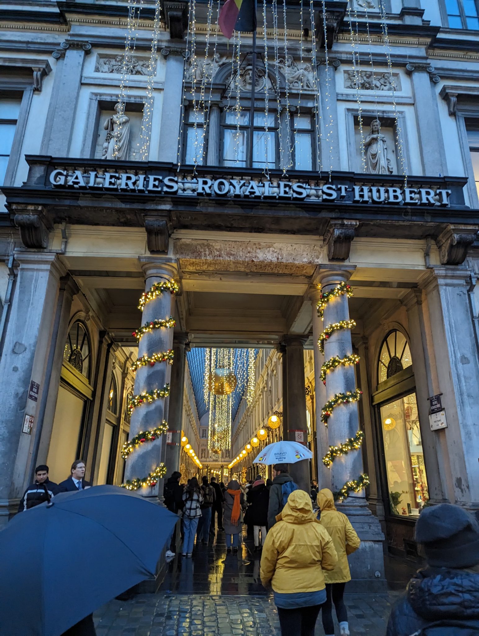 After joining up with the walking tour and briefly introducing ourselves to each other we start in the Grote Markt. Our guide spends a fair amount of time going through not only the history of Brussels but also the history of many of the super unique and beautiful buildings that surround the square. We eventually head out of the square towards the Galeries Royales St. Hubert. As best as I can describe it, it is like an old open air mall. Add that it is decorated for Christmas and its a very pretty sight.