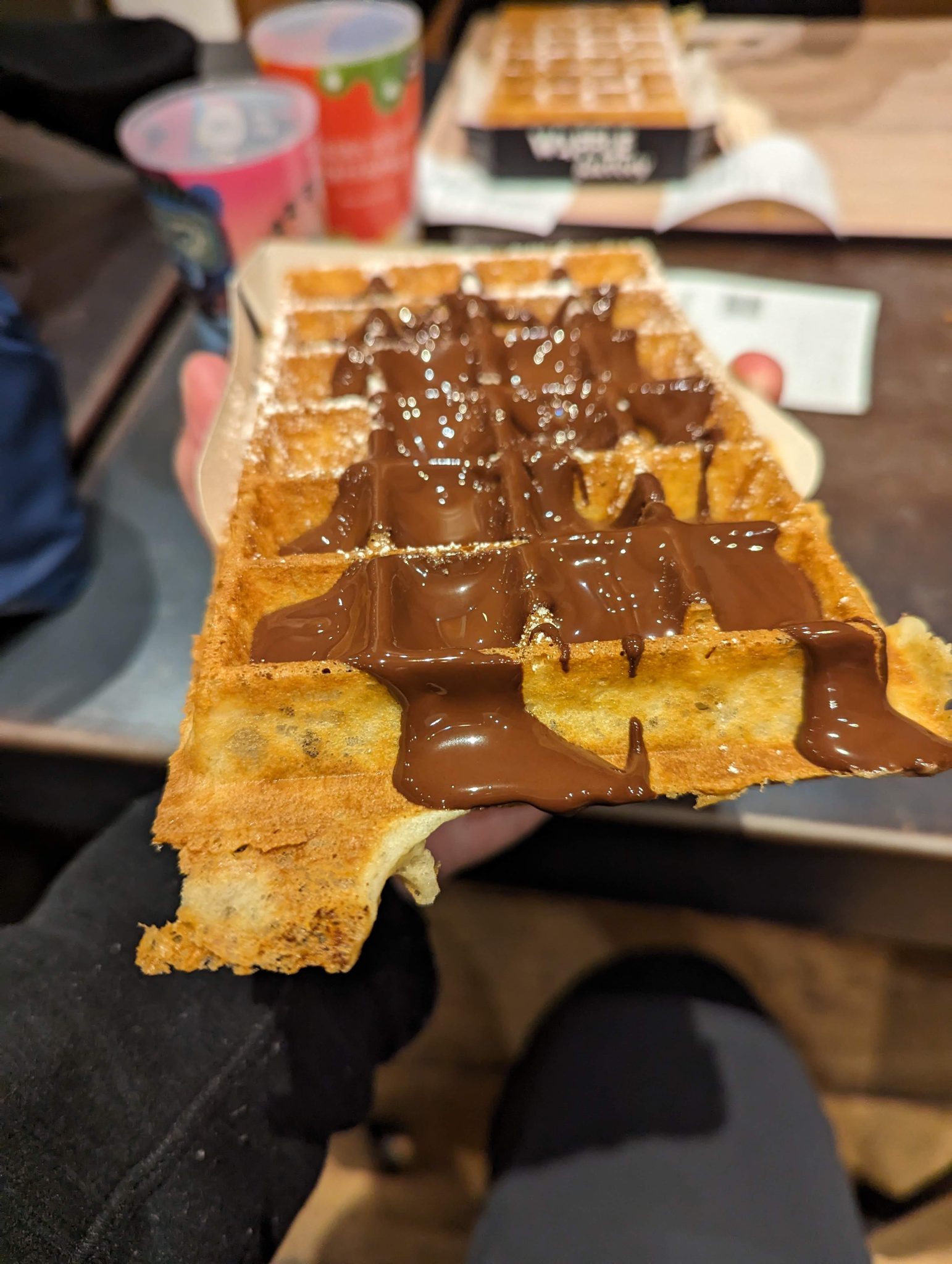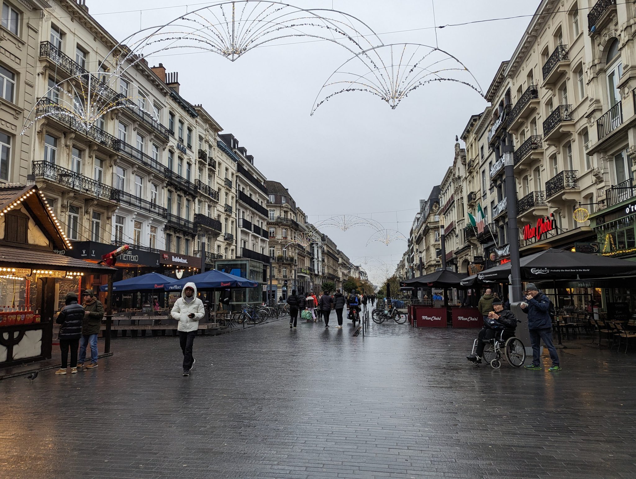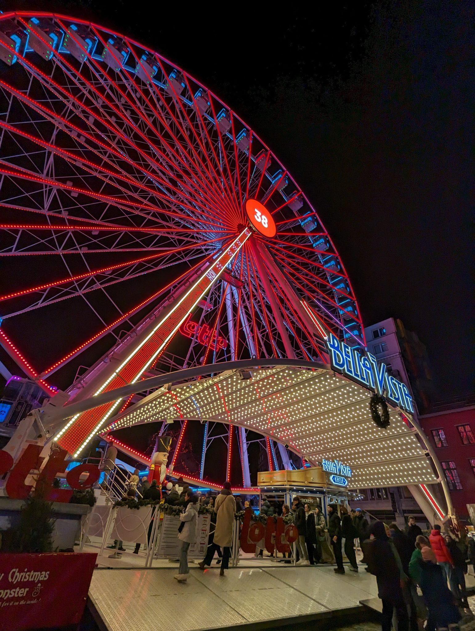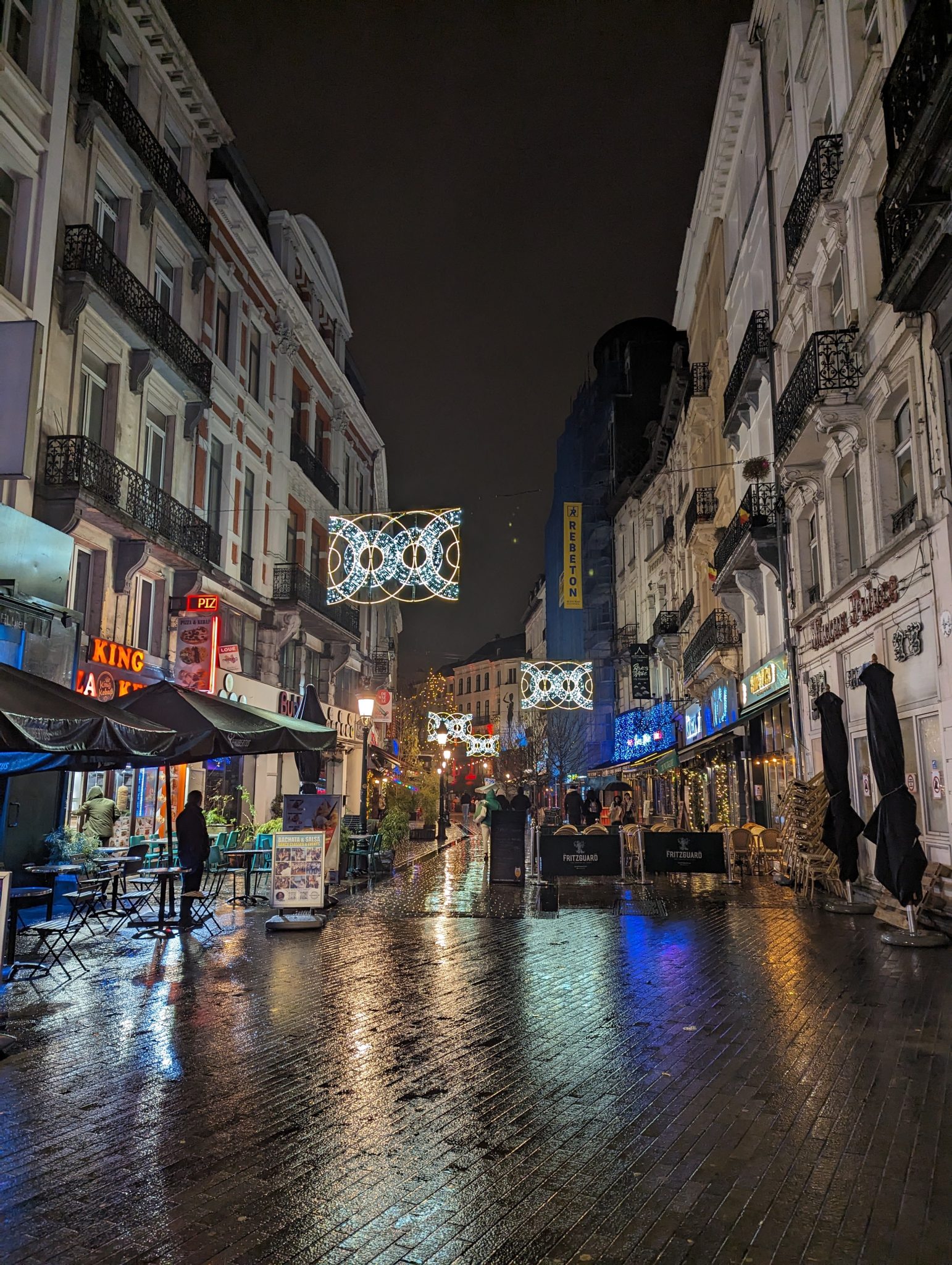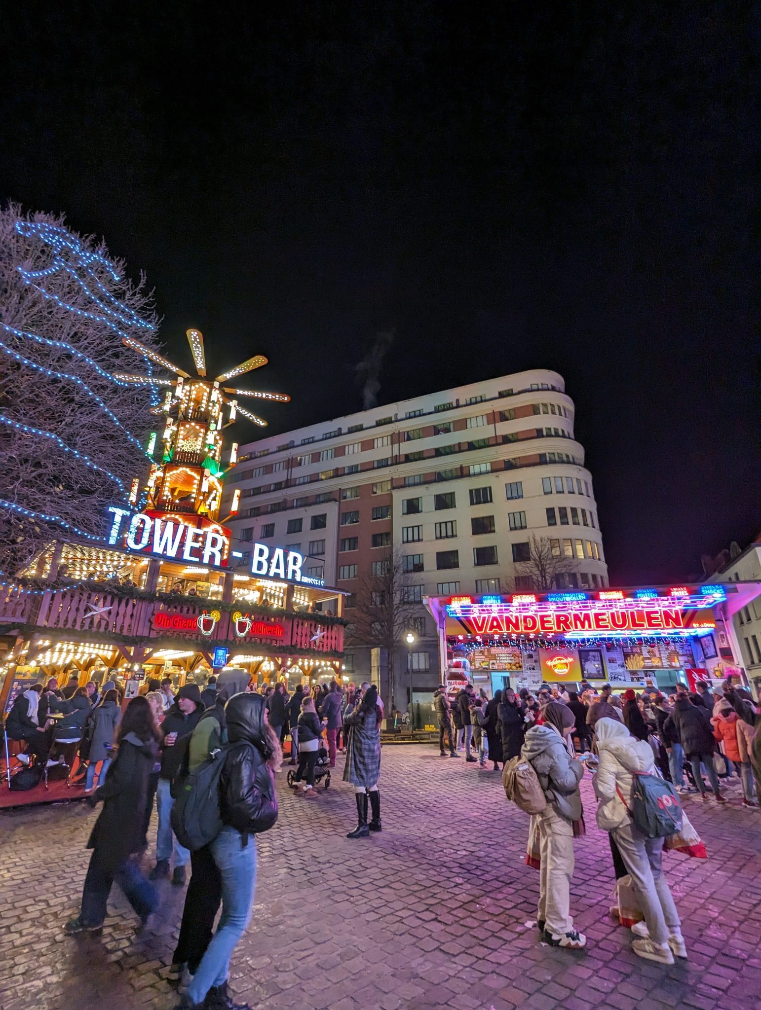 After dinner I decide to take another stroll. This time to Brussels Christmas Market. While the Bruges one is cozy and cute the Brussels one is massive and on a whole different level. There is even a full size Ferris wheel for people to ride if they want to. It spans several city blocks and that’s just one site. There are several sites throughout the city centre and the streets are filled with market goers going from site to site!