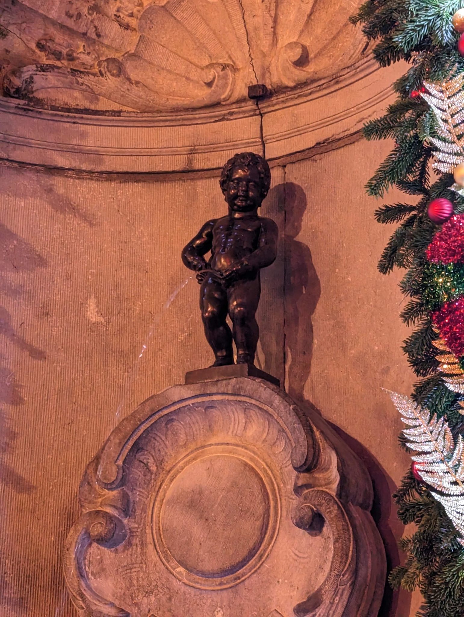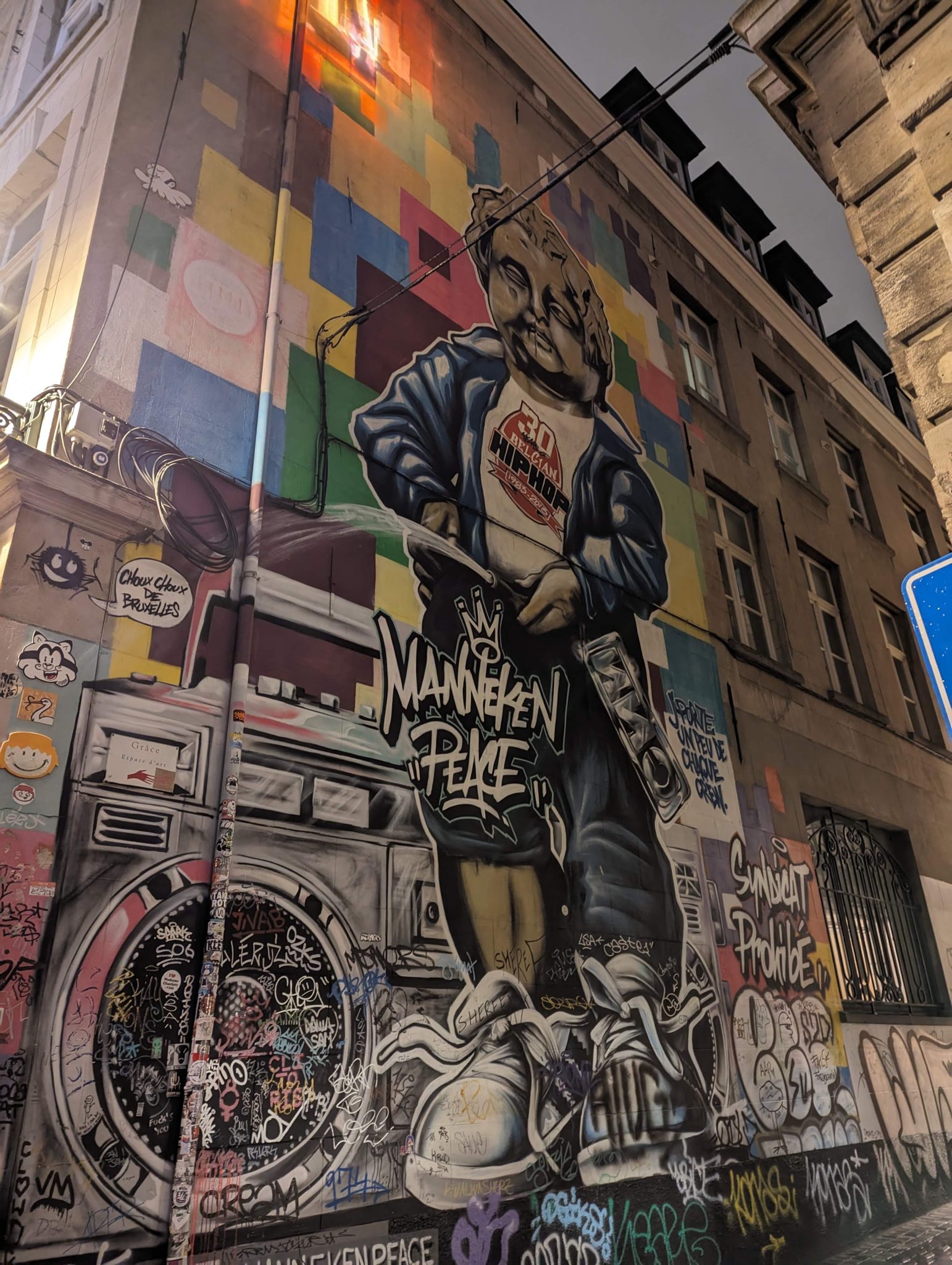 One of the “famous” landmarks in Brussels is the Manneken-Pis. It is a small bronze statue of a boy peeing and is popular as a tourist destination. It’s a bit underwhelming if I’m being honest, but I’m glad I can check it off my list. In fact, on my way to the statue there is a bit of graffiti on the side of a building for the Manneken-Pis that I personally think is a bit cooler than the statue itself!