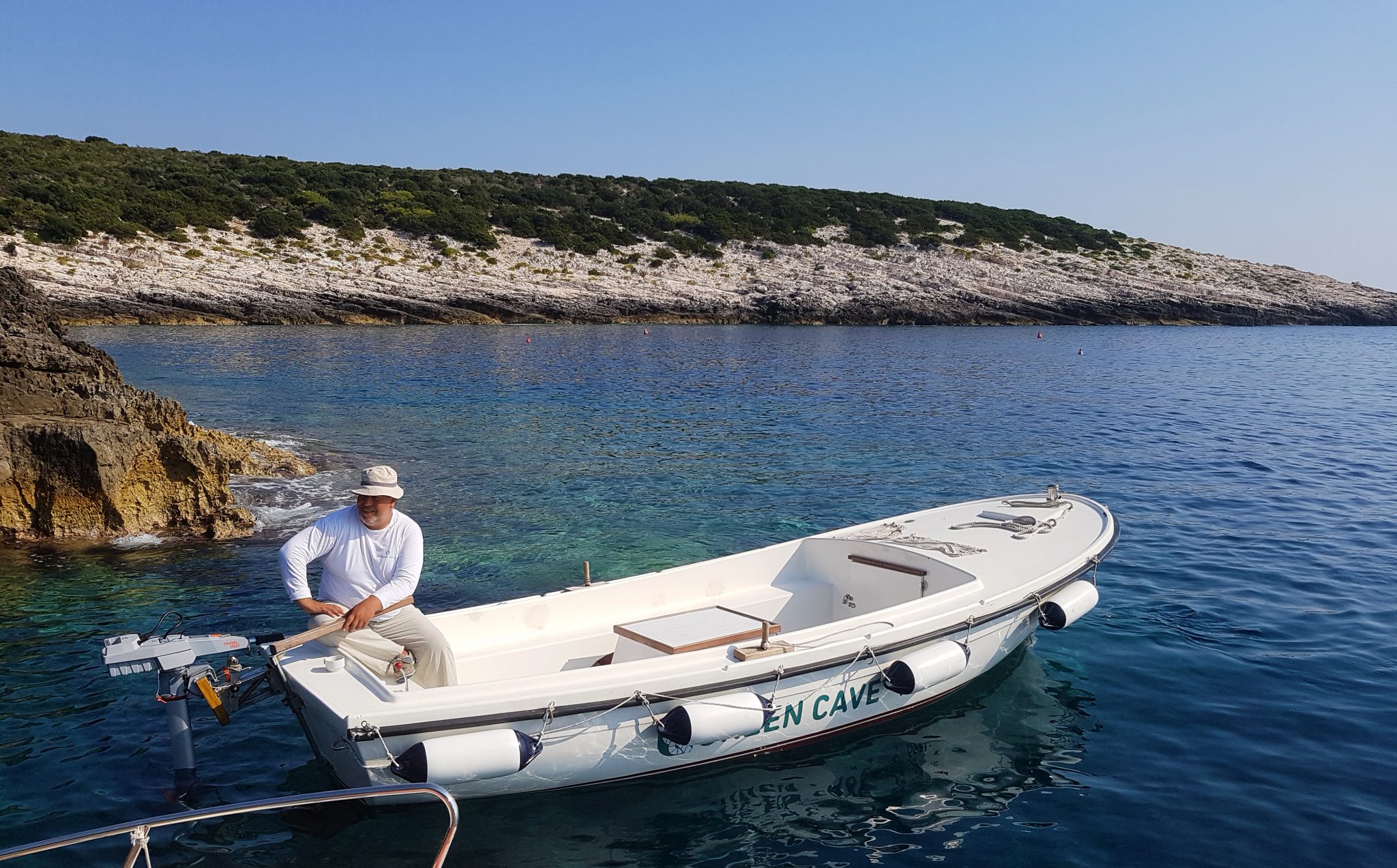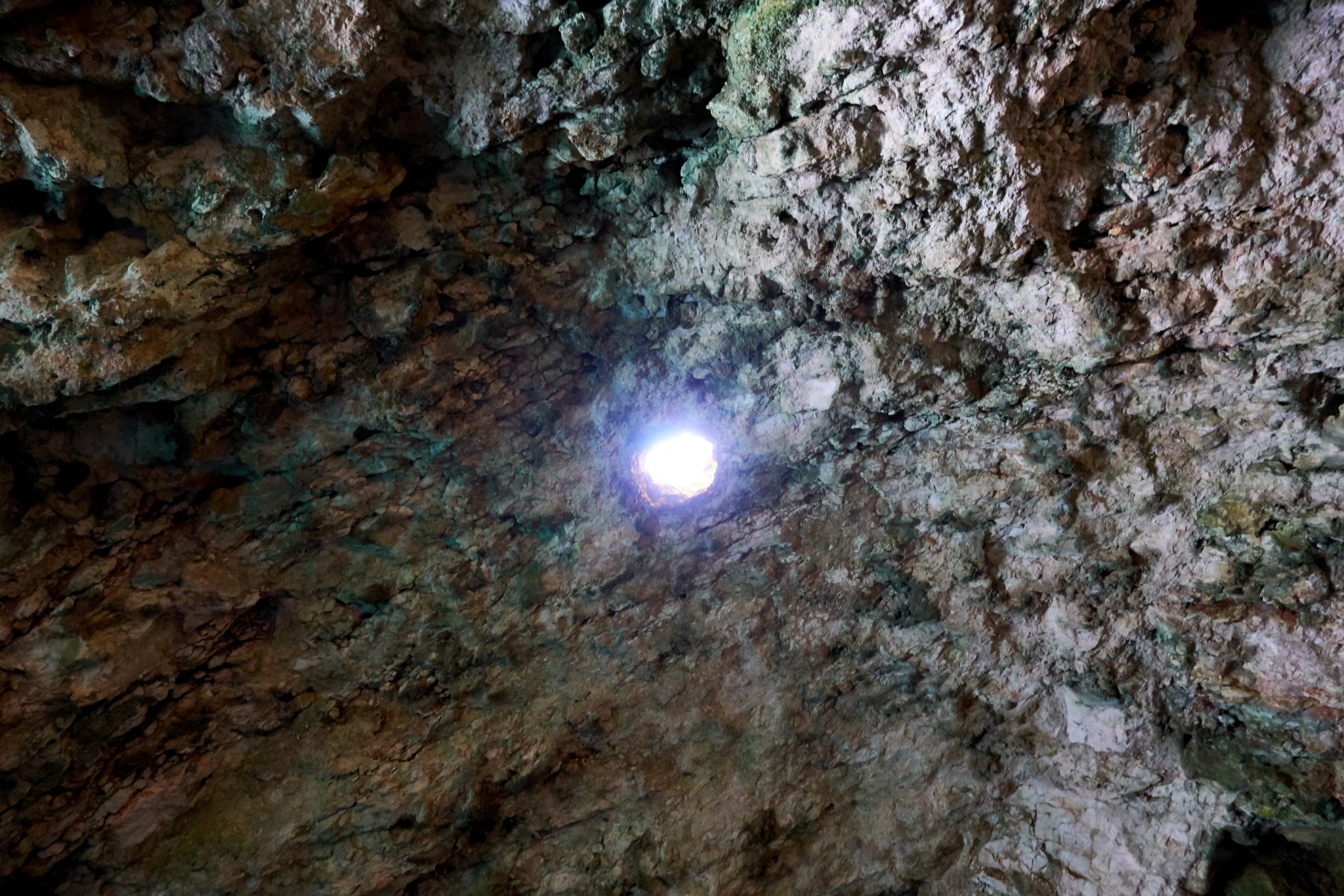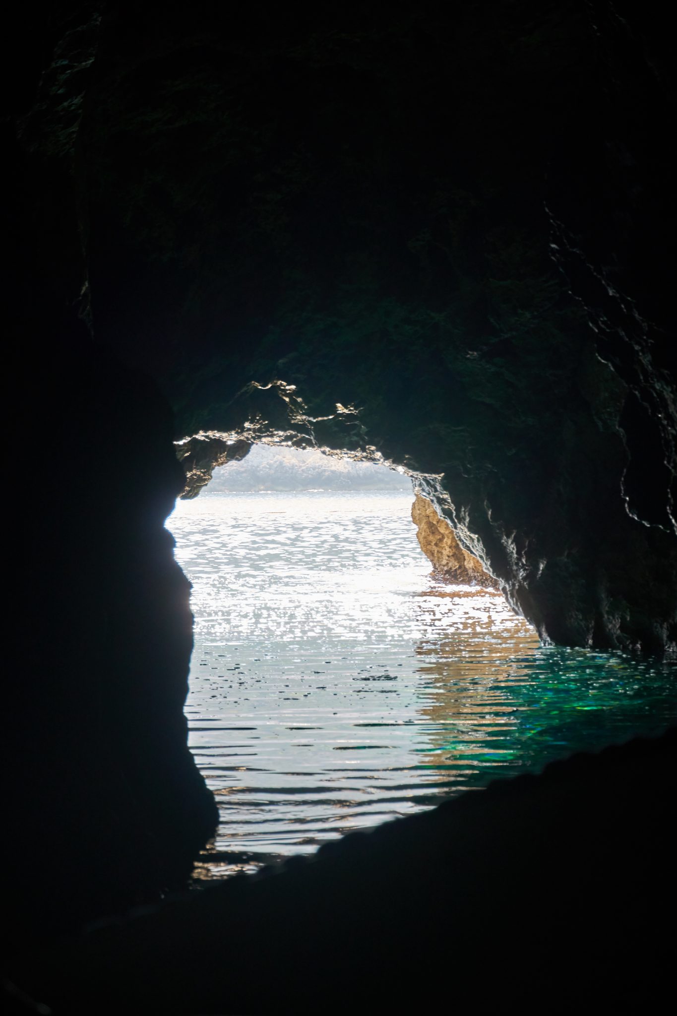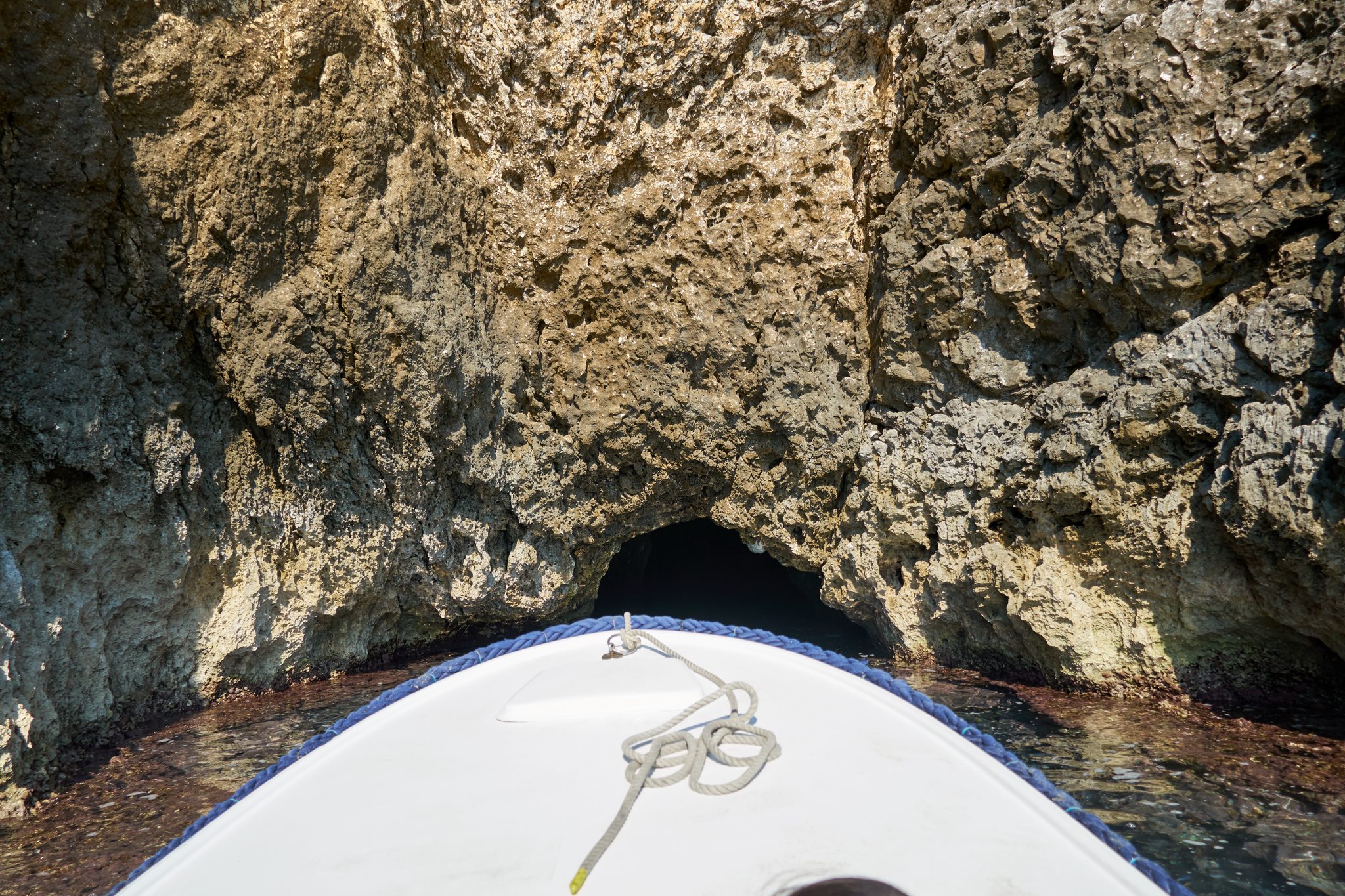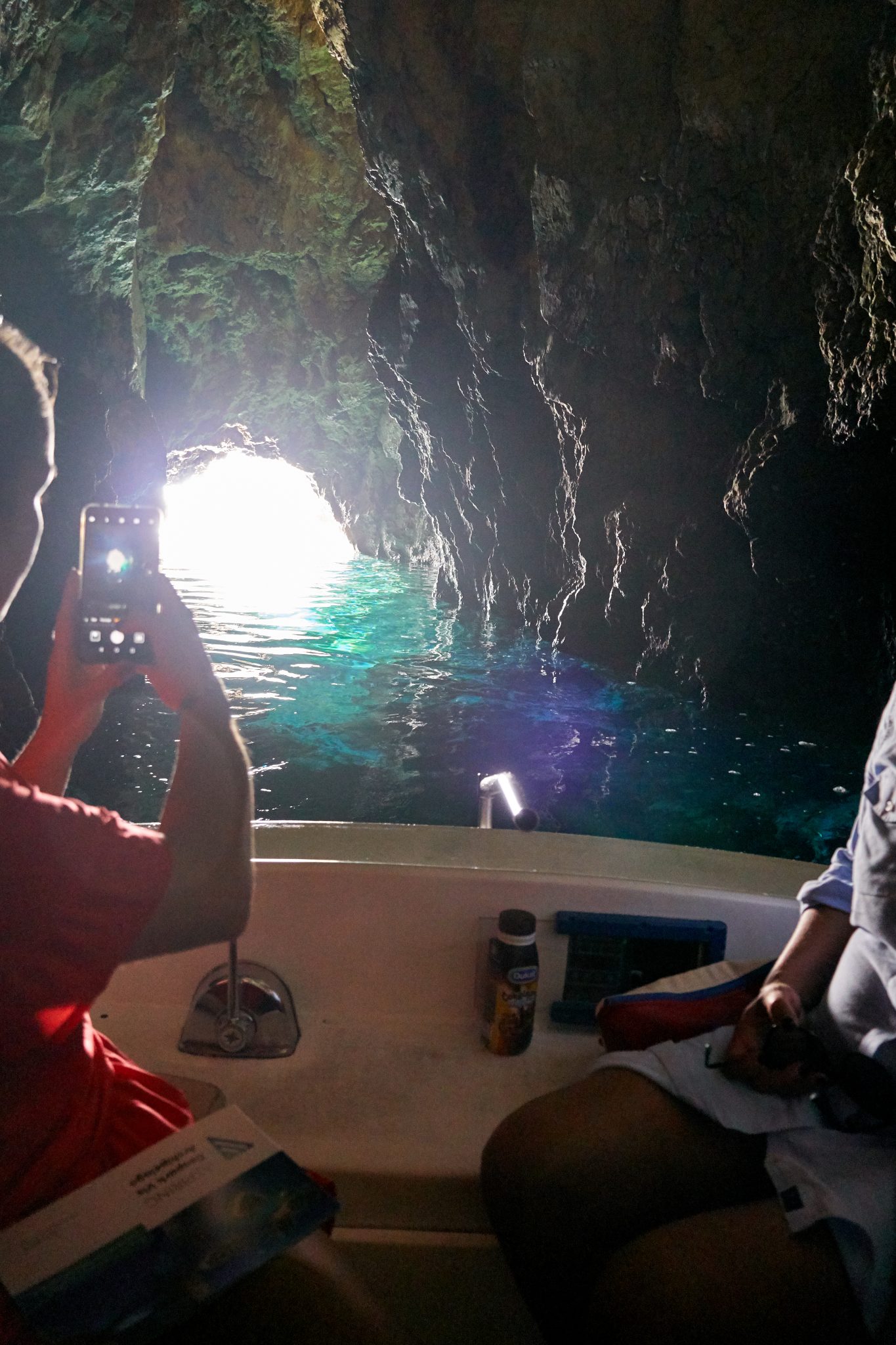 We all got into a smaller white motor boat, and the operators took us from the dock, around to the other side of the island. There was this tiny little hole which we learned was the entrance to the Blue cave. As we neared the entrance, our driver had us all get into the bottom of the boat and duck down, it was THAT small of an opening.