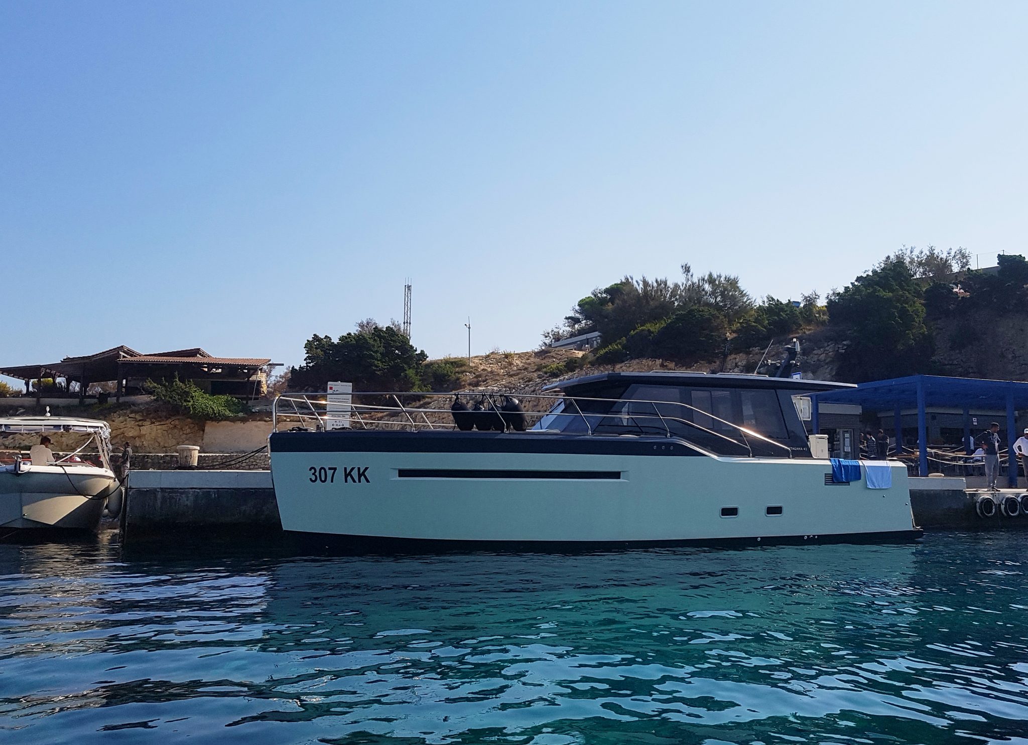 After grabbing breakfast, we walked over to the port/dock area where we waited to meet our boat. Gimpy had booked this Blue Cave tour well before our trip. We were to meet someone that would take us to the boat. When we finally met the representative, he mentioned that the boat had been upgraded. So instead of the Zodiac like boat we saw in the booking, we were actually getting this fancier yacht like speed boat. No complaints here!