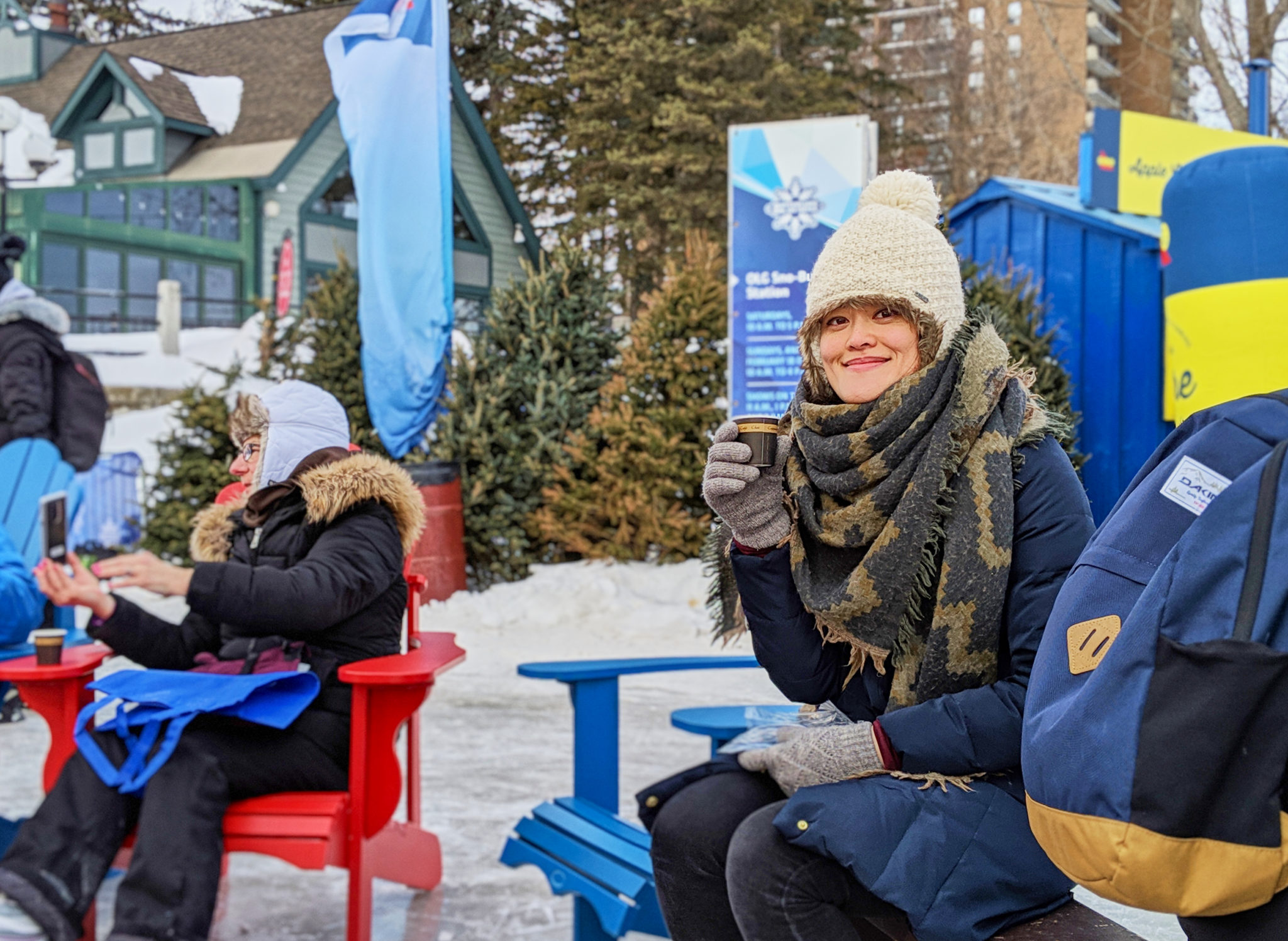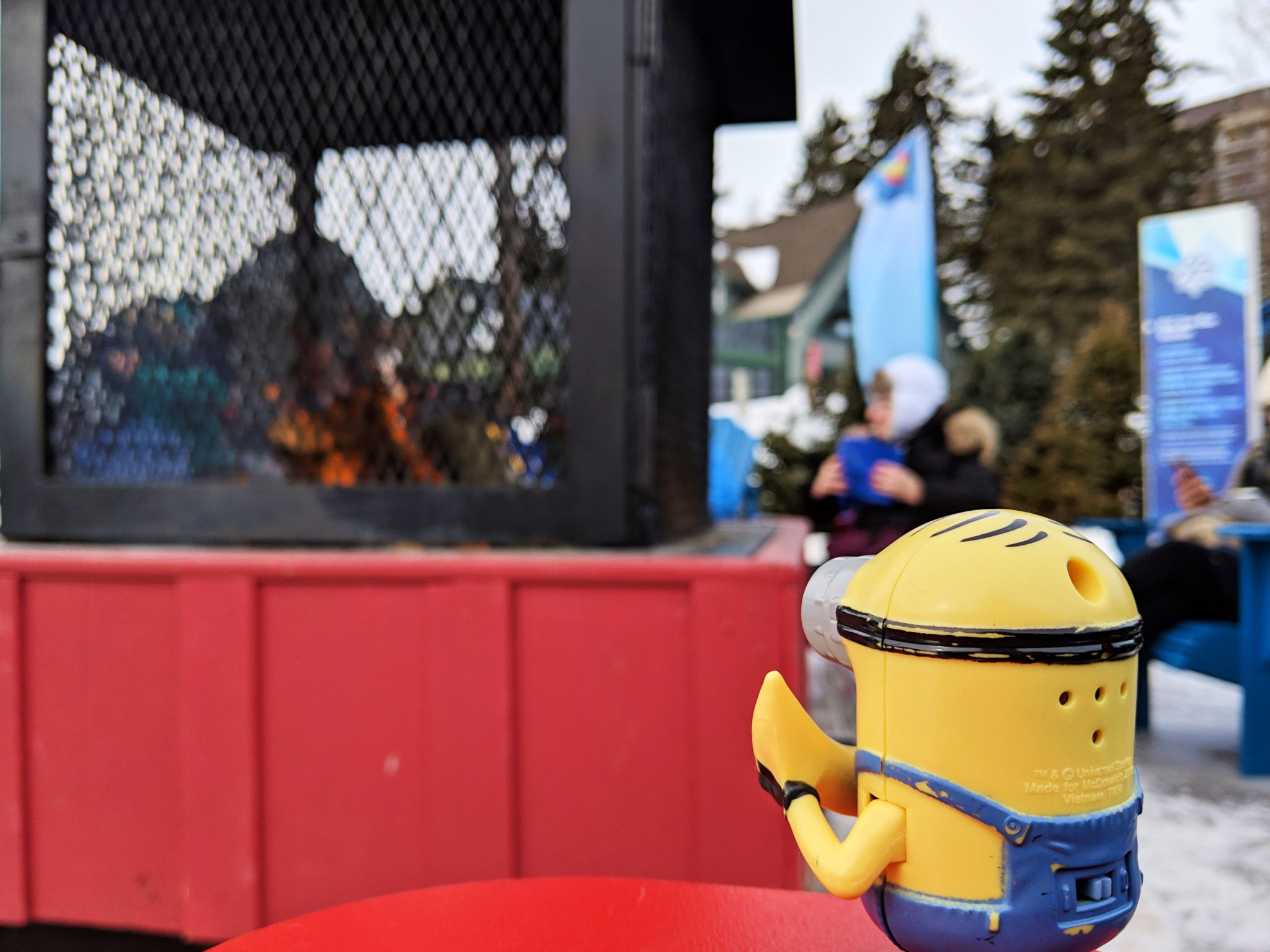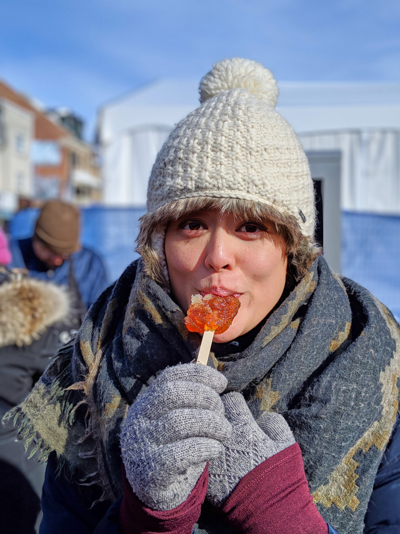We continued to pop in and out of these “rest areas” until we reached halfway down the Canal. There was a larger festival area setup with places to sit around the fire, apple cider samples and live music! We spent a little time warming up in front of one of the fires, enjoying our cider and the festive atmosphere around us! We decided to turn back from the festival point and make our way back to the place we started to return our skates and find lunch!