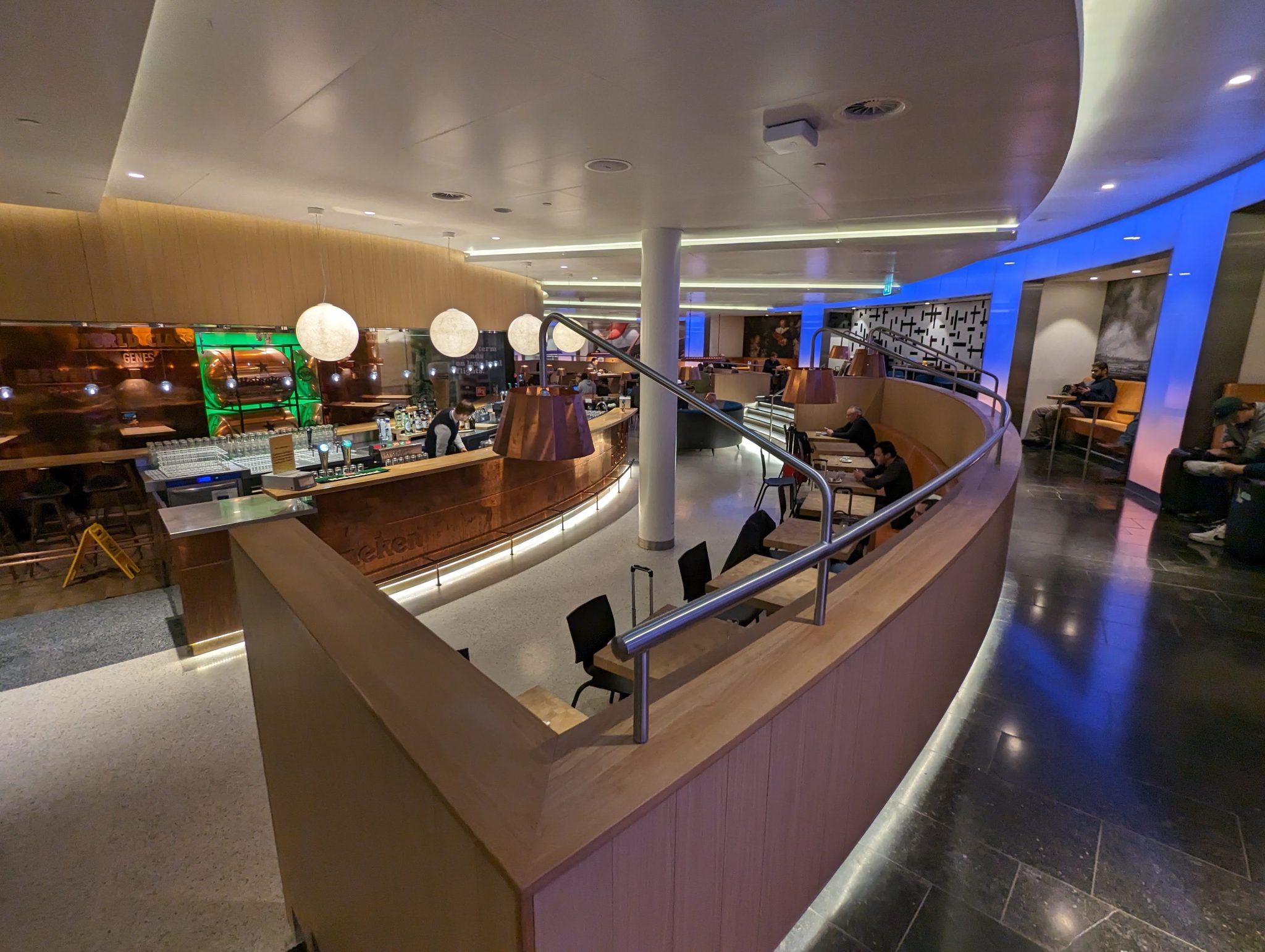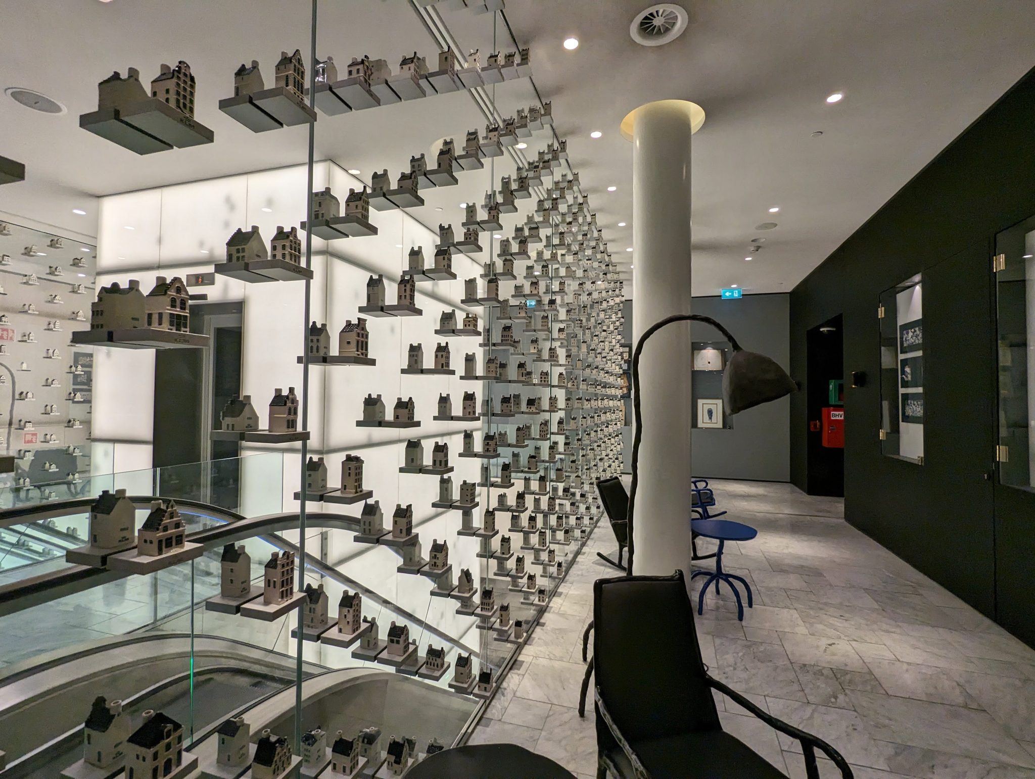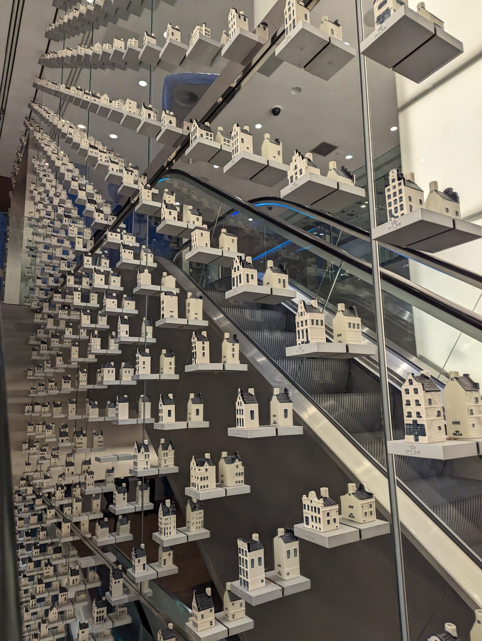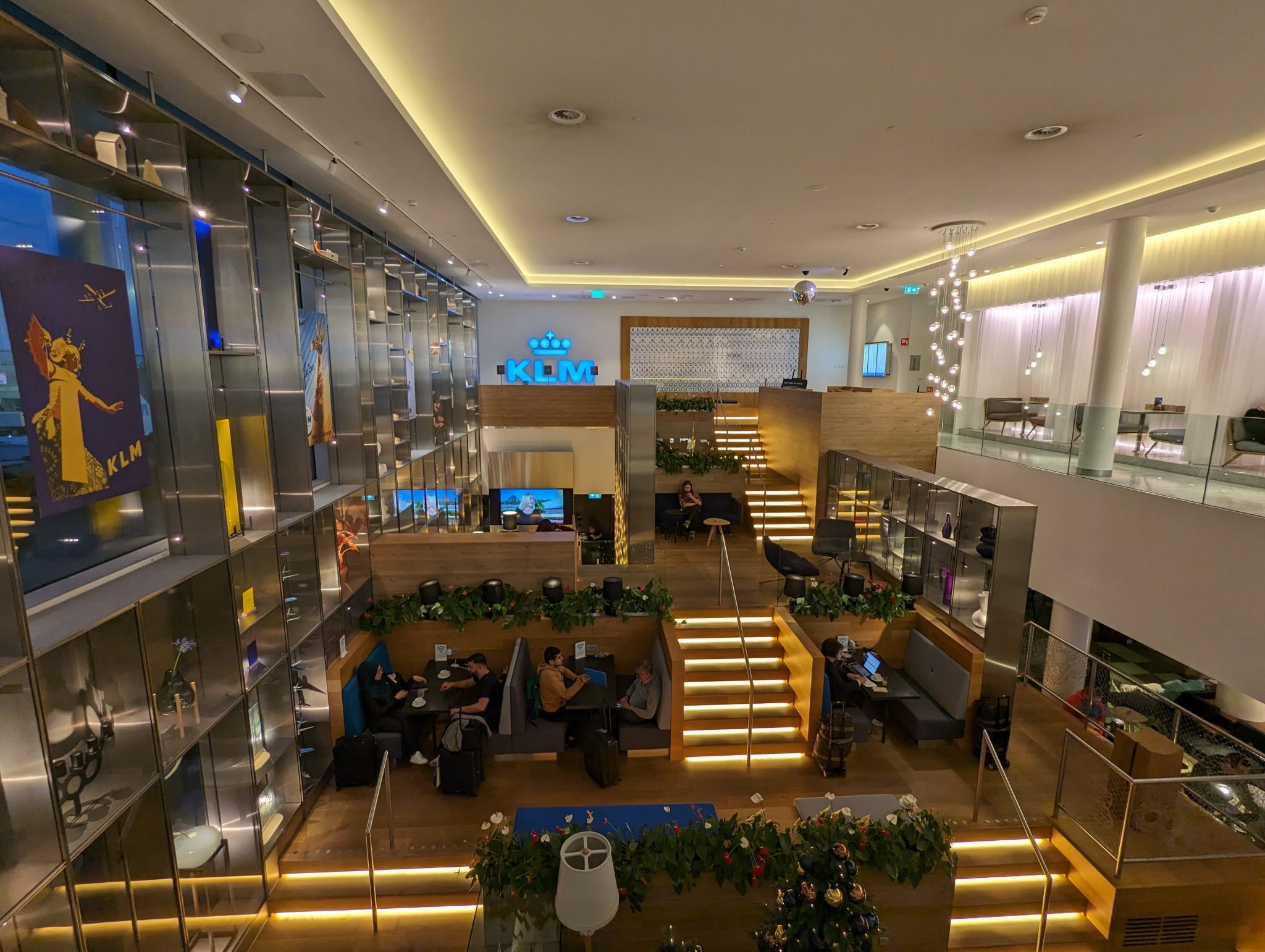 After passing through security I make my way to the KLM Crown Lounge. This is one of KLM’s flagship lounges and is an expansive space with lots of cool design elements. Even though its a very large lounge, it does get very crowded in the morning, so actually finding a spot to sit down gets quite challenging. However, I’m happy to explore a bit and one of the key features is its collection of delft blue houses that it prominently displays. Which has added significance given our recent visit to the House of Bols earlier in this trip. Overall its a nice lounge, but when its busy it can get very busy!