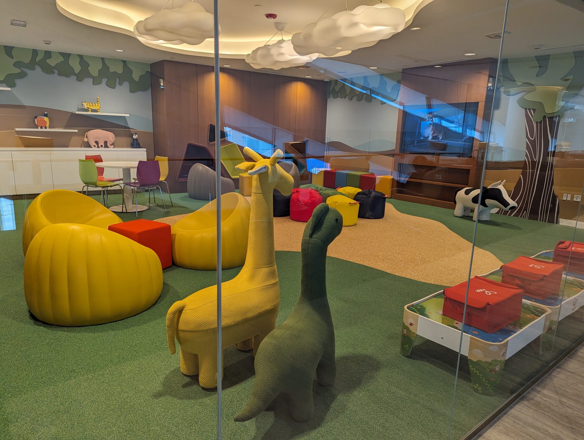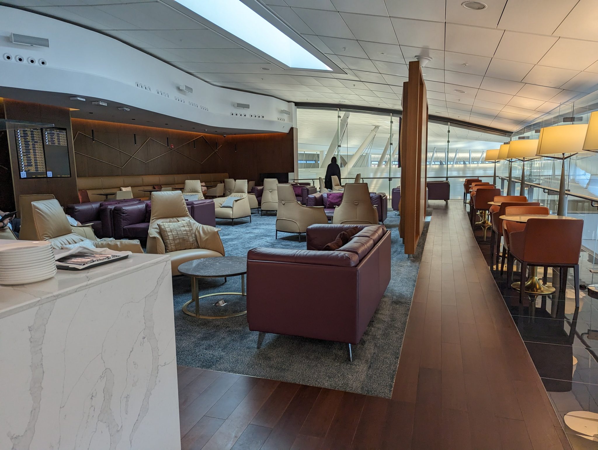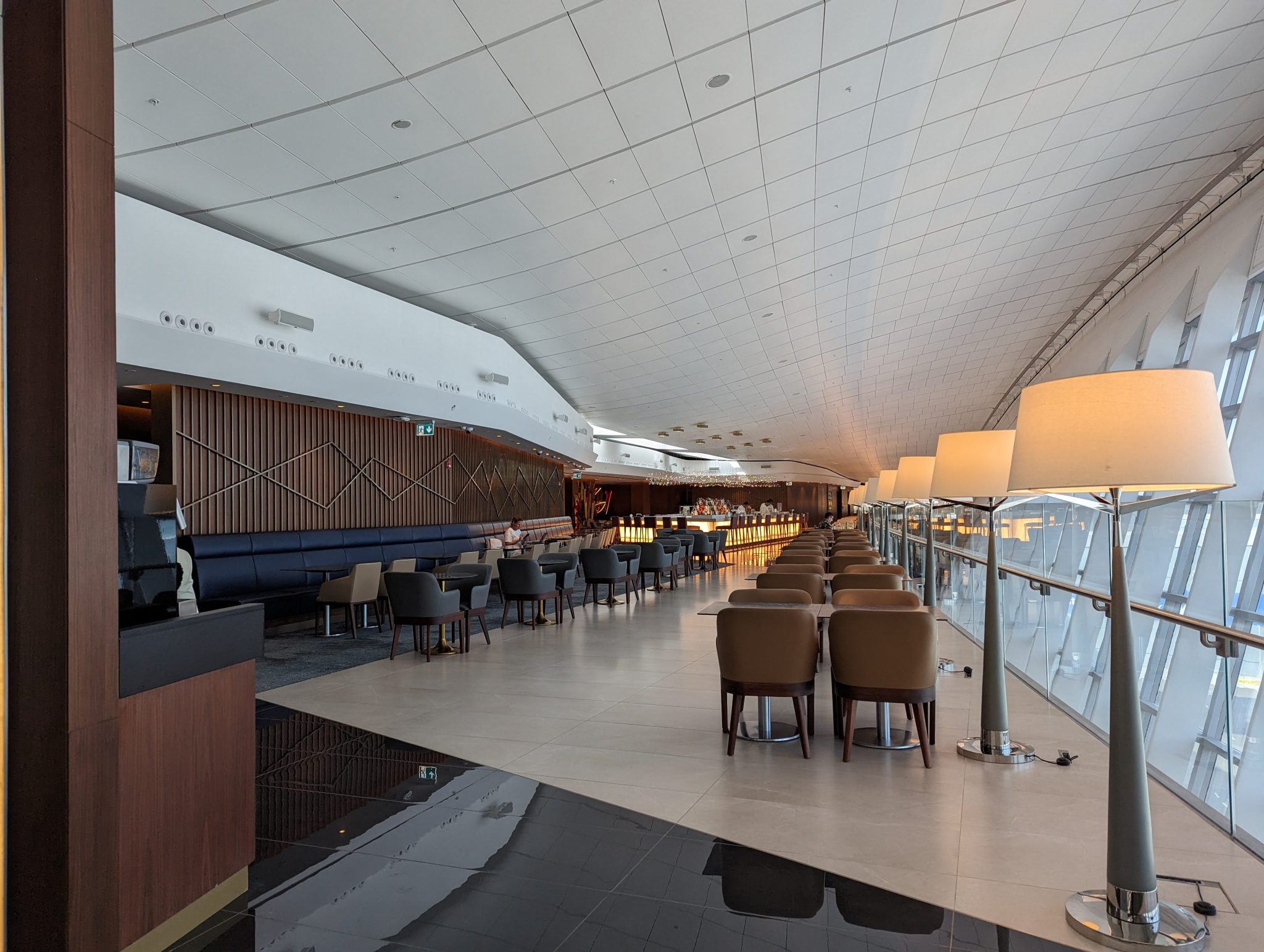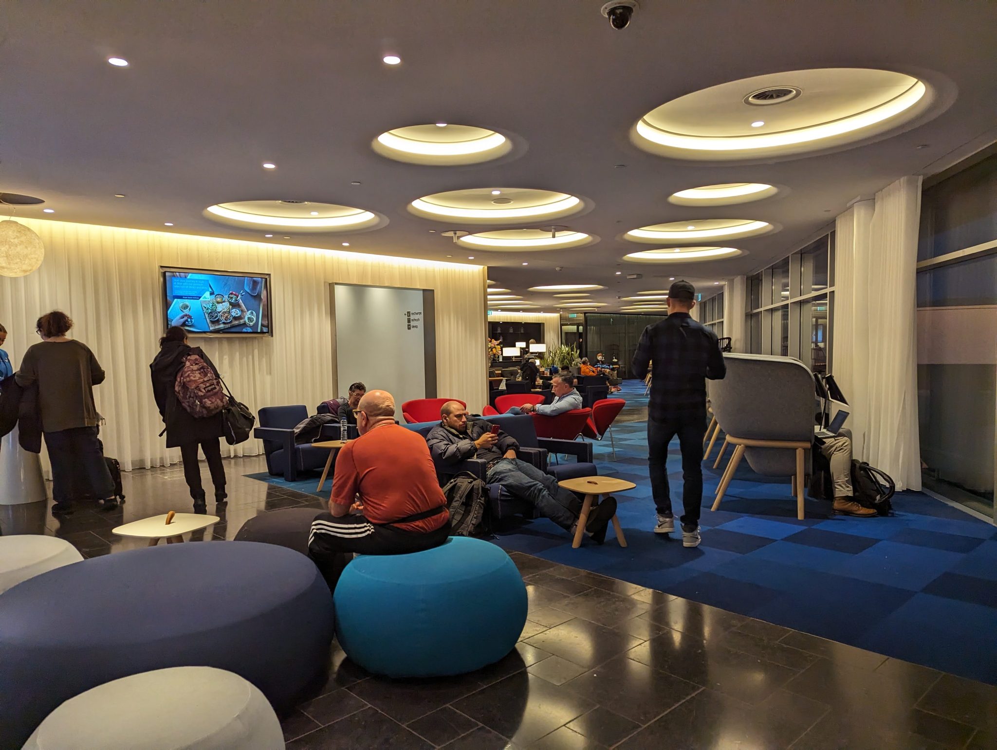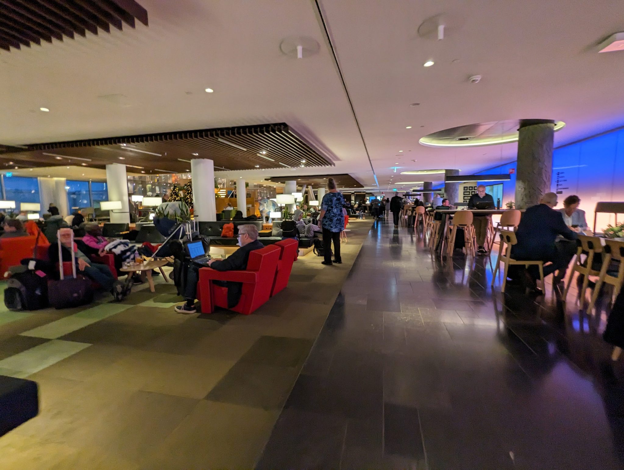 After passing through security I make my way to the KLM Crown Lounge. This is one of KLM’s flagship lounges and is an expansive space with lots of cool design elements. Even though its a very large lounge, it does get very crowded in the morning, so actually finding a spot to sit down gets quite challenging. However, I’m happy to explore a bit and one of the key features is its collection of delft blue houses that it prominently displays. Which has added significance given our recent visit to the House of Bols earlier in this trip. Overall its a nice lounge, but when its busy it can get very busy!