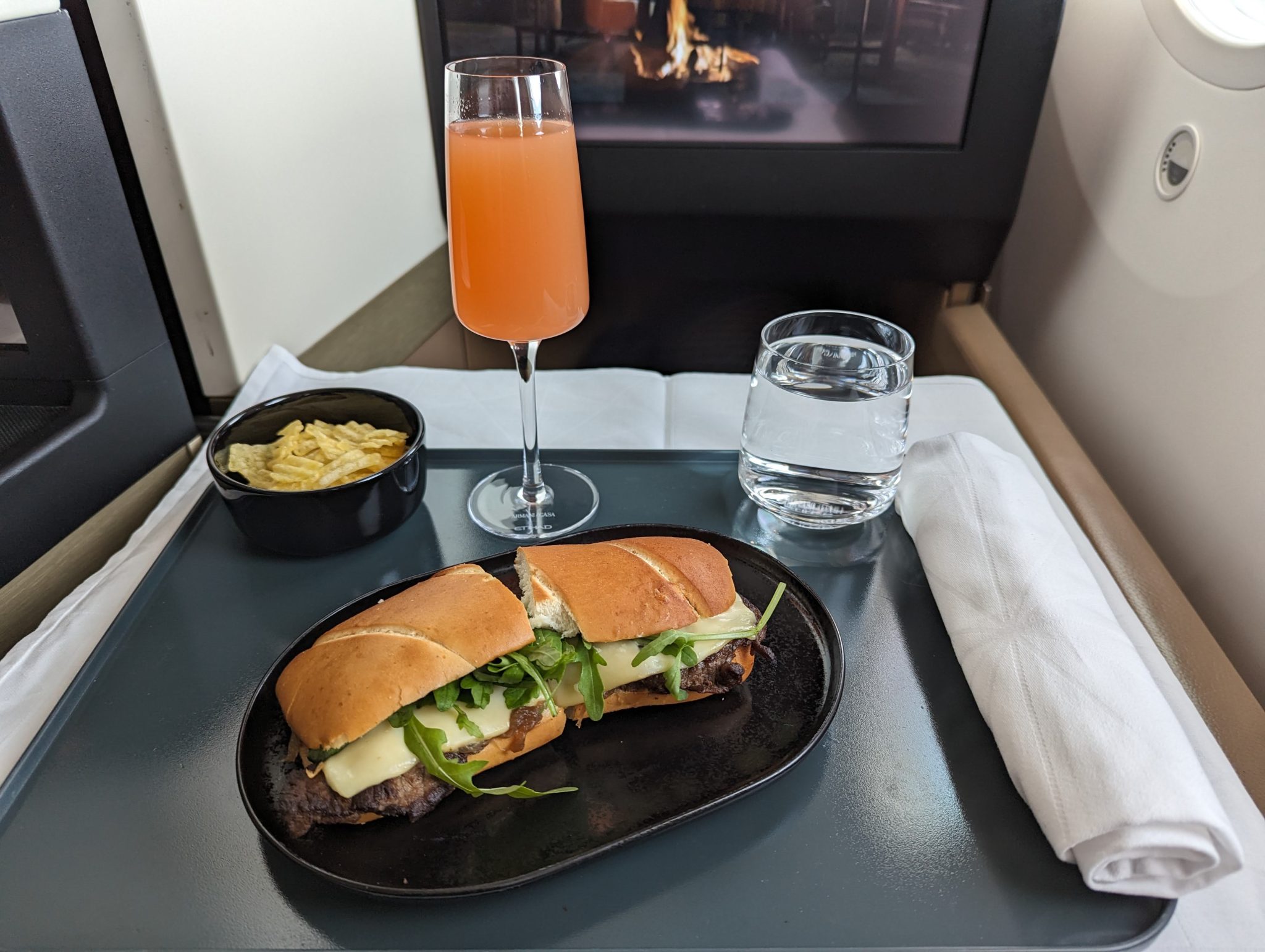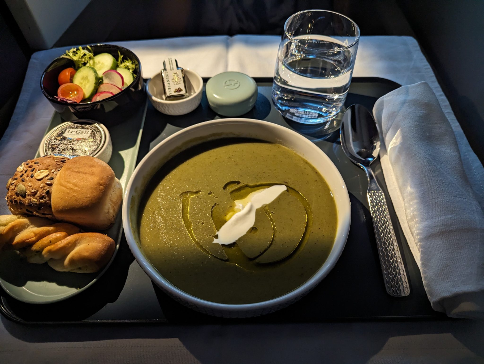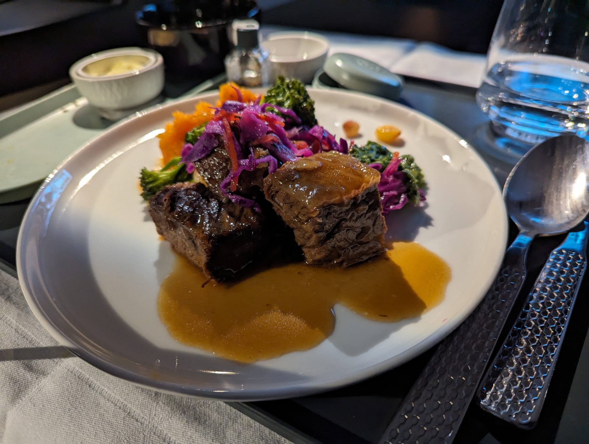 A cool thing about this flight is the “anytime” nature of the food service. Because of the bigger breakfast and snacks at the hotel and airport, I opt for a lighter lunch. This comes in the form of a steak sandwich which Etihad nails! And closer to the latter half of the flight, I have my main meal which is a Green pea and mint soup starter and slow braised beef short rib main. Both are delicious and reinforces that Etihad has some really great food service onboard their planes!