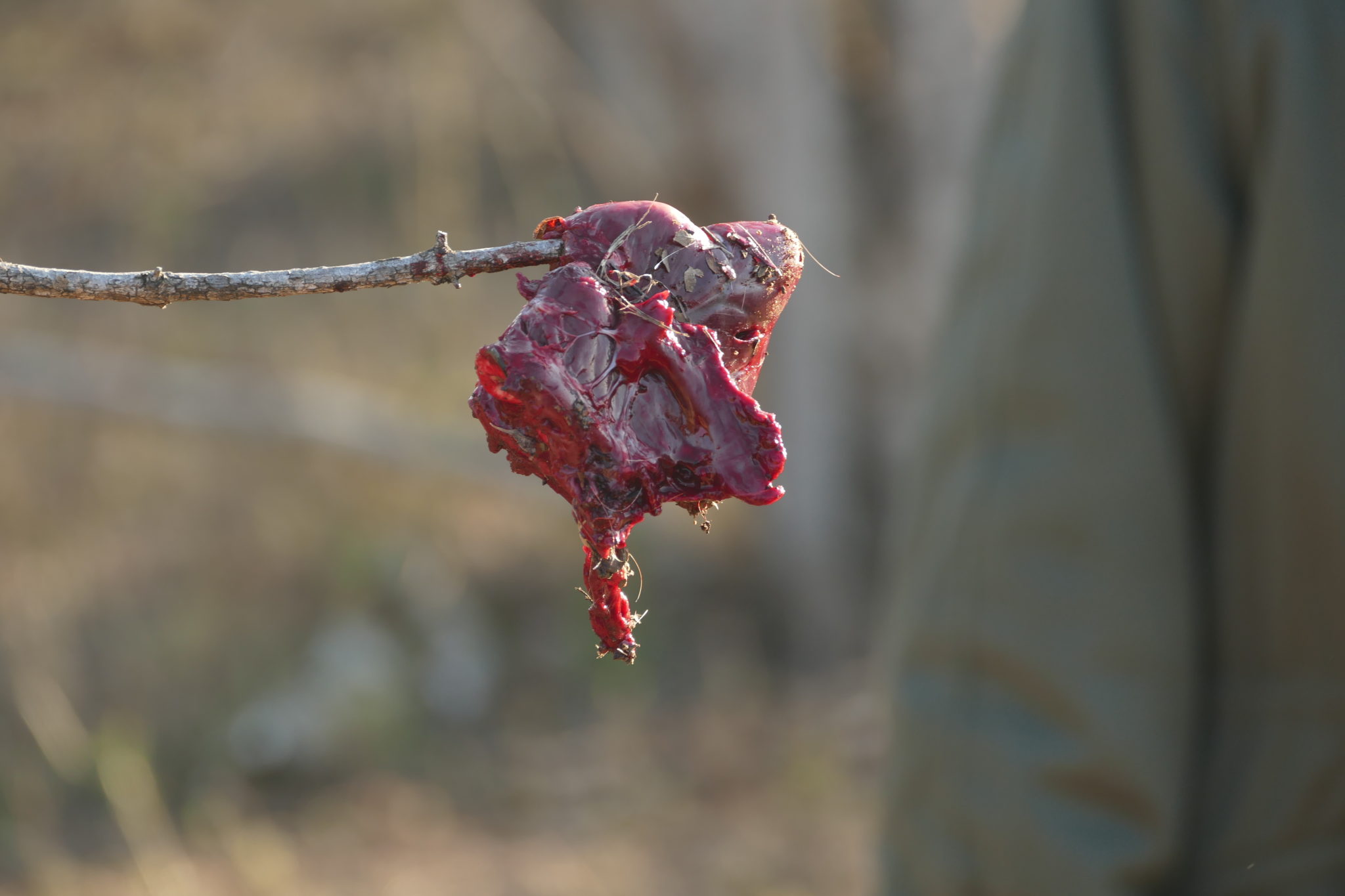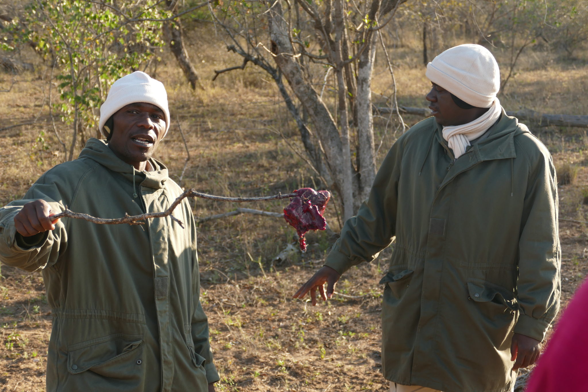 We were on the track of a male lion and circled an area a few times hot on its heels, but unfortunately he alluded us. Raymond then found tracks for a leopard and both he and Matthews hopped off to track it on foot. What they came back with was an Impala heart from a kill the Leopard had made this morning.