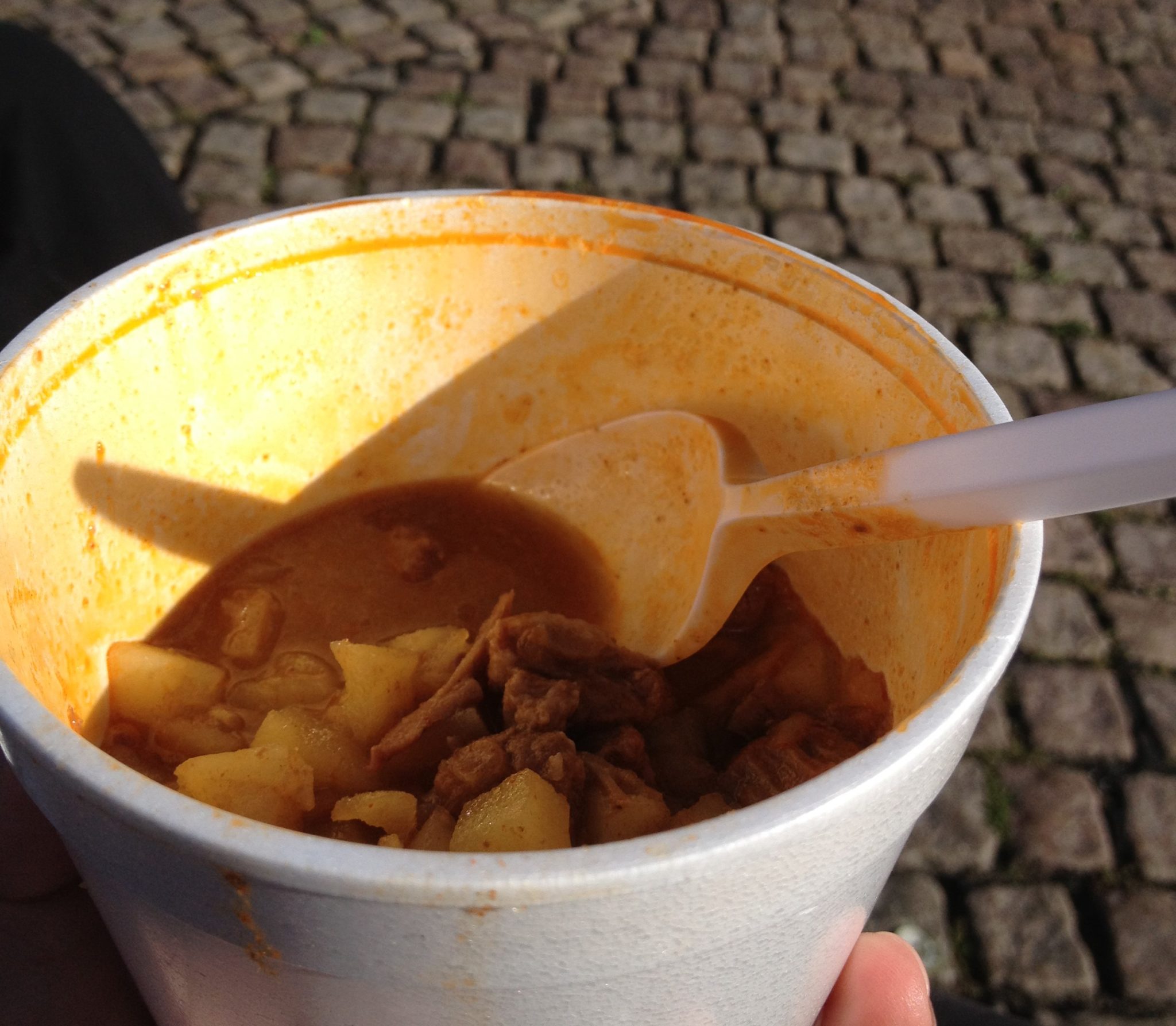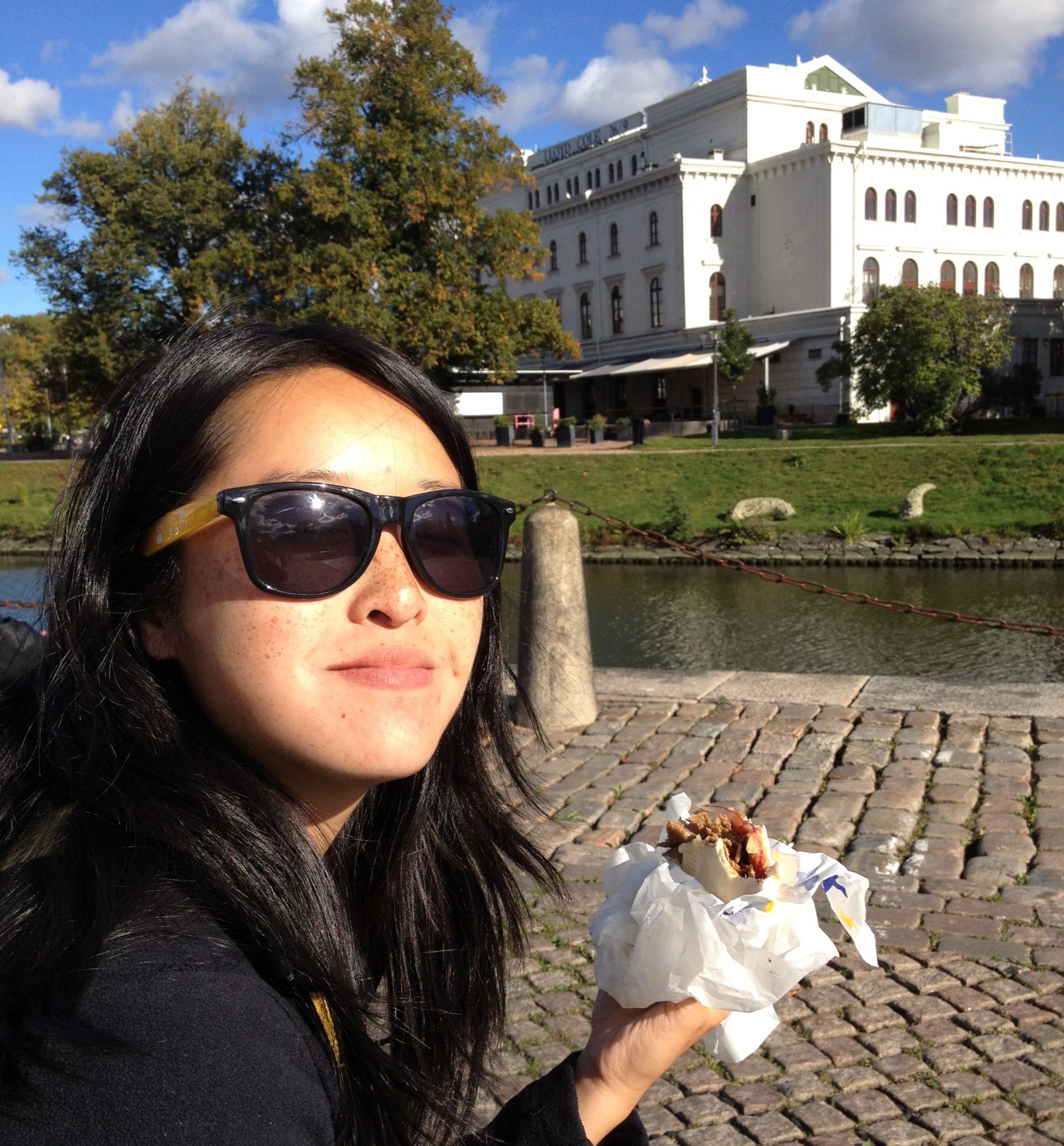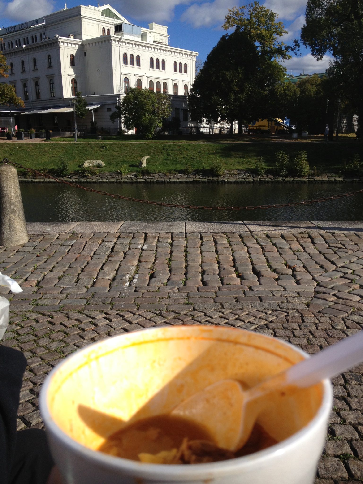 We headed back towards the center of the city for lunch. We had read about this food market that we really wanted to try called Saluhallen. Along with ready to eat food, there are things like spices, coffee, cheese and other items for sale. My sister ordered a donair while I picked up a goulash (I was feeling “stew”/”soupy”). We decided to take advantage of the beautiful weather and found a park bench along the water to sit and eat.