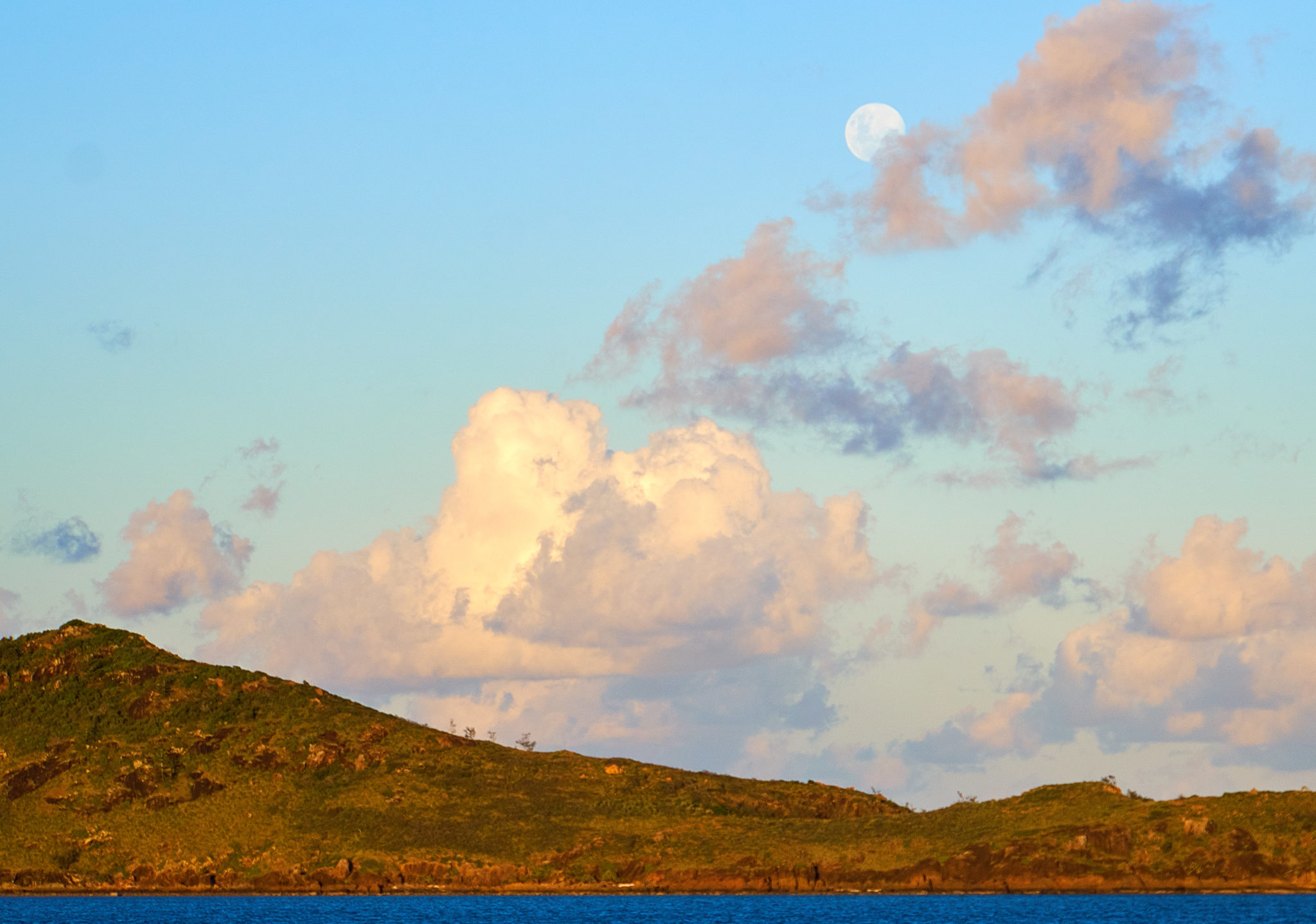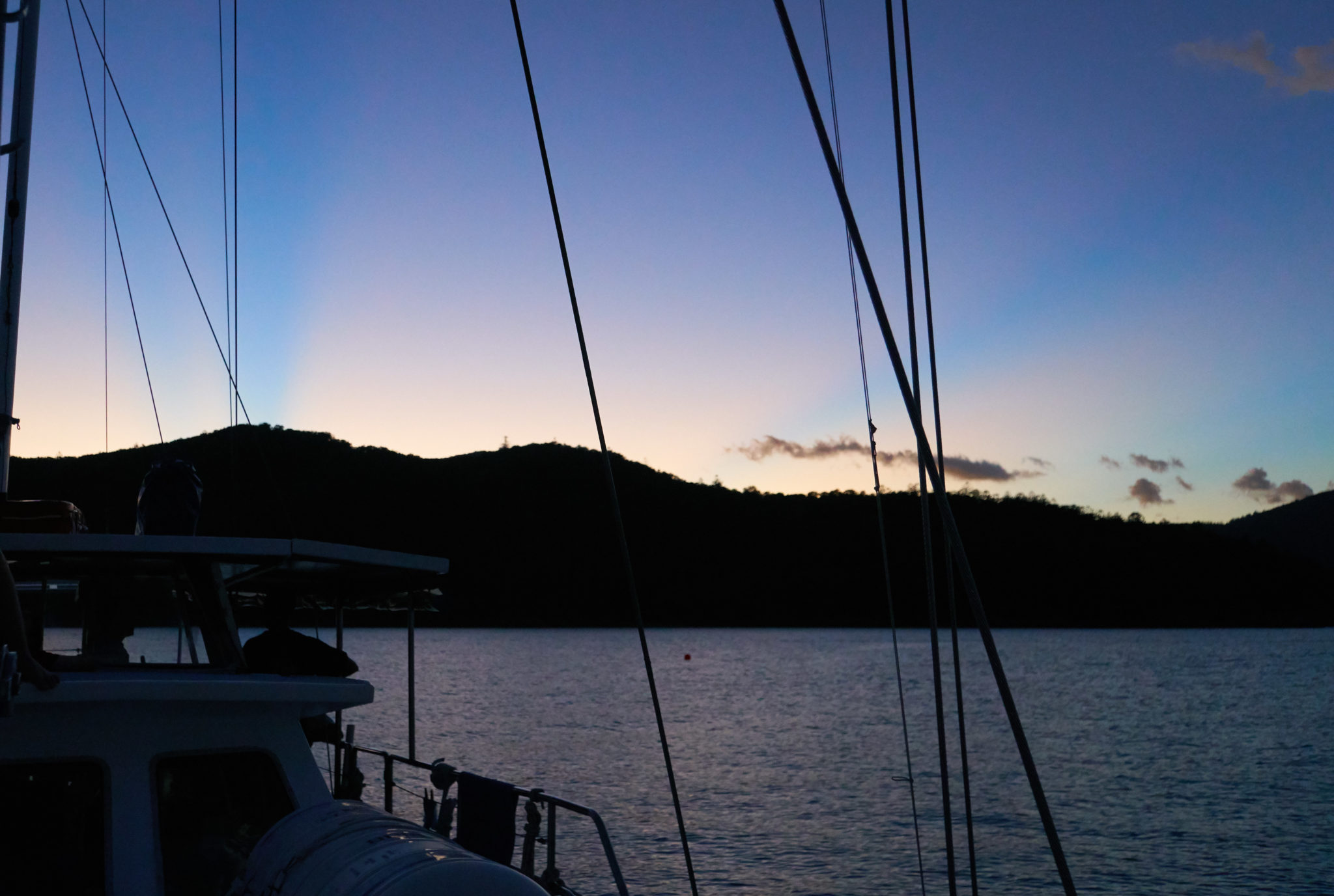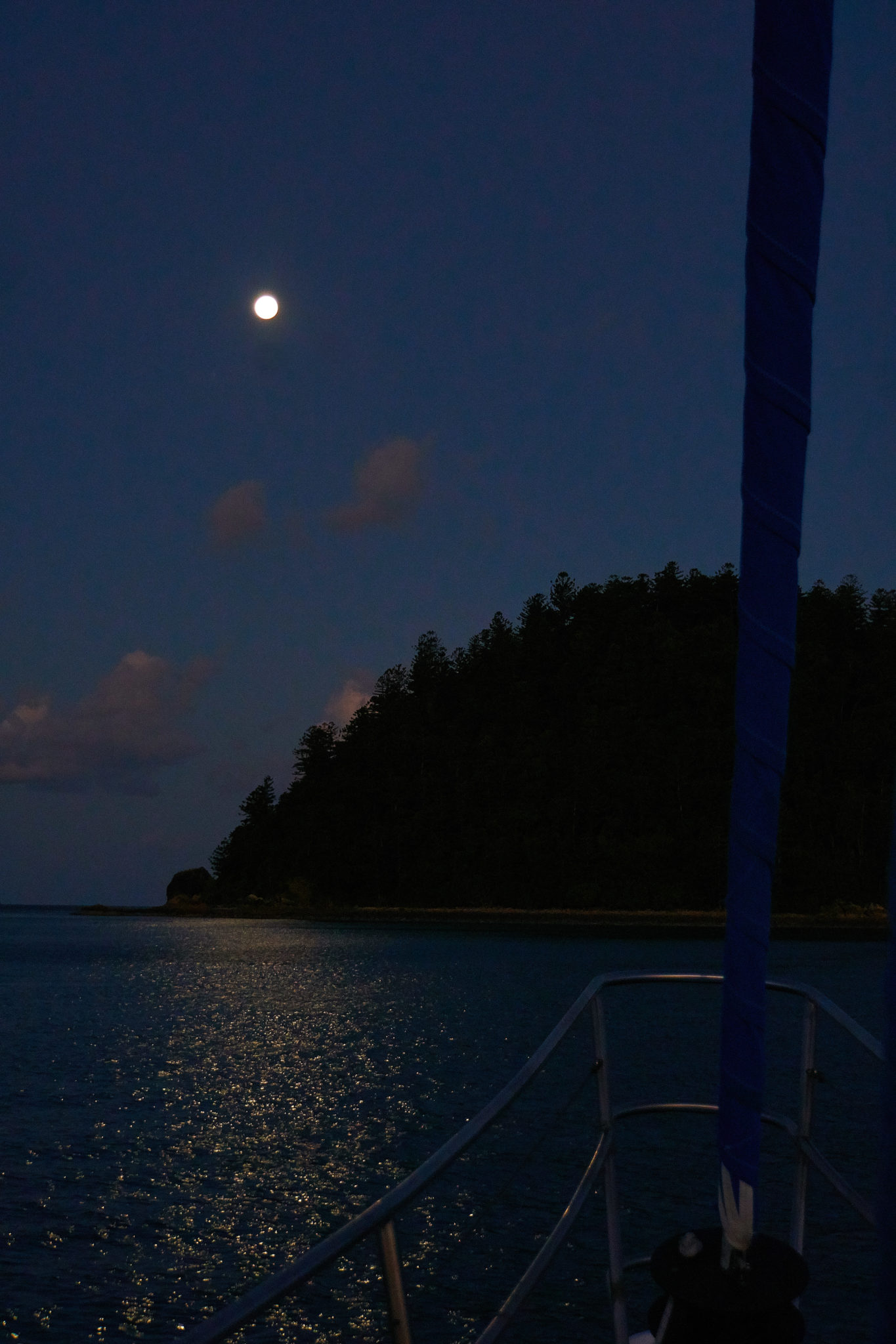 By the time we anchored near Whitehaven beach, the sun had already set behind the Island. There was this neat banding that occurred (I did push the colour in the photo to highlight it) and it was just another reminder of that time in Tasmania, Photos and I got to see the Southern Lights! The moon was also out in full force and was really strong even when the sun was nowhere to be seen!