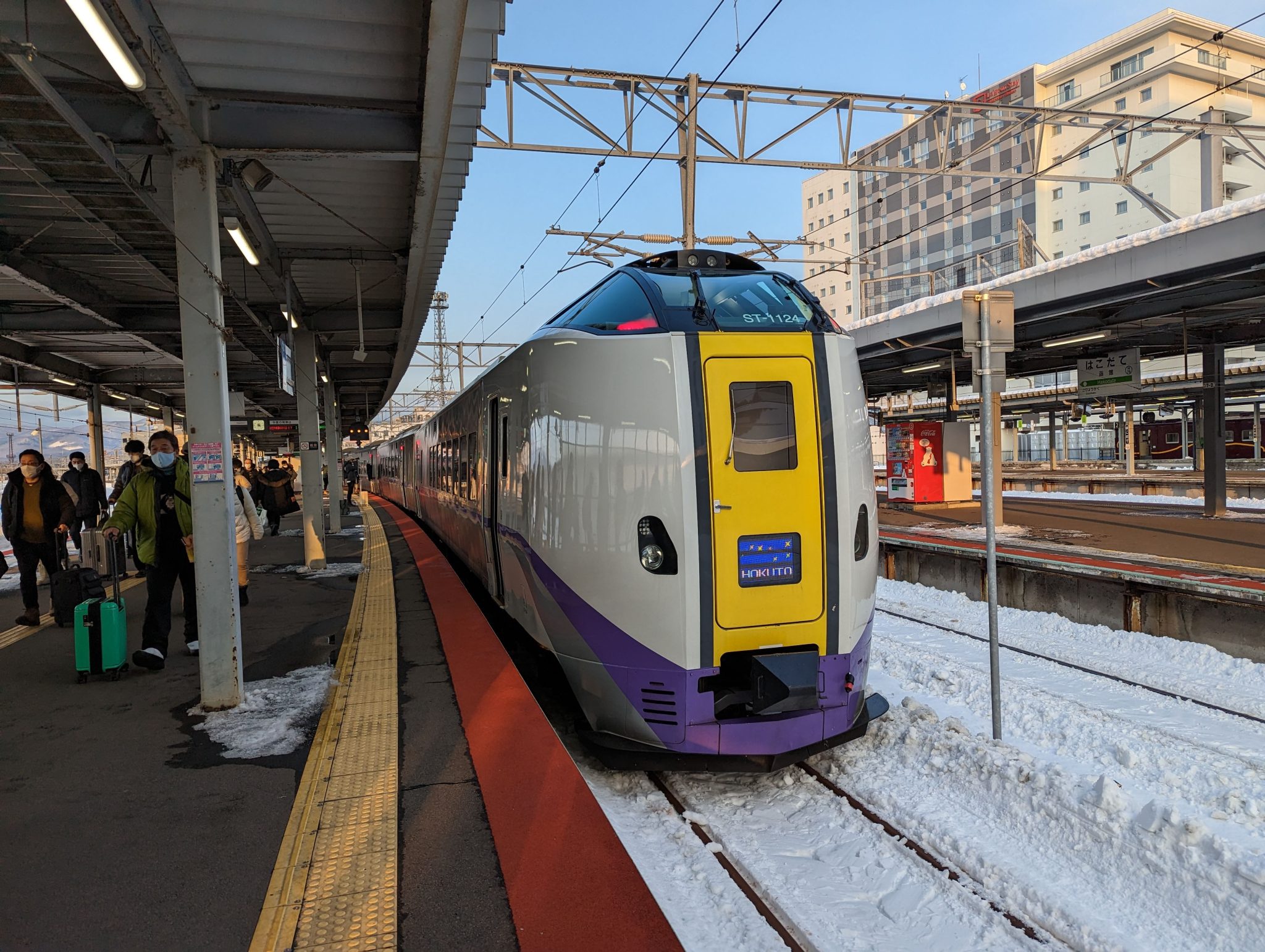 Regardless, I’m fairly excited for this part of the journey. In my research this train trip is supposed to be incredibly picturesque. Add in more snowy landscape and you have the makings of a very enjoyable and scenic ride to Hakodate! As with all trains in Japan, boarding is incredibly efficient and we are off within minutes. And as expected, my eyes are glued to my window for a majority of the trip taking in all the breathtaking mountain and sea views! Pro Tip: If you are travelling south, get a seat facing “left” and a seat on the “right” heading North.