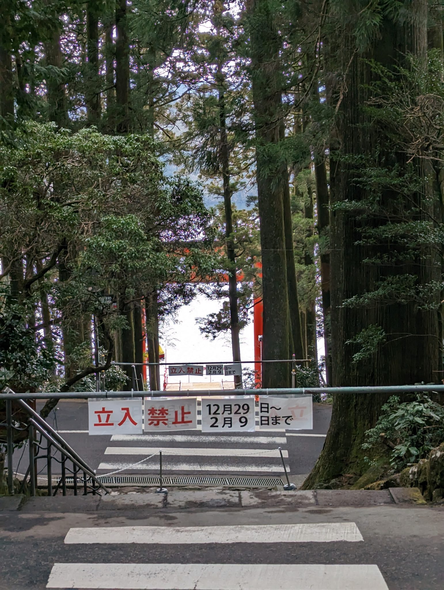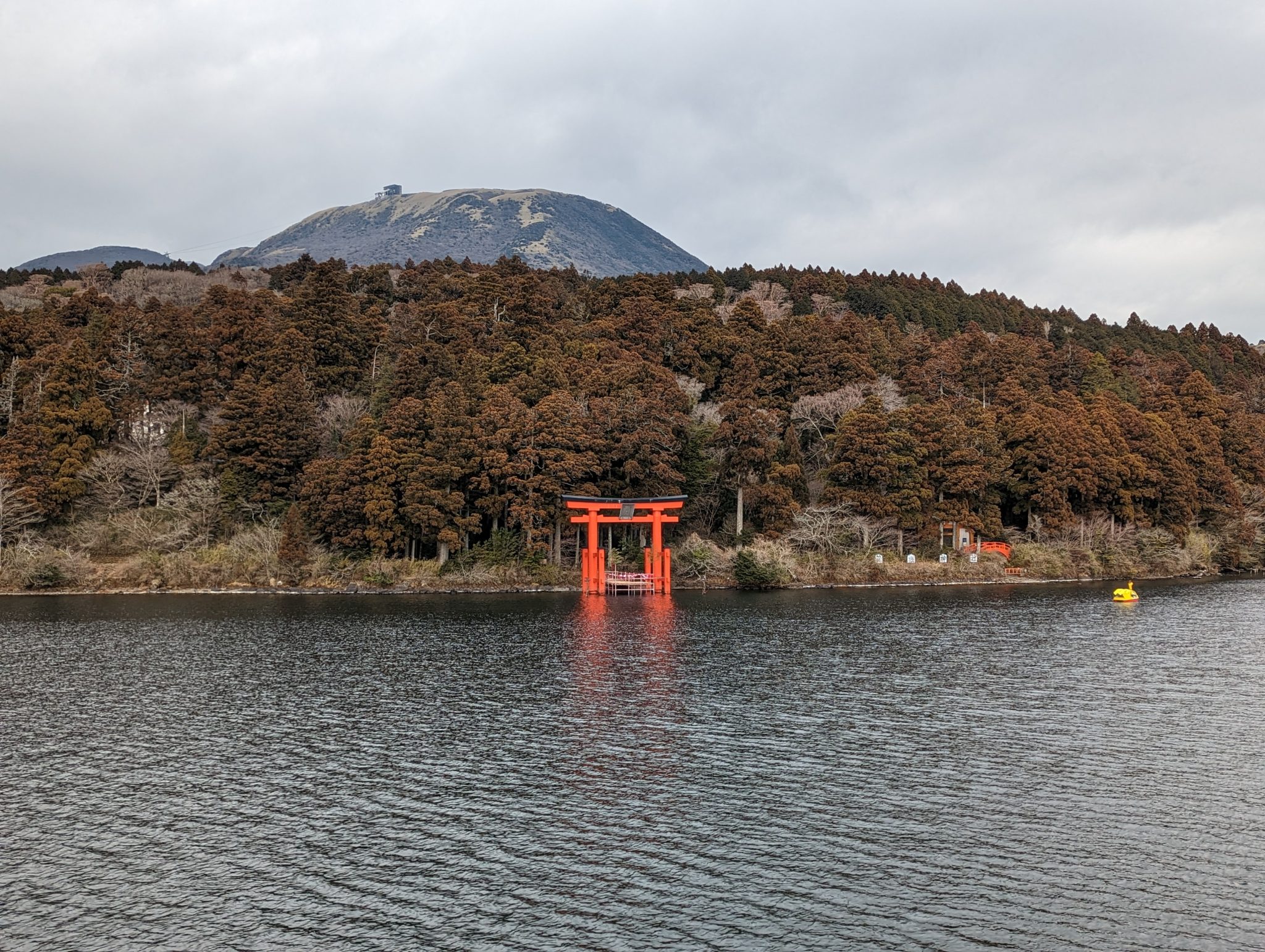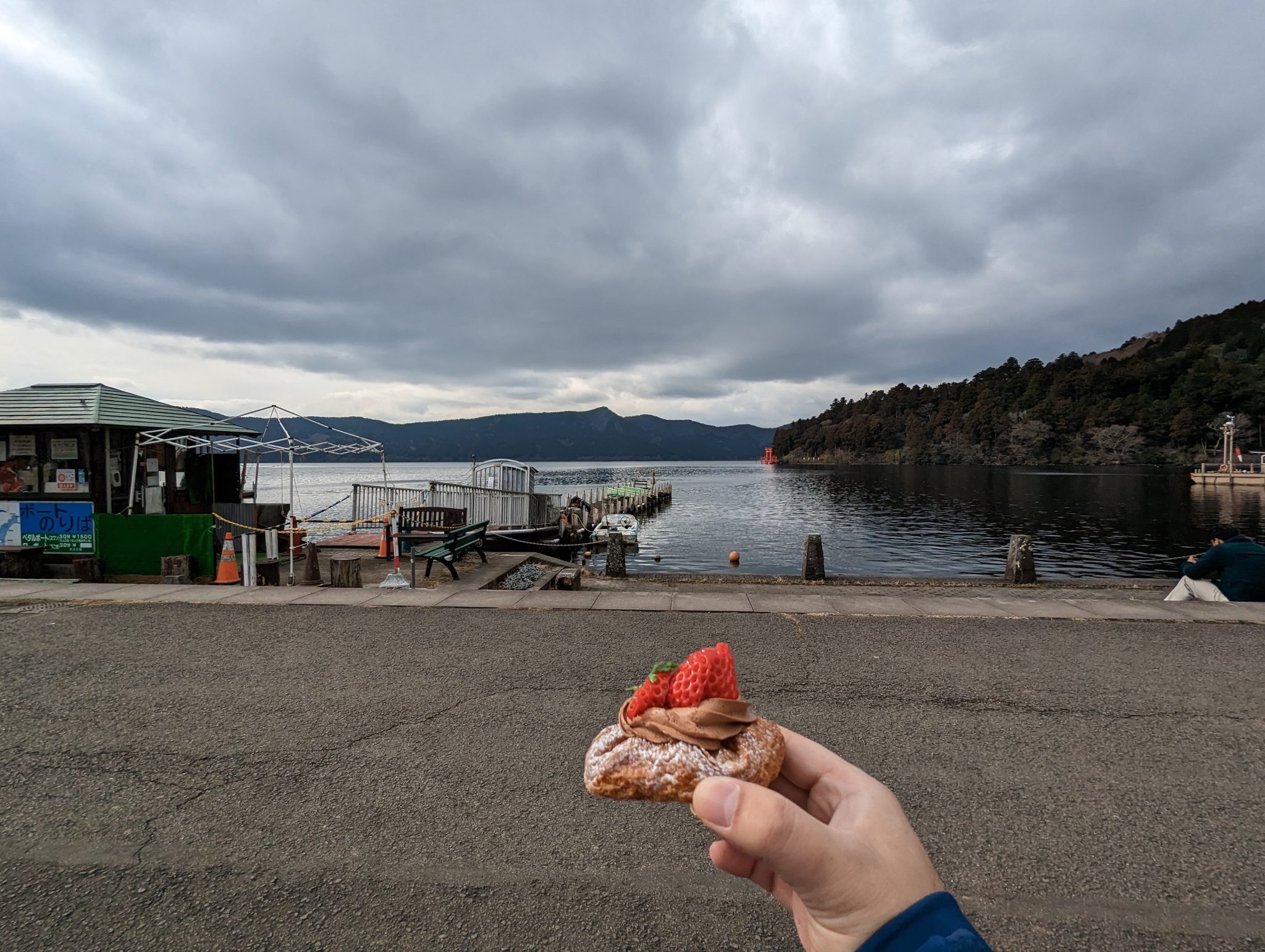 Upon arriving at Lake Ashi, I have a little time to kill before I’m to board the ship to continue the round course. Nearby is the Hakone-Jinja Shrine which has a floating Torii gate that is quite popular for tourists to take photos of. It’s a short walk from my bus stop, but unfortunately when I get there, I find that the torri gate is closed to the public. While its a small bummer, I head back to the dock and drown my sorrow in some coffee and a very tasty strawberry pastry
