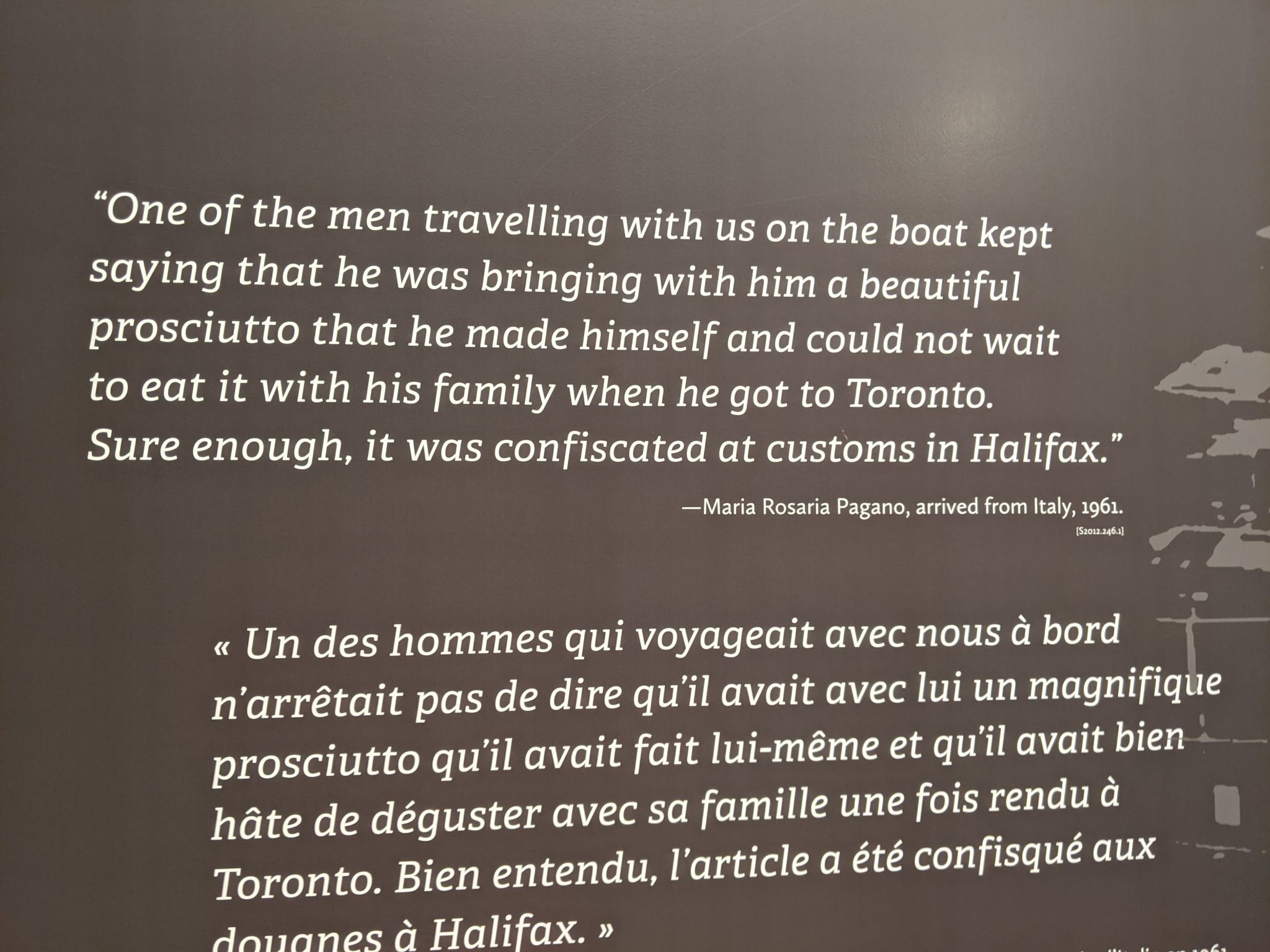 The museum is both a historical record of Canada’s immigration policies throughout history. And also a celebration of the diversity that is Canada today. It doesn’t shy away from some of the less inclusive policies and approaches in the past. But it also celebrates the larger diversity that makes up Canada today too. I especially liked going through past historical immigration stories and even chuckled at the man and his prosciutto (see the image). All in all, I think this is a great point of interest for those visiting and would recommend it!