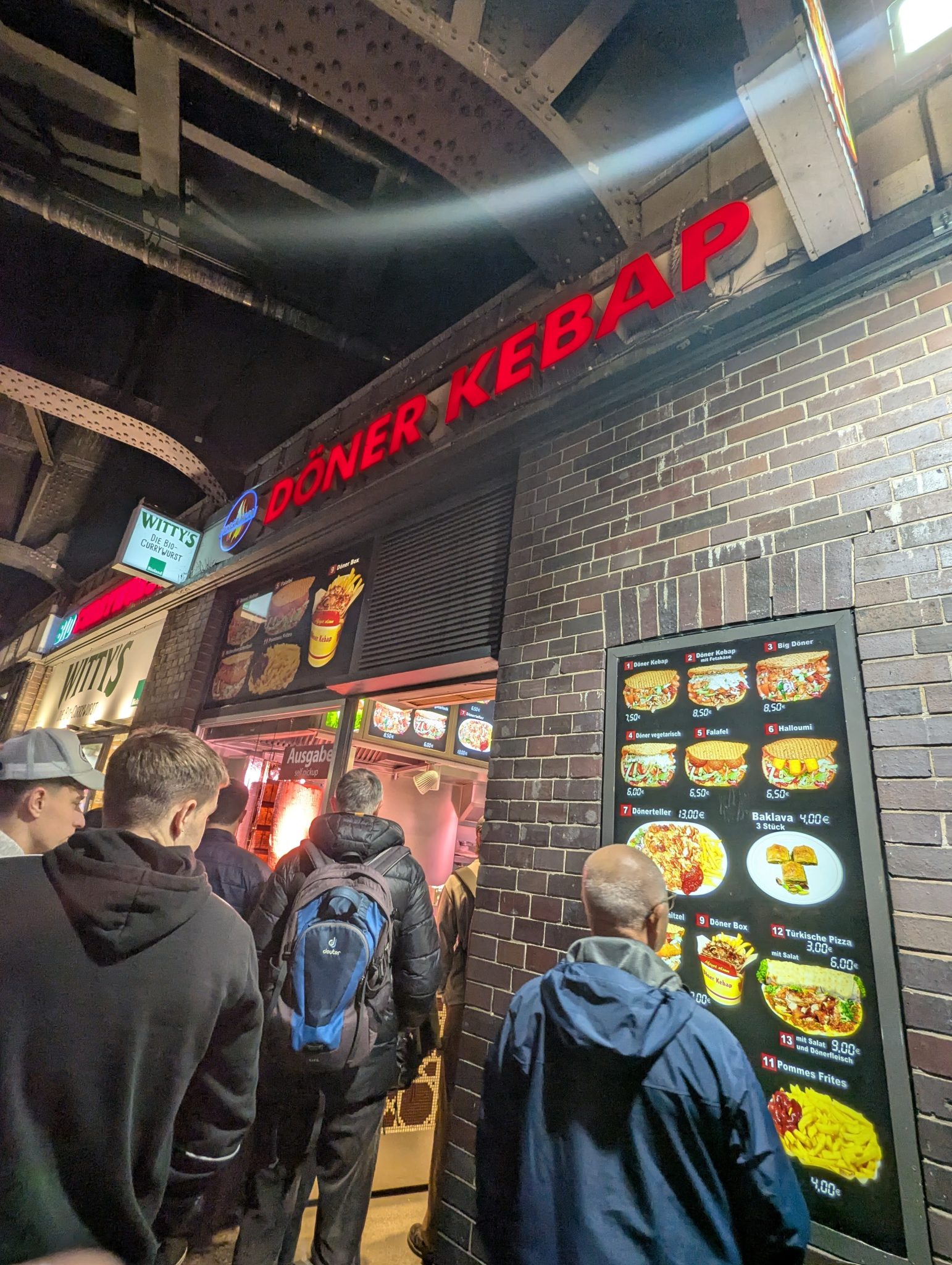 After landing in Berlin, we hop on the train which takes us into the city. Eventually we arrive and check into our hotel which will be our home for the next few days. By the time we are settled its already late afternoon, early evening. We head out and take a quick stroll around our neighbourhood before our thoughts turn to dinner. For our first evening in Berlin, we plan to try a few items that are common German street food: Currywurst and Kebap. Thankfully right across the street from our hotel are two shops that serve these items. Witty’s and Doner Kebap. Since we’re all a bit tired from the travel day, we quickly pick up a few items to share. We gather in the Parents hotel room for dinner and plan out our next day’s activities.