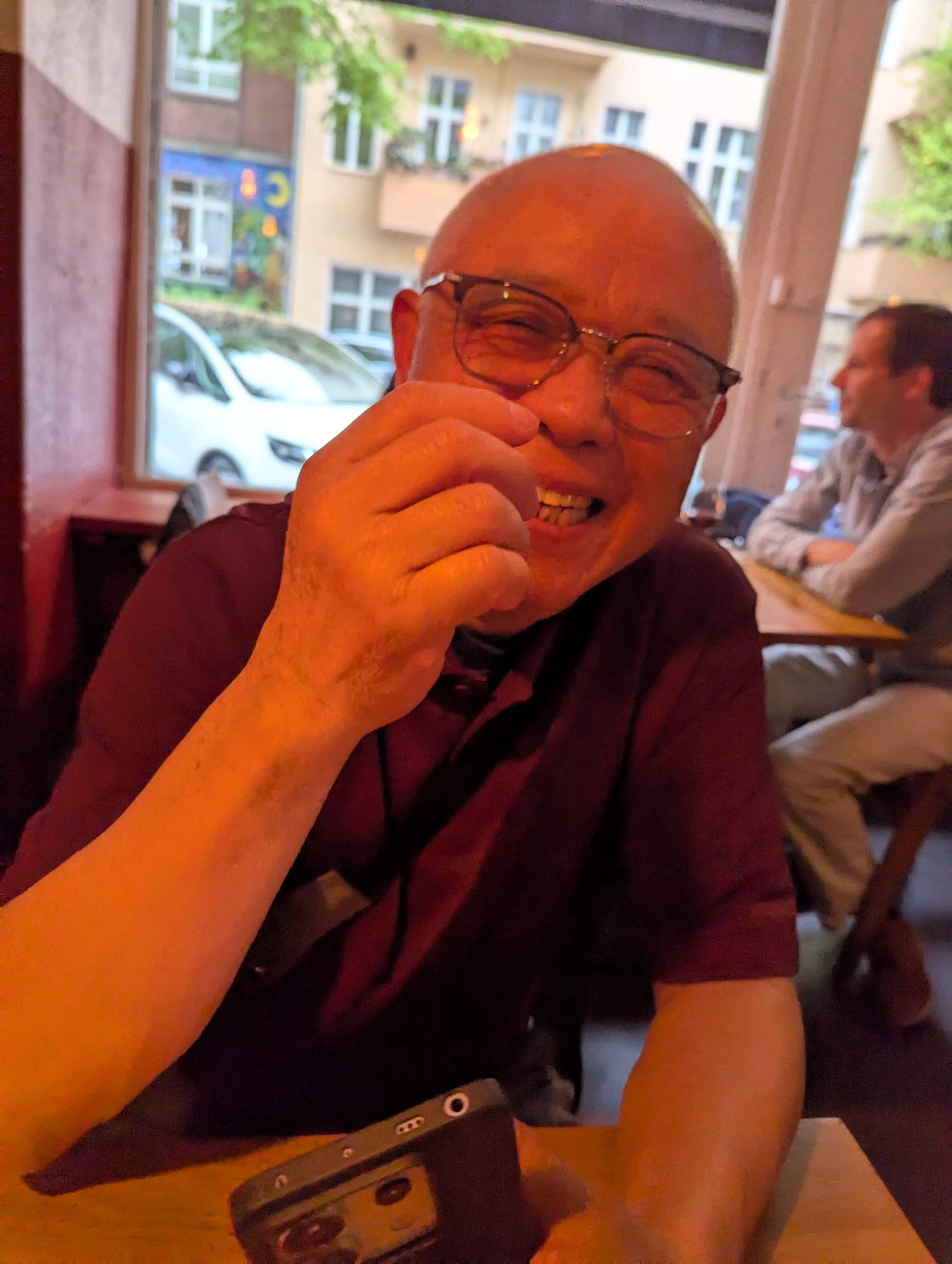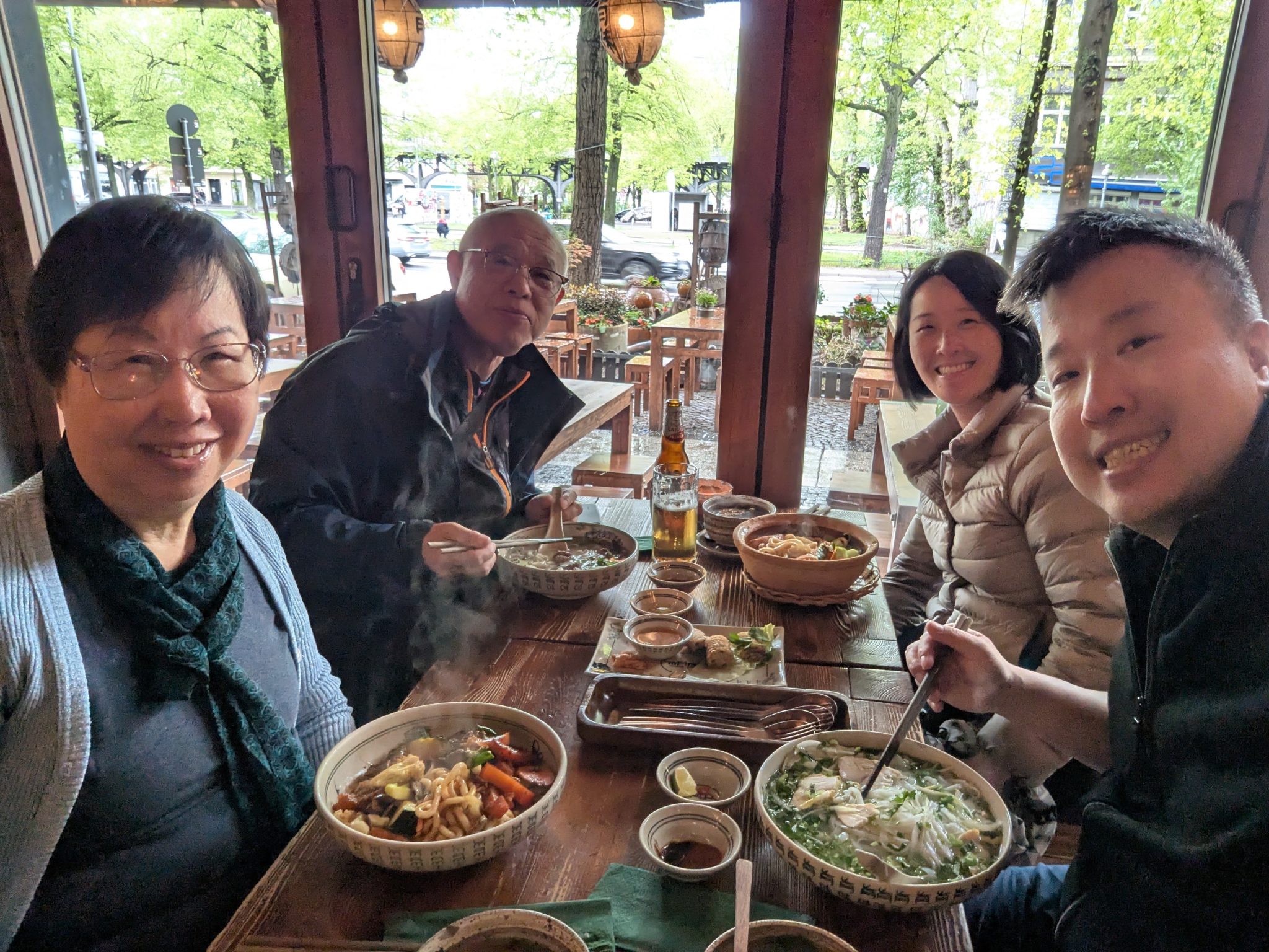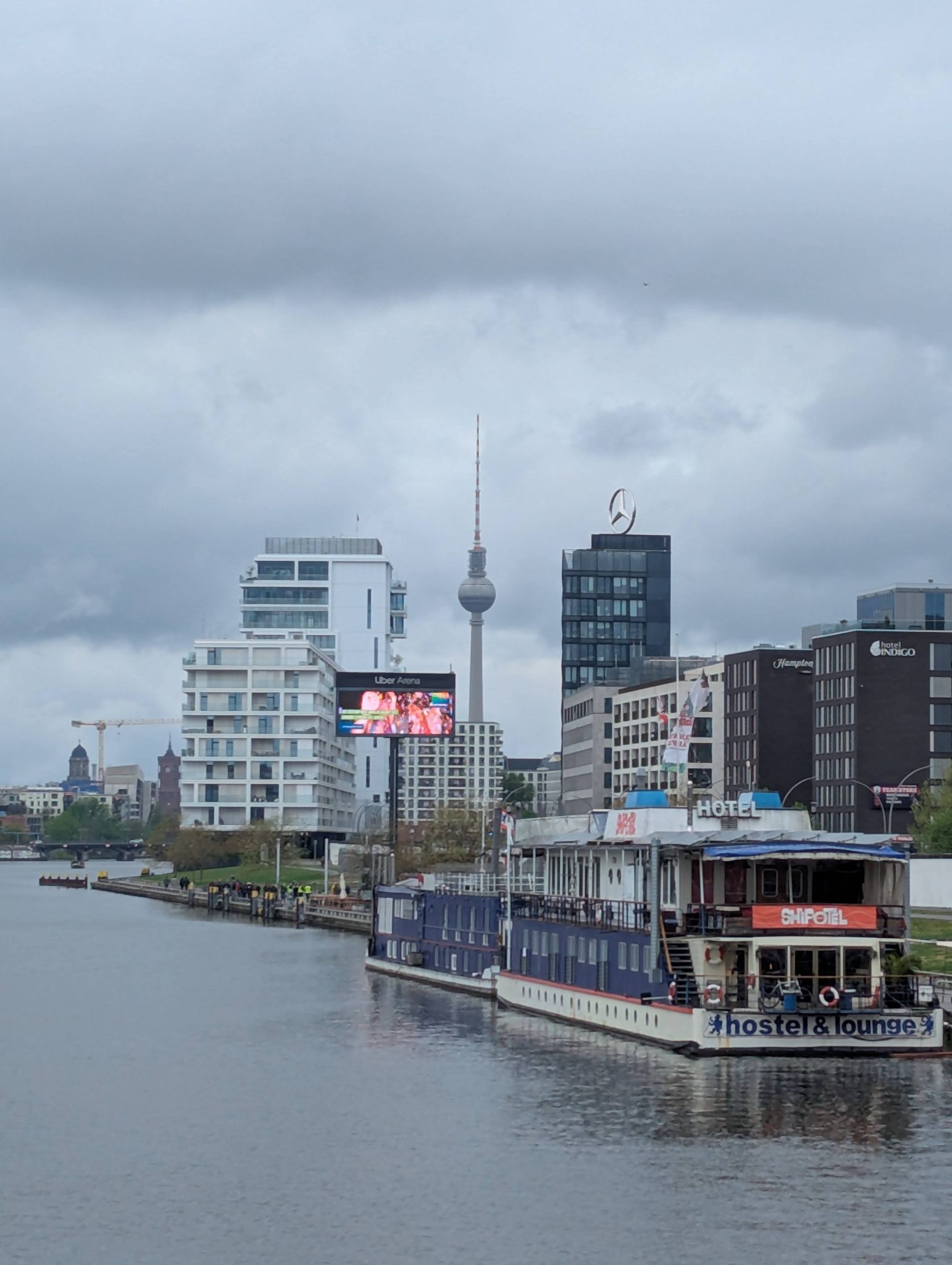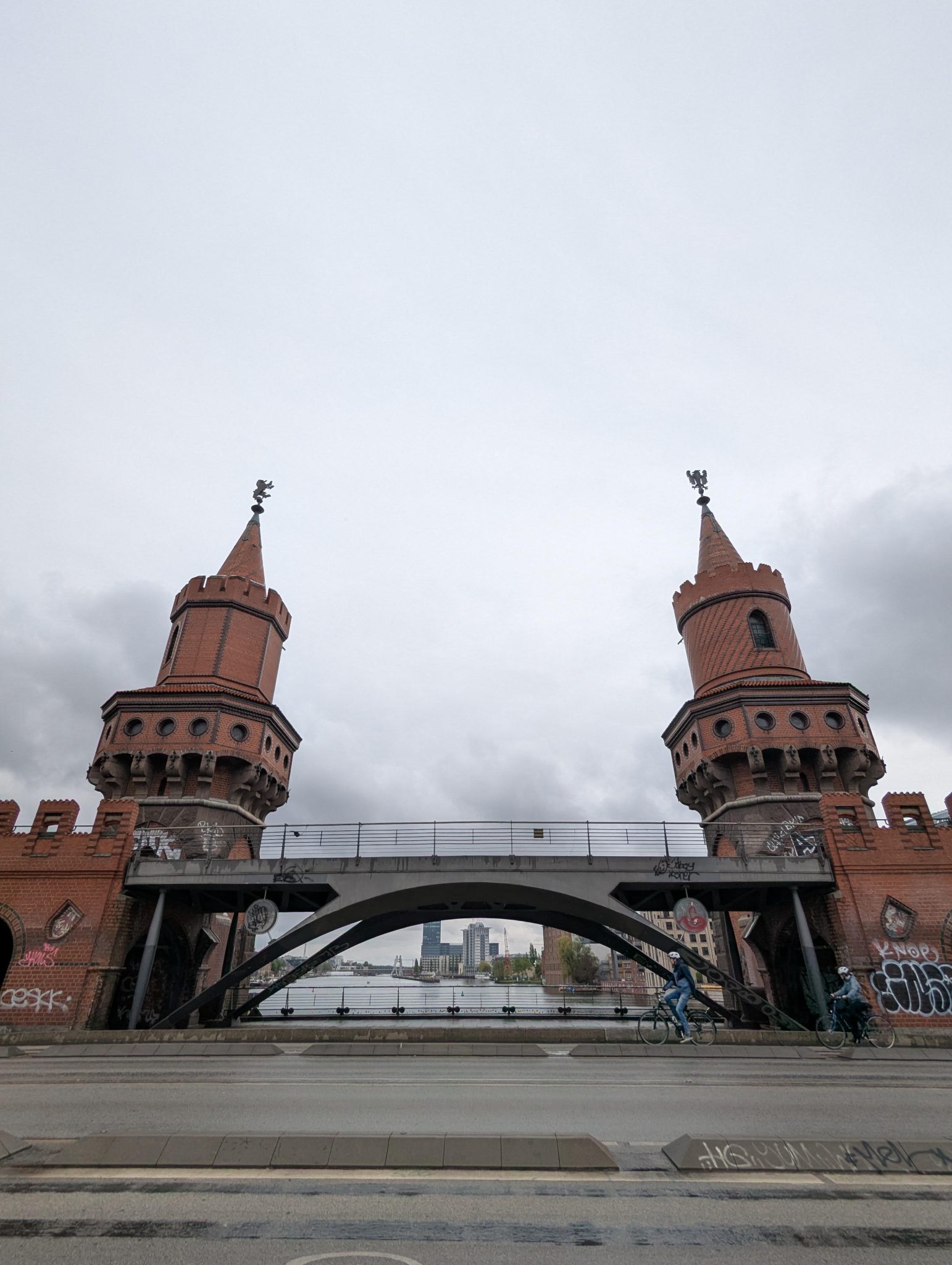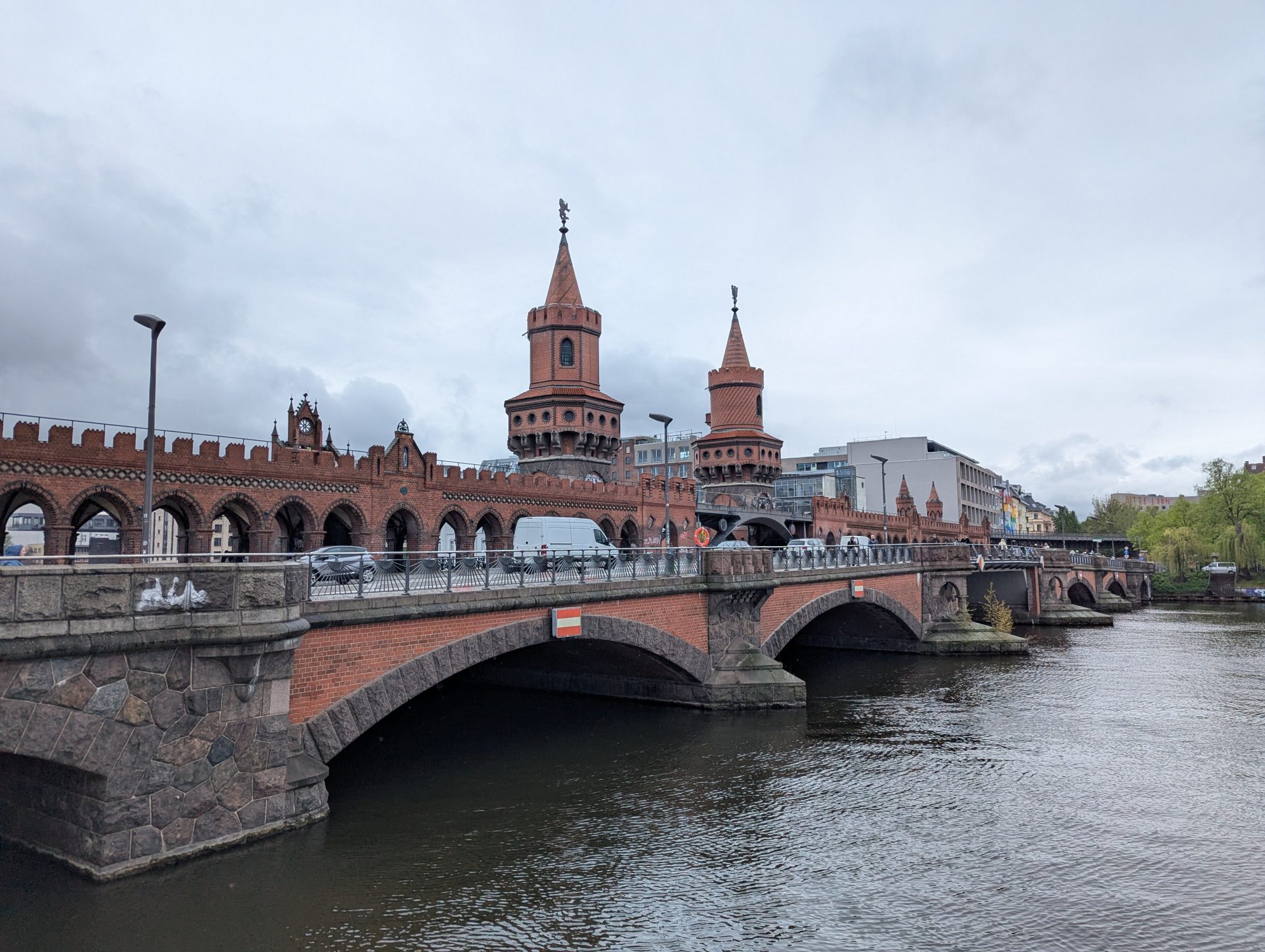 After having coffee at Anima we also start looking at lunch options. Because the weather is a bit cold and grey, we find an Asian restaurant that seems to have some good comfort food options for all of us. So we had in that direction and continue our walk along the wall and water. We eventually need to get across the river to get to the restaurant and get some more great views of the river and Berlin Architecture.