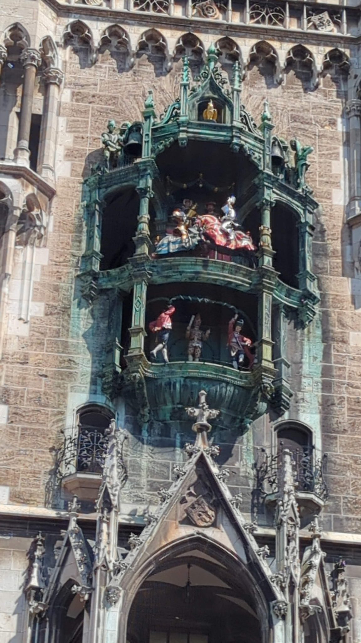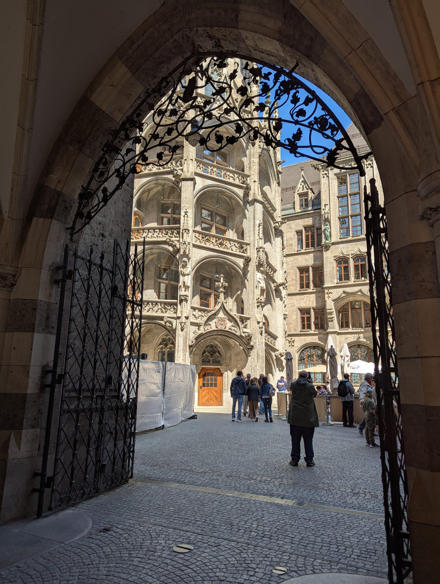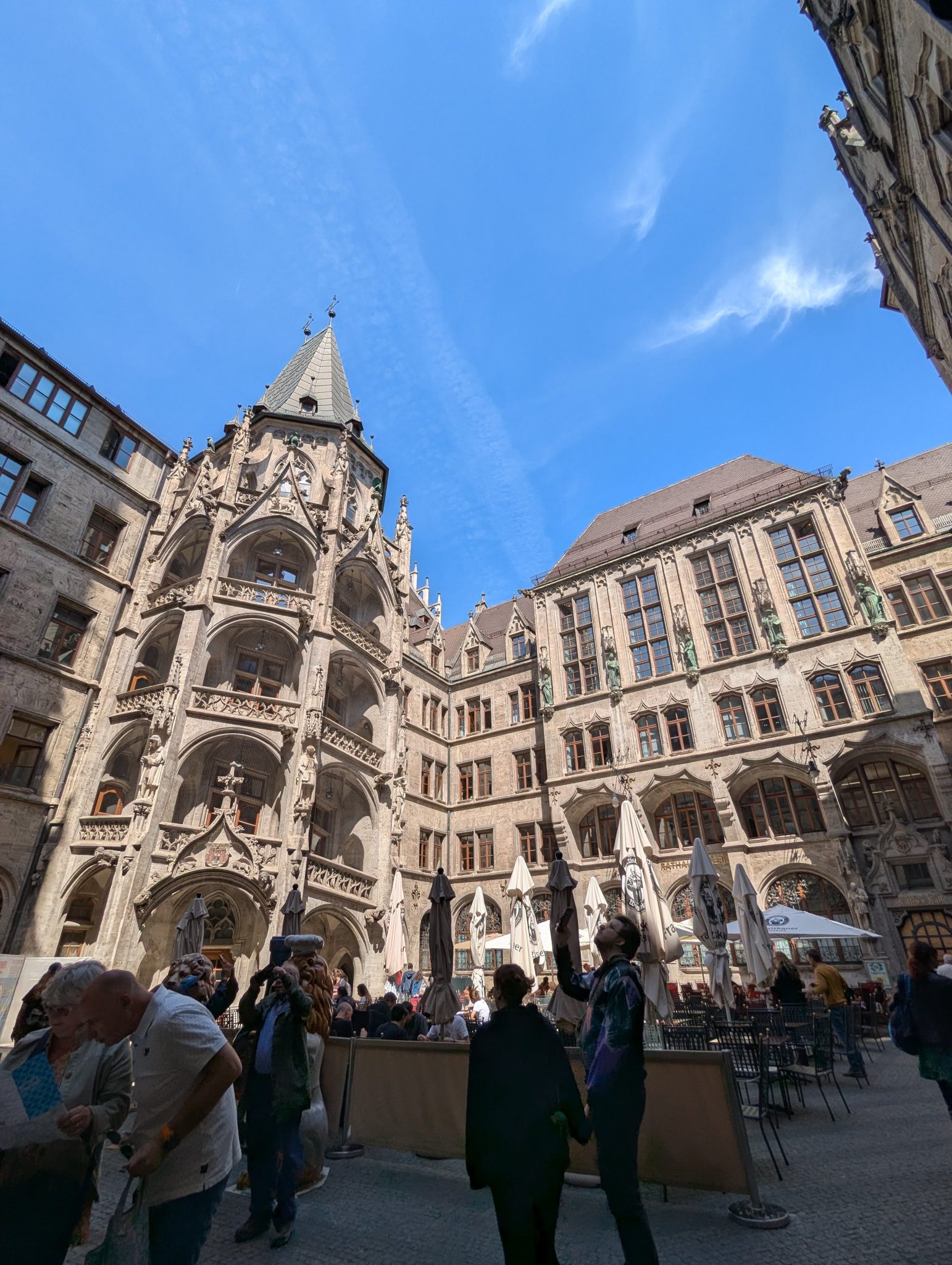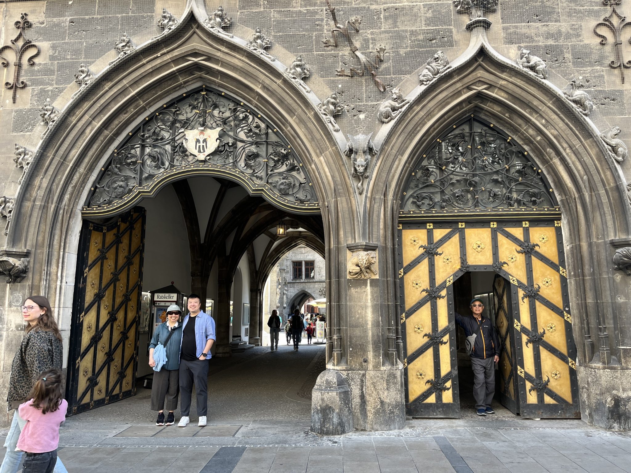 Our first stop is Marienplatz, which is home to the famous Glockenspiel. The Glockenspiel is a large mechanical clock that at certain times in the day will have moving figures that re-enact scenes from Munich’s history. We get there at around noon just in time to watch the show. Personally, I’d like to think that the show is spectacular. But after the first few minutes of watching the mechanical figures rotating through the scene, it starts to feel repetitive. Maybe I’m not able to appreciate it but with the parts of the crowd thinning I might not be alone. Soon our family enter into the City hall building and find that the architecture elements of the building are a bit more fascinating.