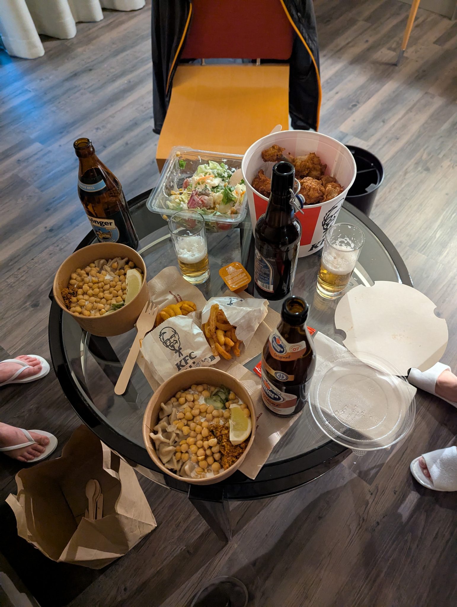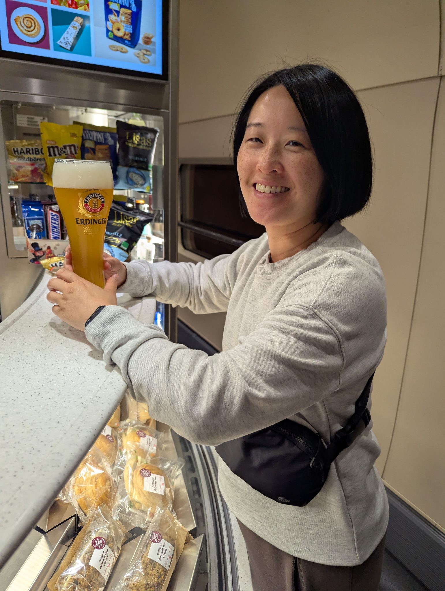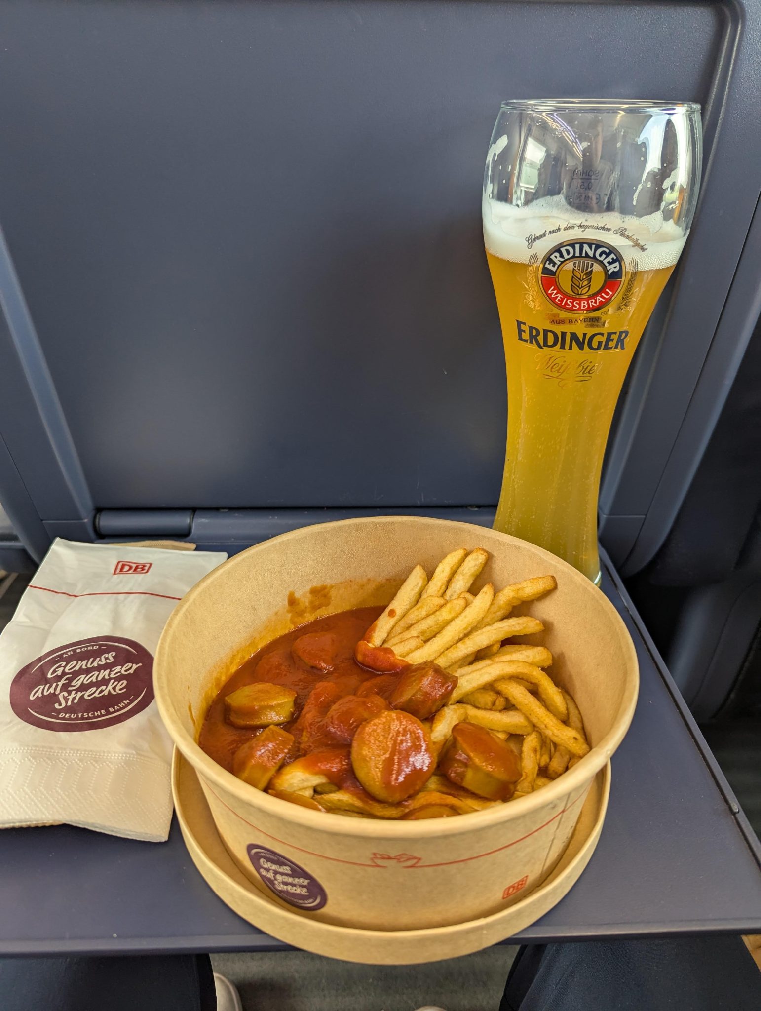 Halfway through the trip the Sister and I head down to the cafeteria car to avail ourselves of some train food. I get to channel my inner “man in seat 61” (IYKYK) a little with an Erdinger beer and curry fries.