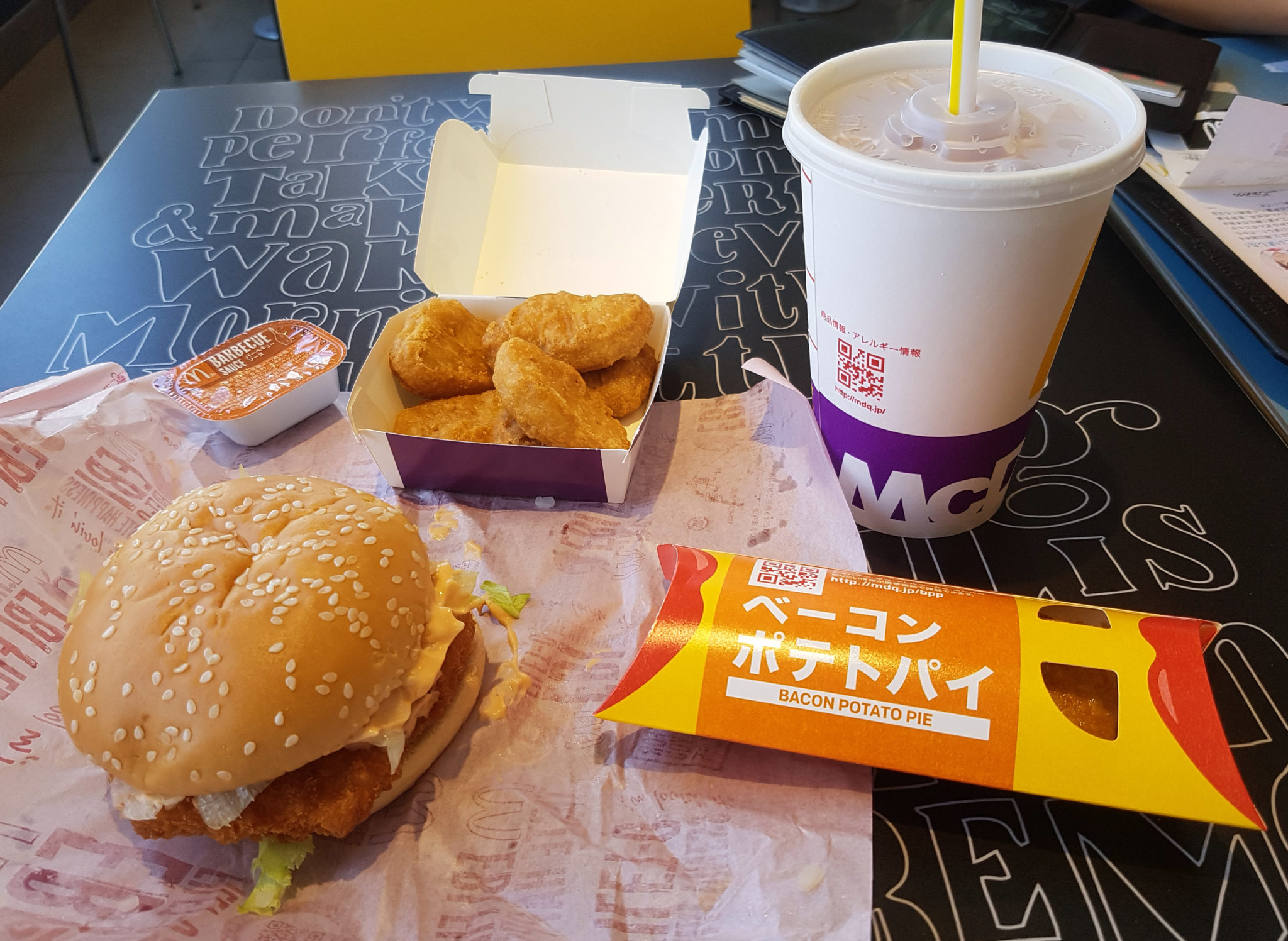 Our first stop was lunch. At some point on this trip we had wanted to visit a mcdonald’s to try the more region specific offerings. Now was as good a time as any, so we stopped at a local Mcdonald’s. I ordered an ebi burger, a bacon potato pie, ice tea and had chicken nuggets on the side in place of fries (We need this option in North America!)