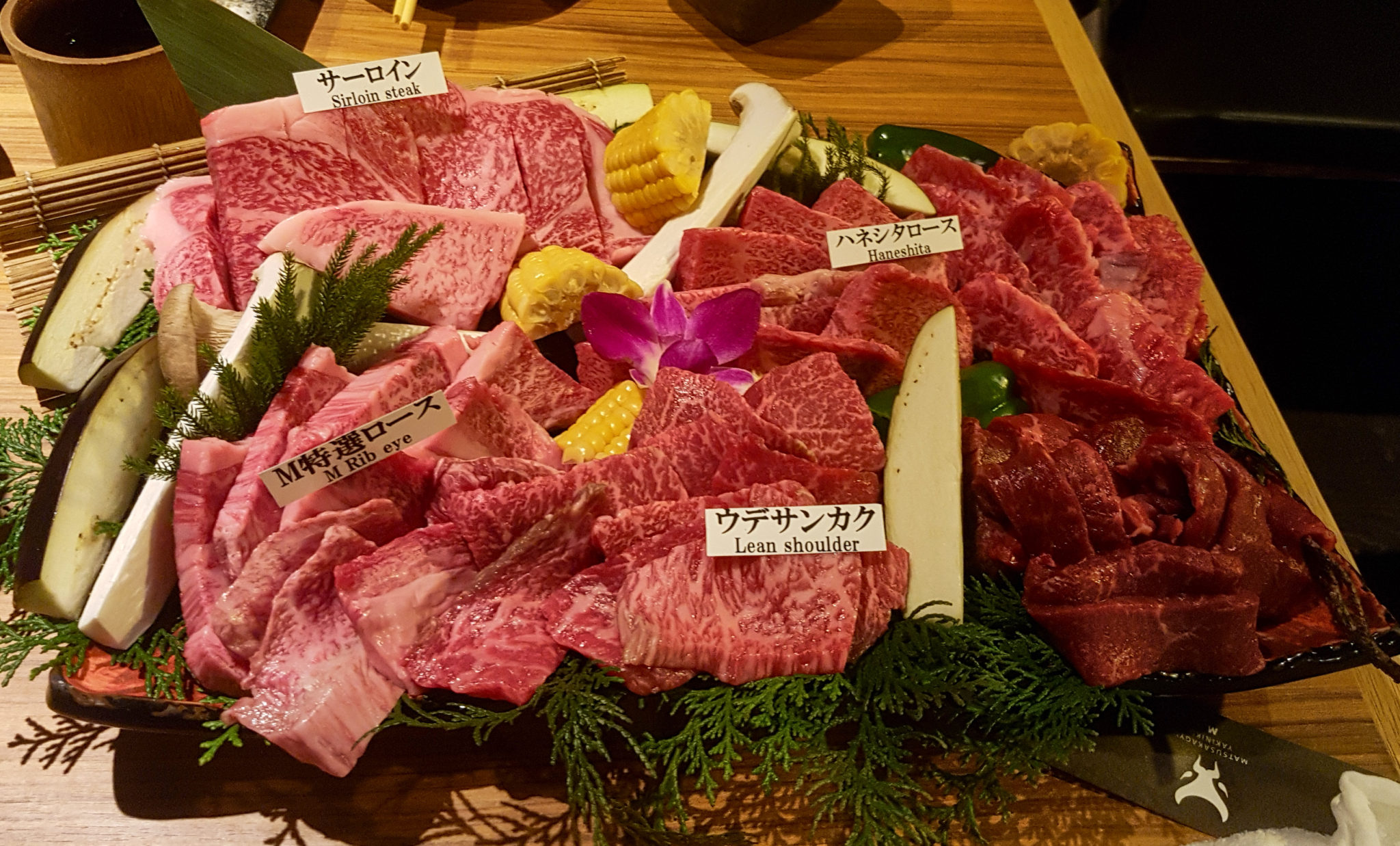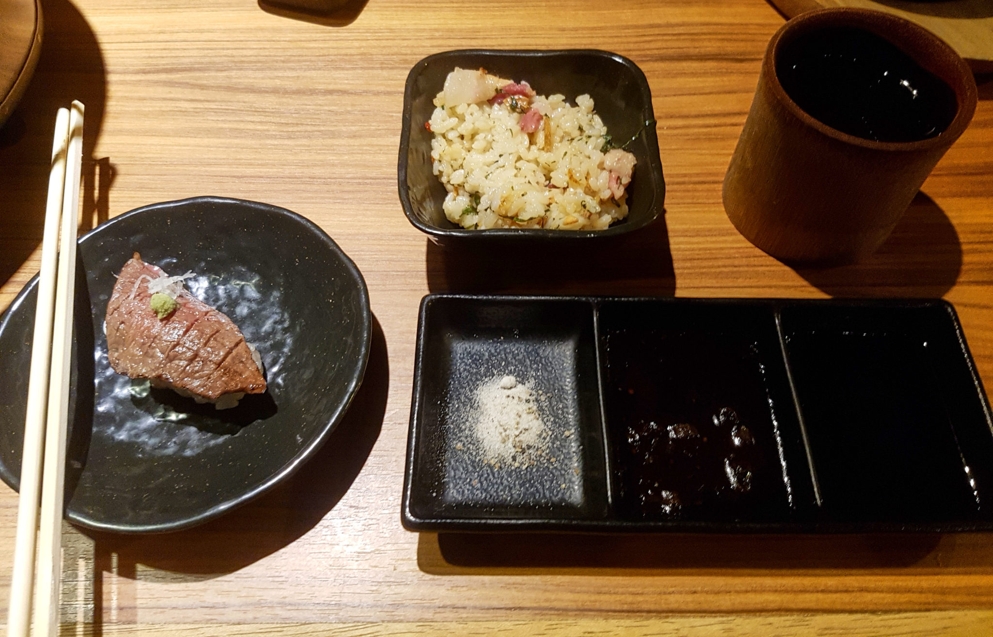 We shopped for the better part of the afternoon. We were all ready and extremely excited for dinner. Up until now we’d not had a chance for famous Japanese steak and tonight we had reservations at a steakhouse called YakinuM Dotonbori. We had been looking forward to this all day. We ordered a platter with different cuts of beef, along with kobe beef sushi and garlic rice.