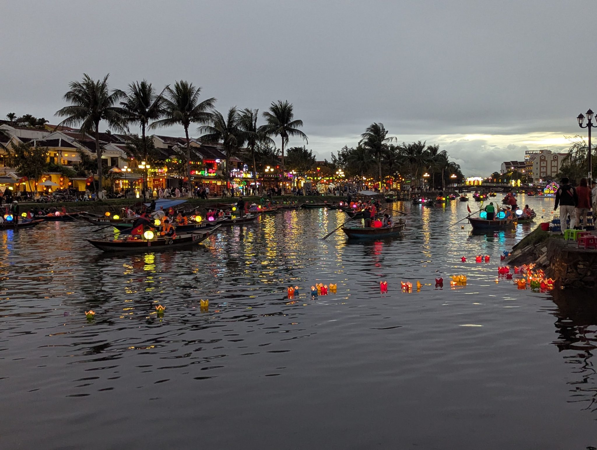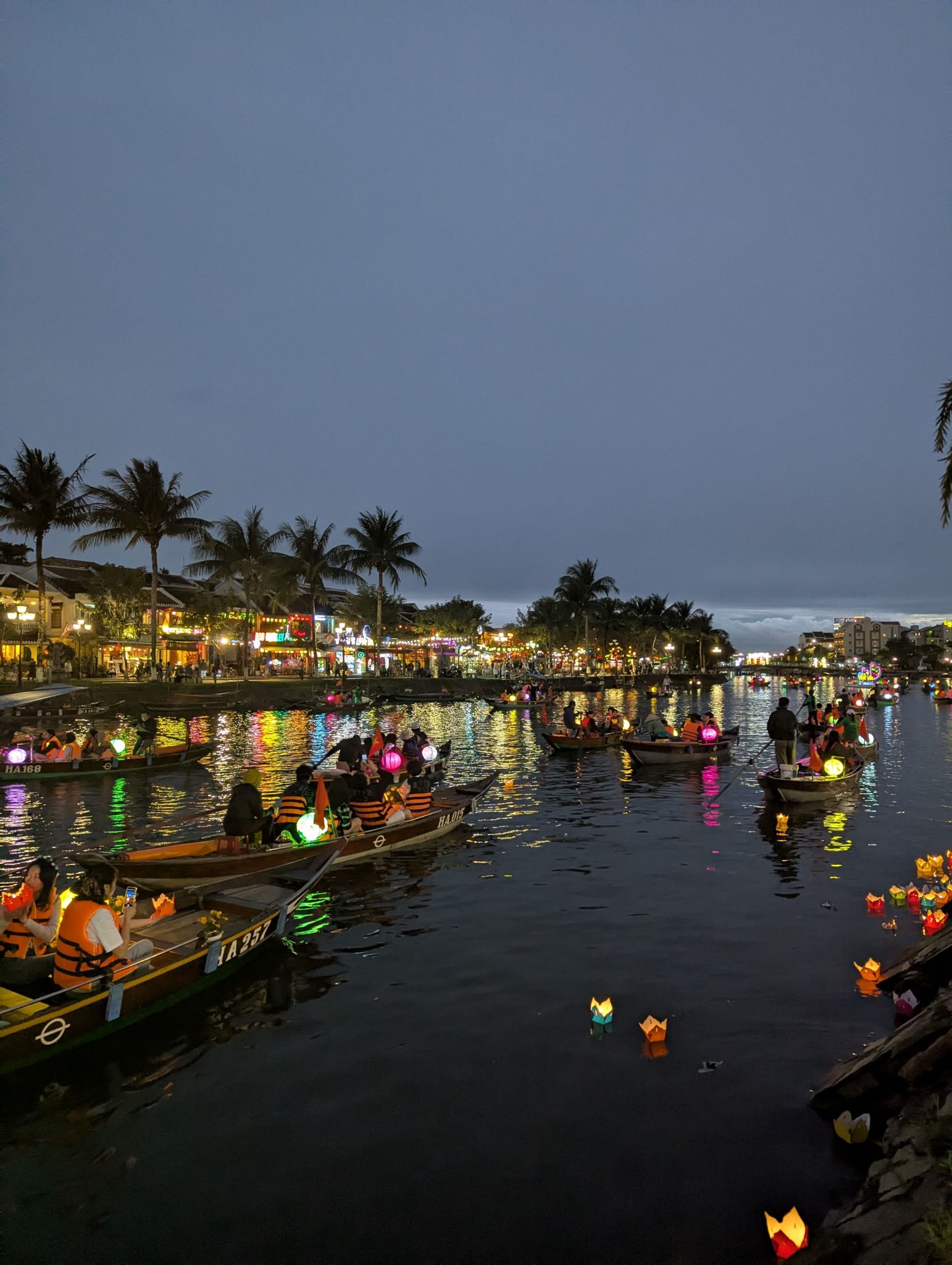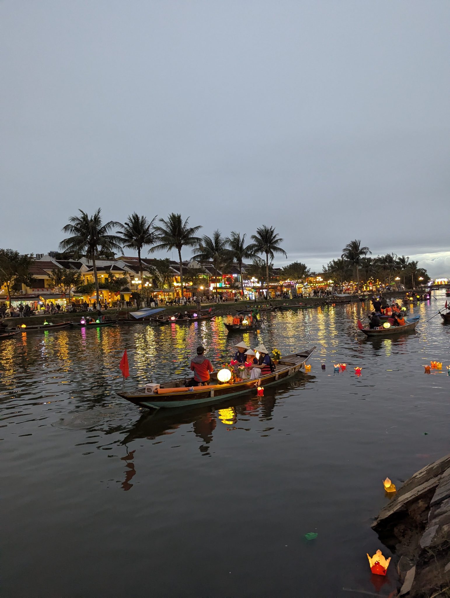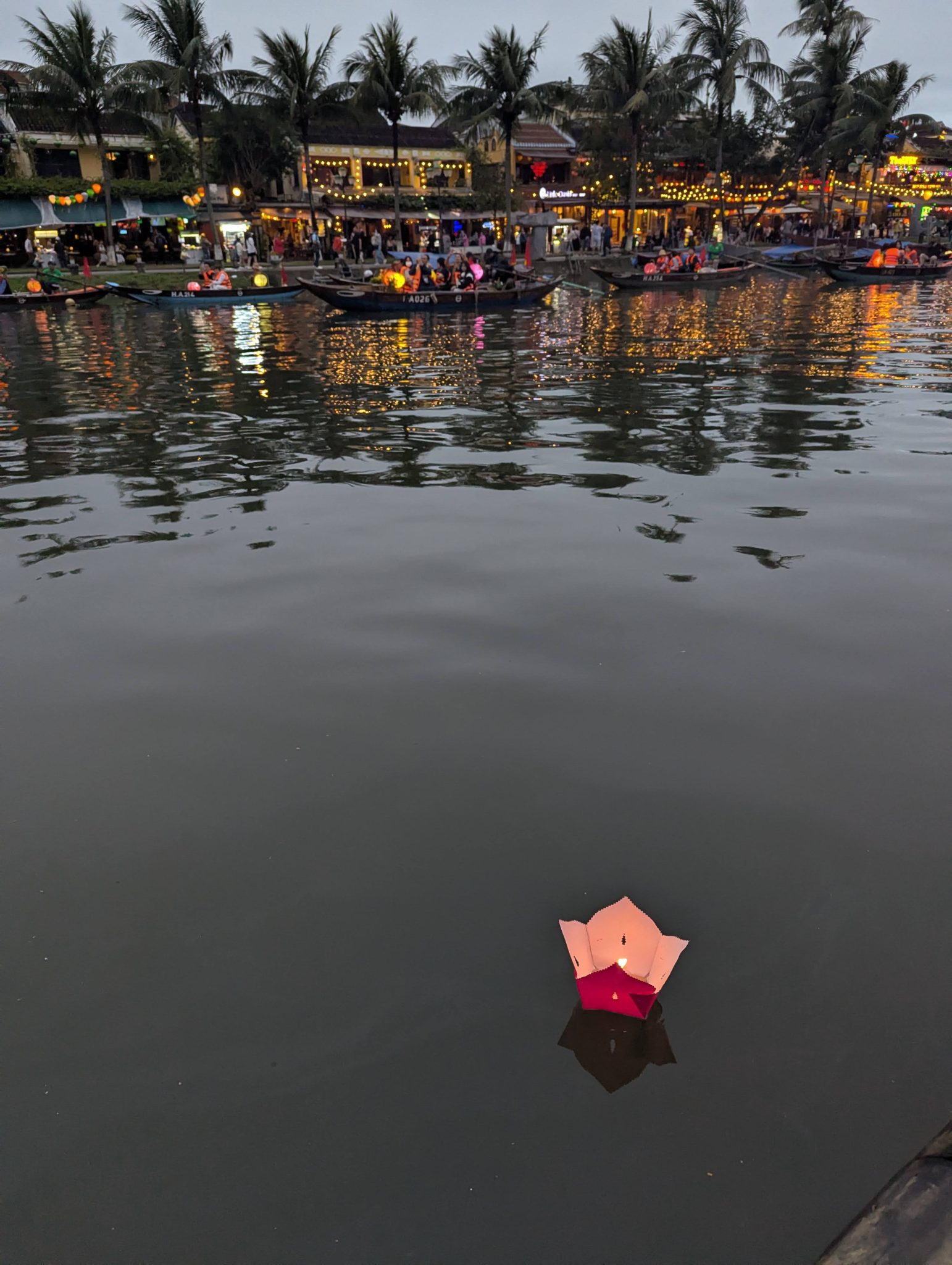 As we get closer the centre of town, we see that the boats are out in full force. And as the sun starts to set and the sky gets darker, the beauty of the lanterns really starts to shine through. The different coloured lanterns start to light up the river and the whole thing really comes alive. It is really pretty especially at night and a spectacle for the eyes. However, I do want to note that while its a beautiful sight. I think it’s more of a tourist event now than a cultural one. Most of the boats are for hire and the floating lanterns are for sale along the side of the river. Nonetheless, It’s something to be experienced and for that, well worth seeing.