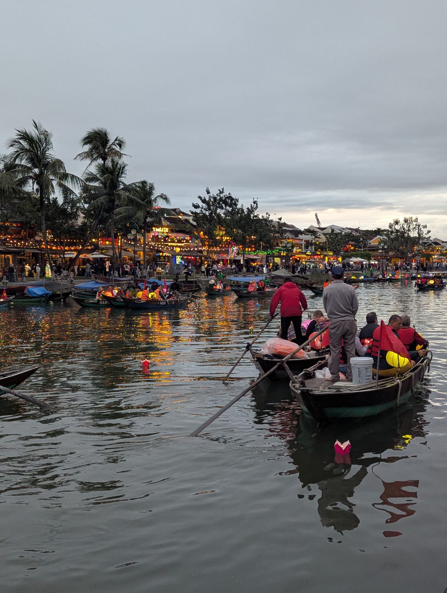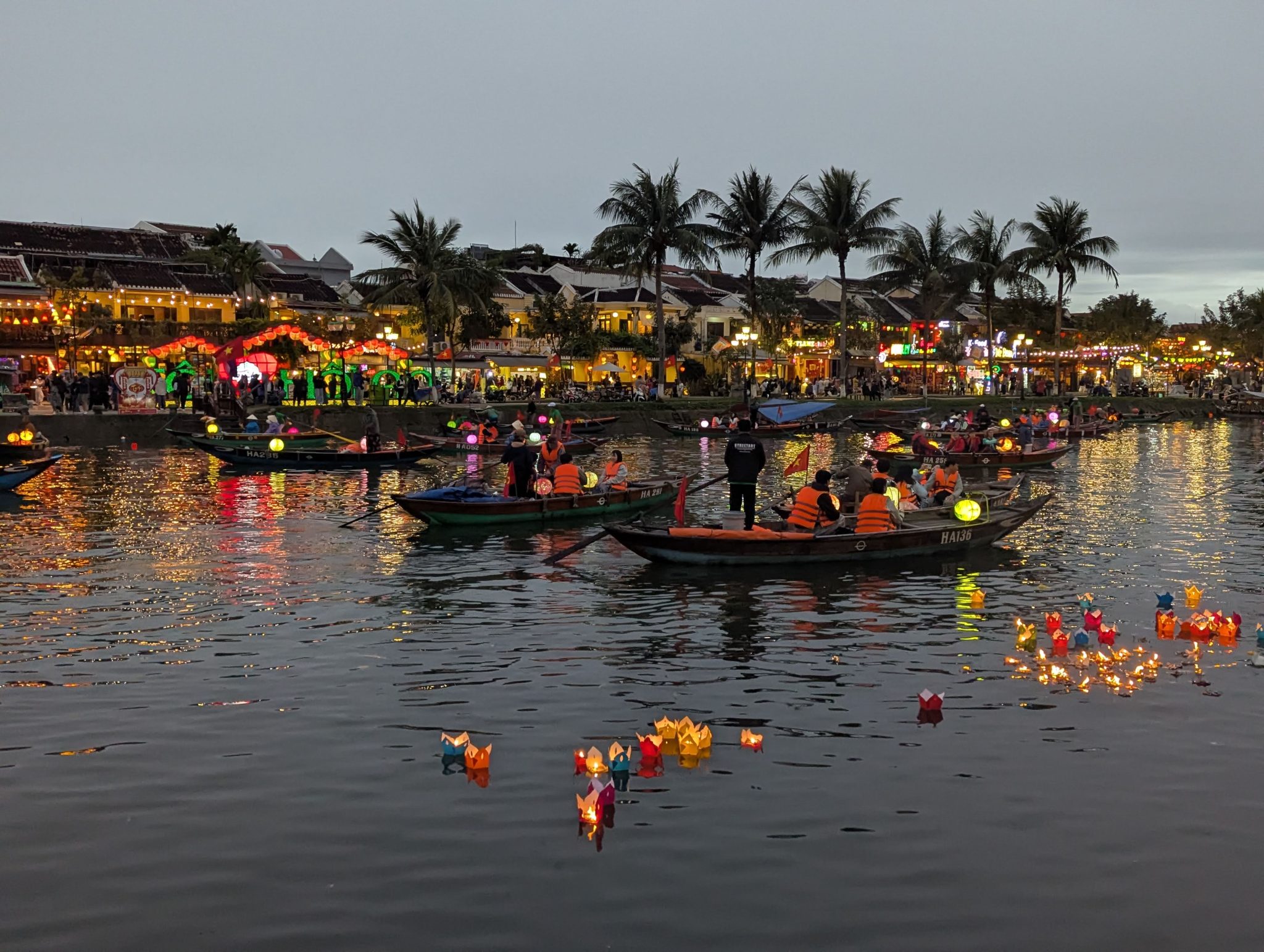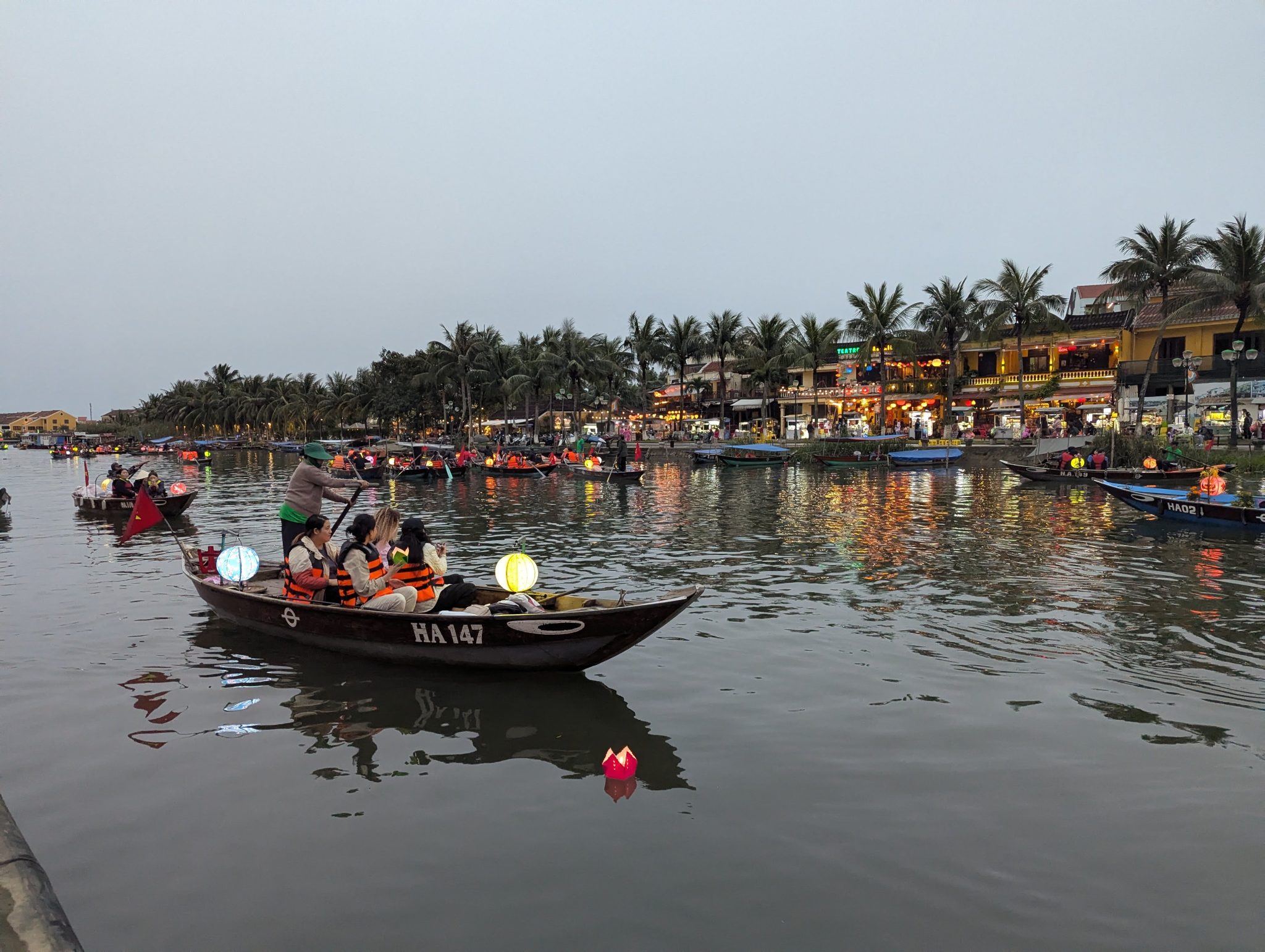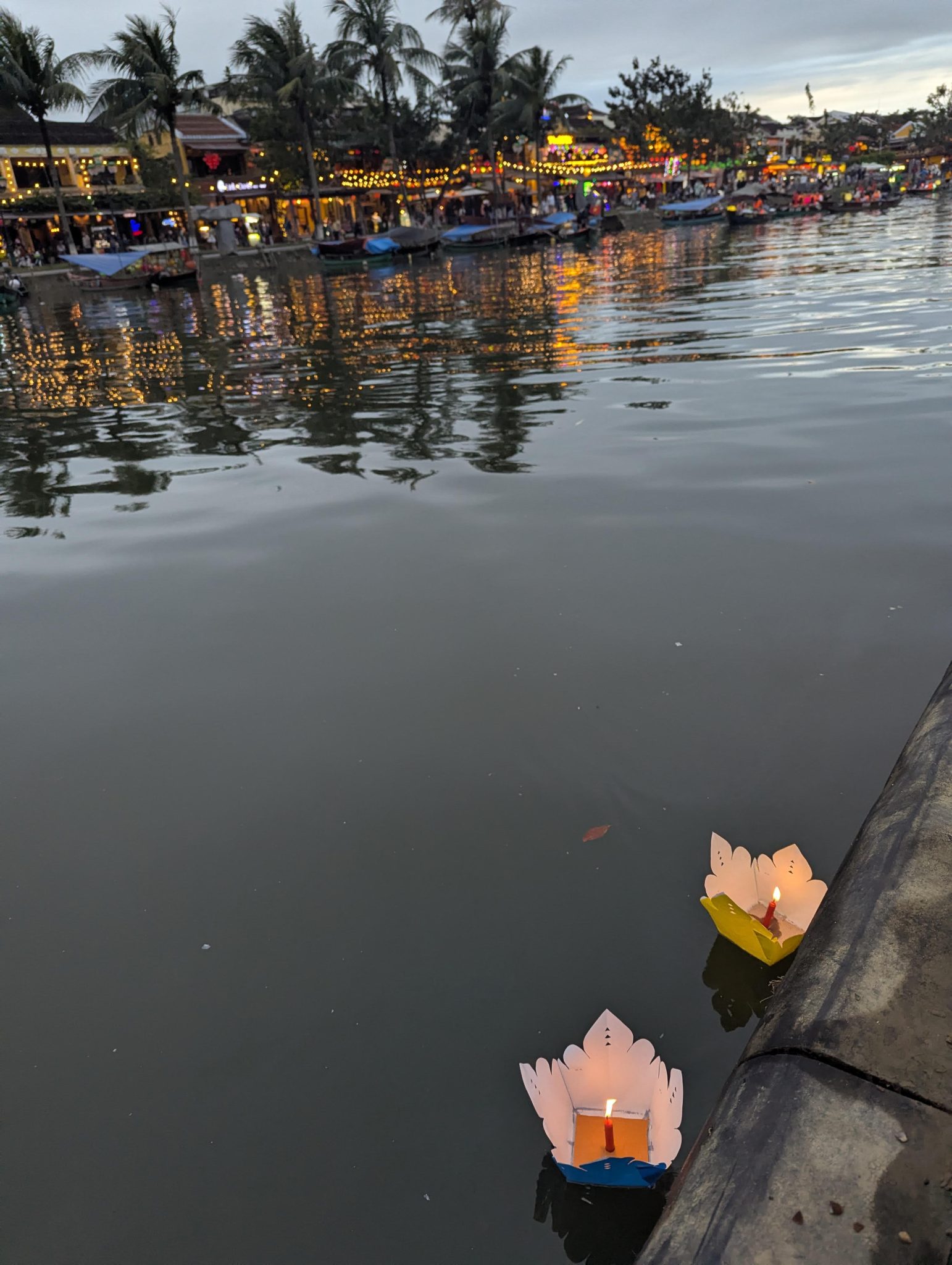 As we get closer the centre of town, we see that the boats are out in full force. And as the sun starts to set and the sky gets darker, the beauty of the lanterns really starts to shine through. The different coloured lanterns start to light up the river and the whole thing really comes alive. It is really pretty especially at night and a spectacle for the eyes. However, I do want to note that while its a beautiful sight. I think it’s more of a tourist event now than a cultural one. Most of the boats are for hire and the floating lanterns are for sale along the side of the river. Nonetheless, It’s something to be experienced and for that, well worth seeing.