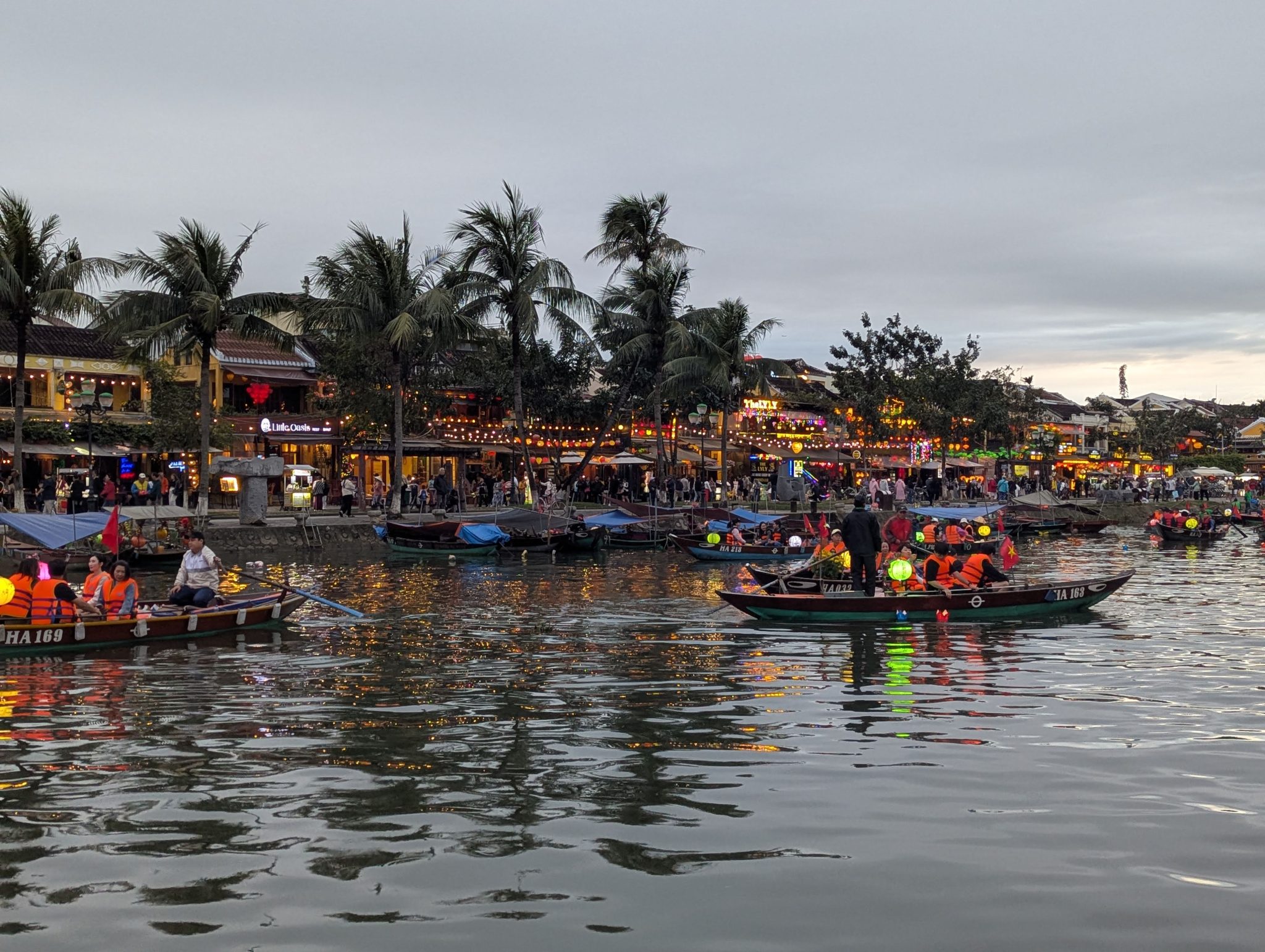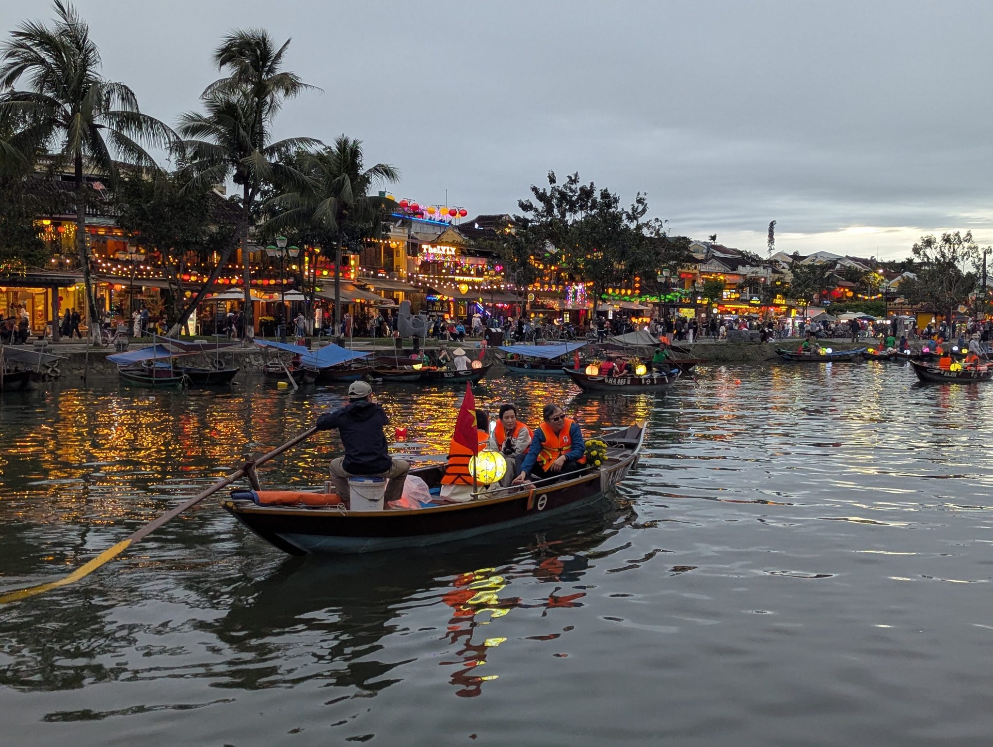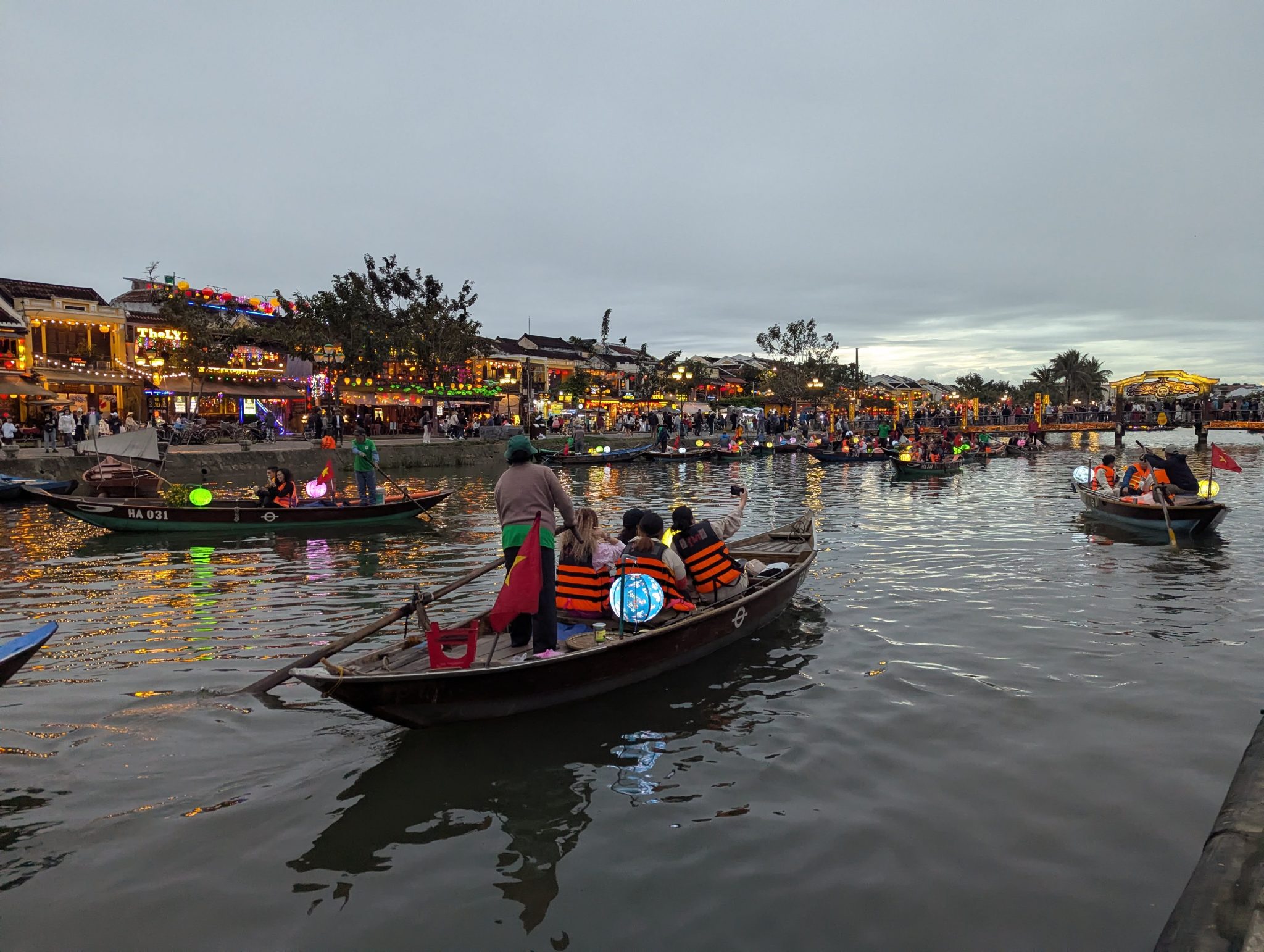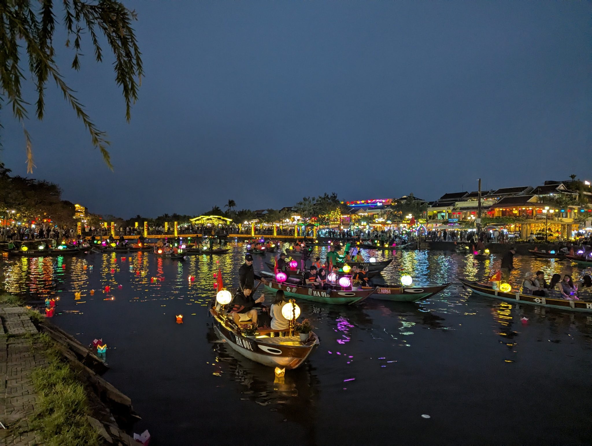As we get closer the centre of town, we see that the boats are out in full force. And as the sun starts to set and the sky gets darker, the beauty of the lanterns really starts to shine through. The different coloured lanterns start to light up the river and the whole thing really comes alive. It is really pretty especially at night and a spectacle for the eyes. However, I do want to note that while its a beautiful sight. I think it’s more of a tourist event now than a cultural one. Most of the boats are for hire and the floating lanterns are for sale along the side of the river. Nonetheless, It’s something to be experienced and for that, well worth seeing.
