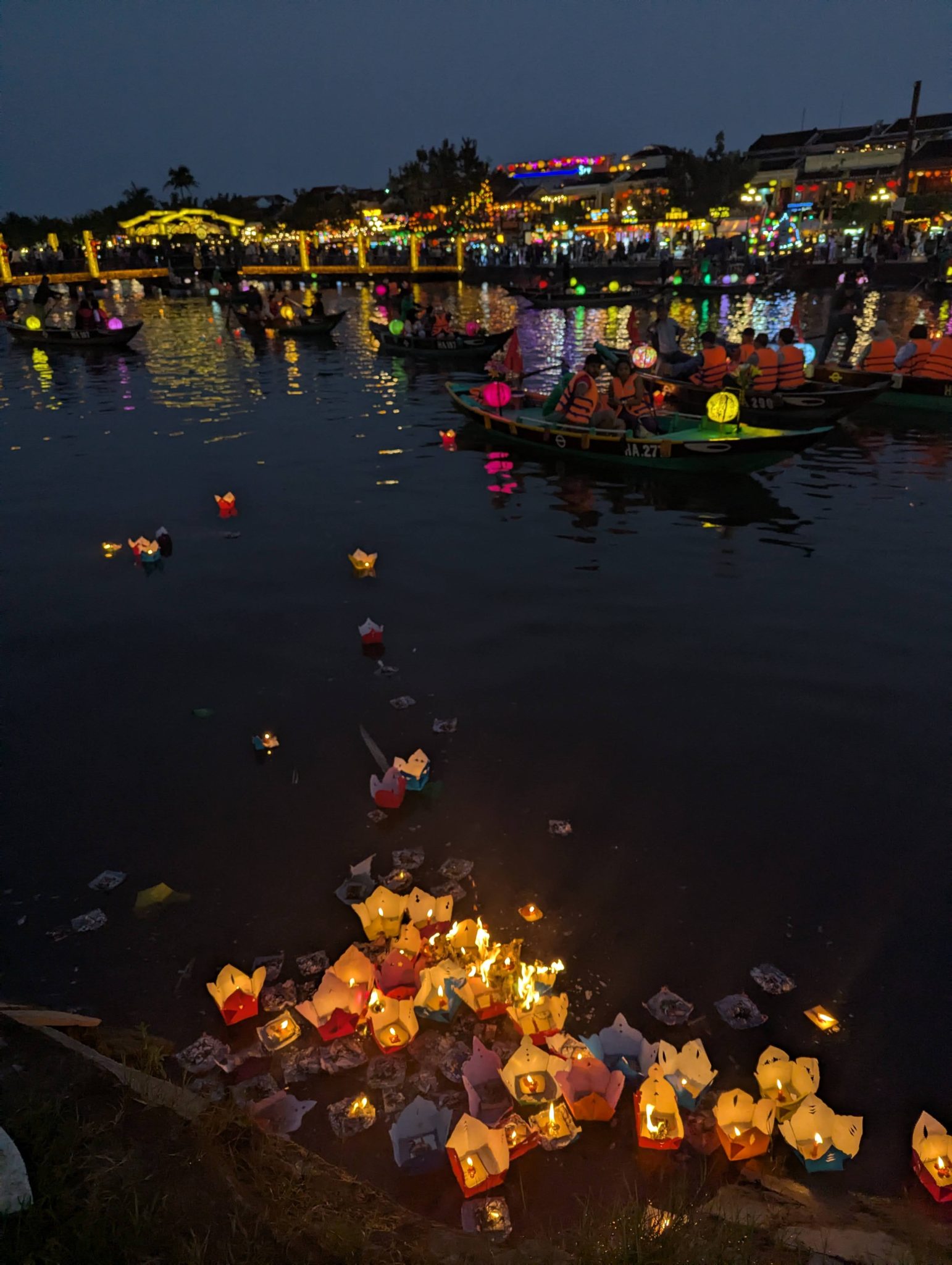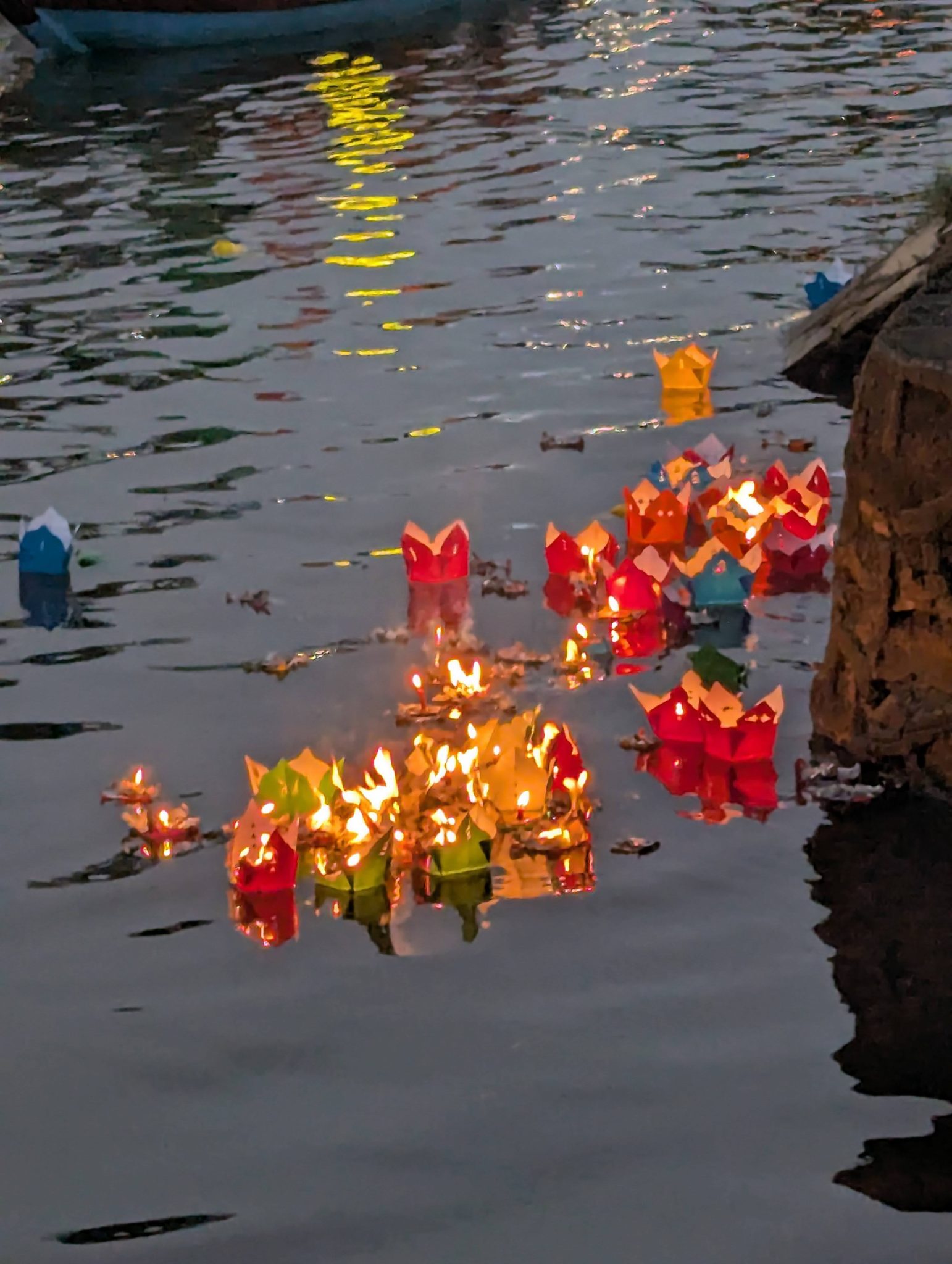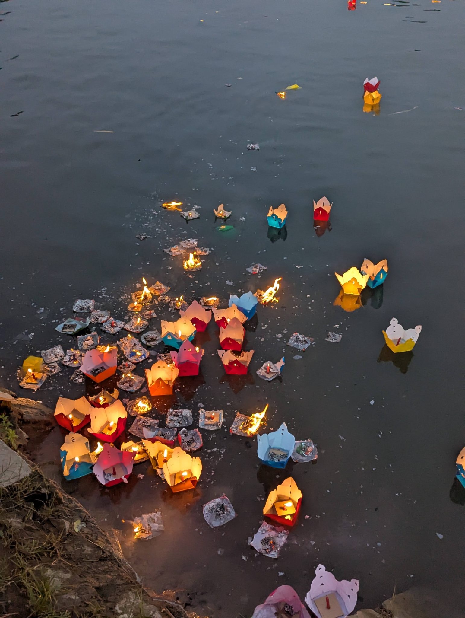 As we continue along the river, something did pique our interest. As the lanterns flow downstream, there are pockets along the riverbank where several seem to collect. And since these are paper lanterns with an open flame and an external breeze, something is bound to happen. As lanterns would start catching on fire it would spread to the others collecting in the same area until you end up with a few dozen floating lantern shells. The sister and I were fascinated by watching lanterns float by or “fall into this trap”. It’s almost like a show within the show!