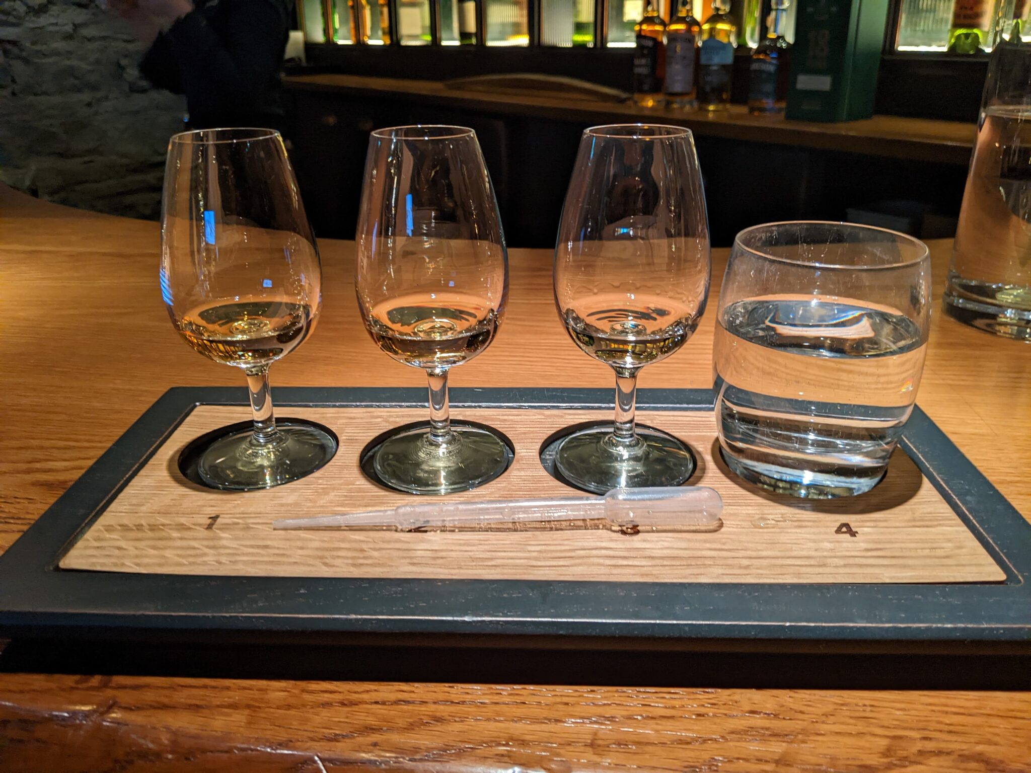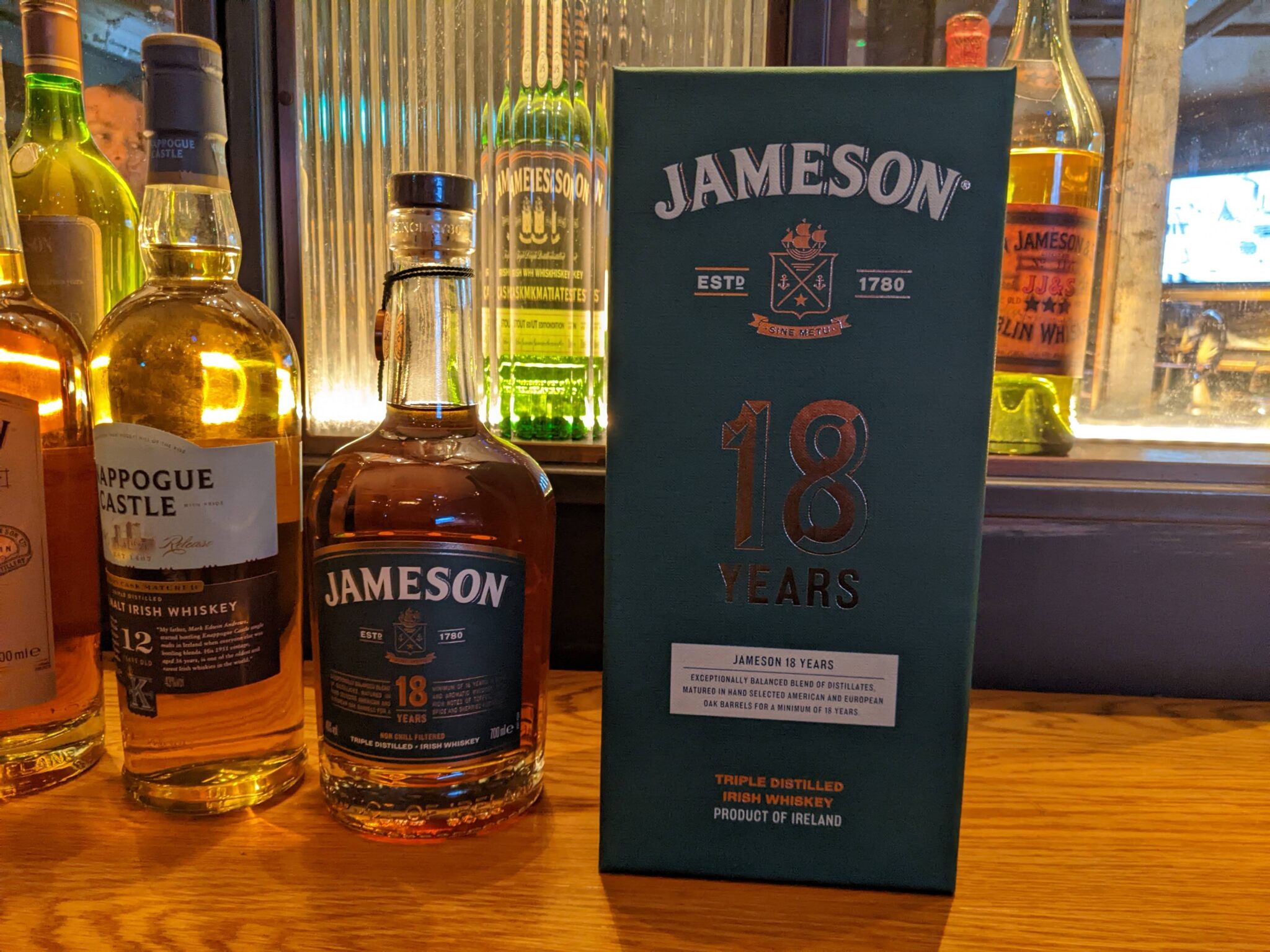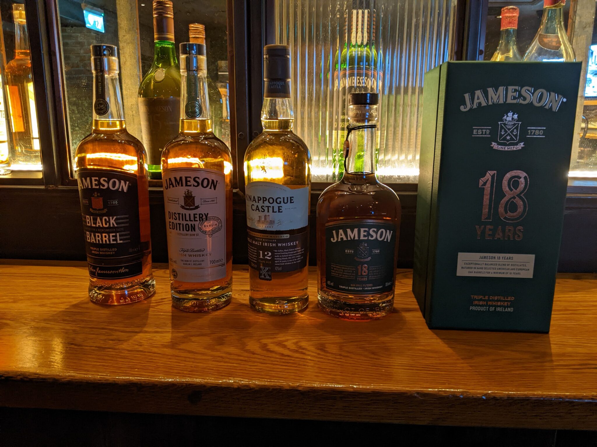 At the end of the Bow Street Experience, we return to the main lobby where I proceed to get my “ticket” for the Secret Whiskey Tasting. After a short wait, our tasting group starts to form and we are led through a small door, through a hallway and into a back room. This room is setup like a private bar and we’re told this used to be John Jameson’s own office. But now is the place that the Secret Whiskey Tasting occurs. We all find our seats and our guide then takes us through the four selections that will make up our tasting. These include: Jameson Black Barrel (which we had on the bow street experience), Jameson Distillery Edition, Knappogue Castle Single Malt, and the Jameson 18 Years.