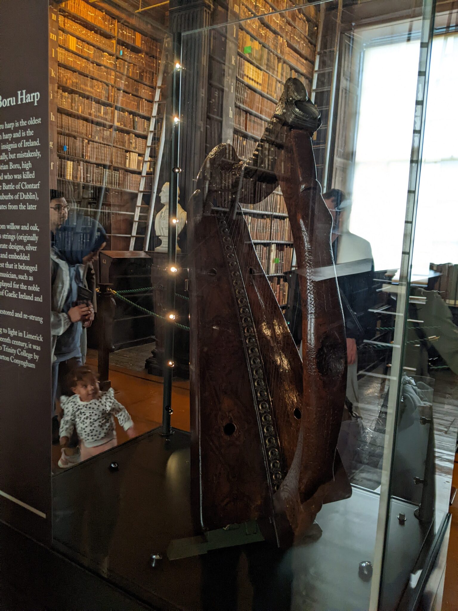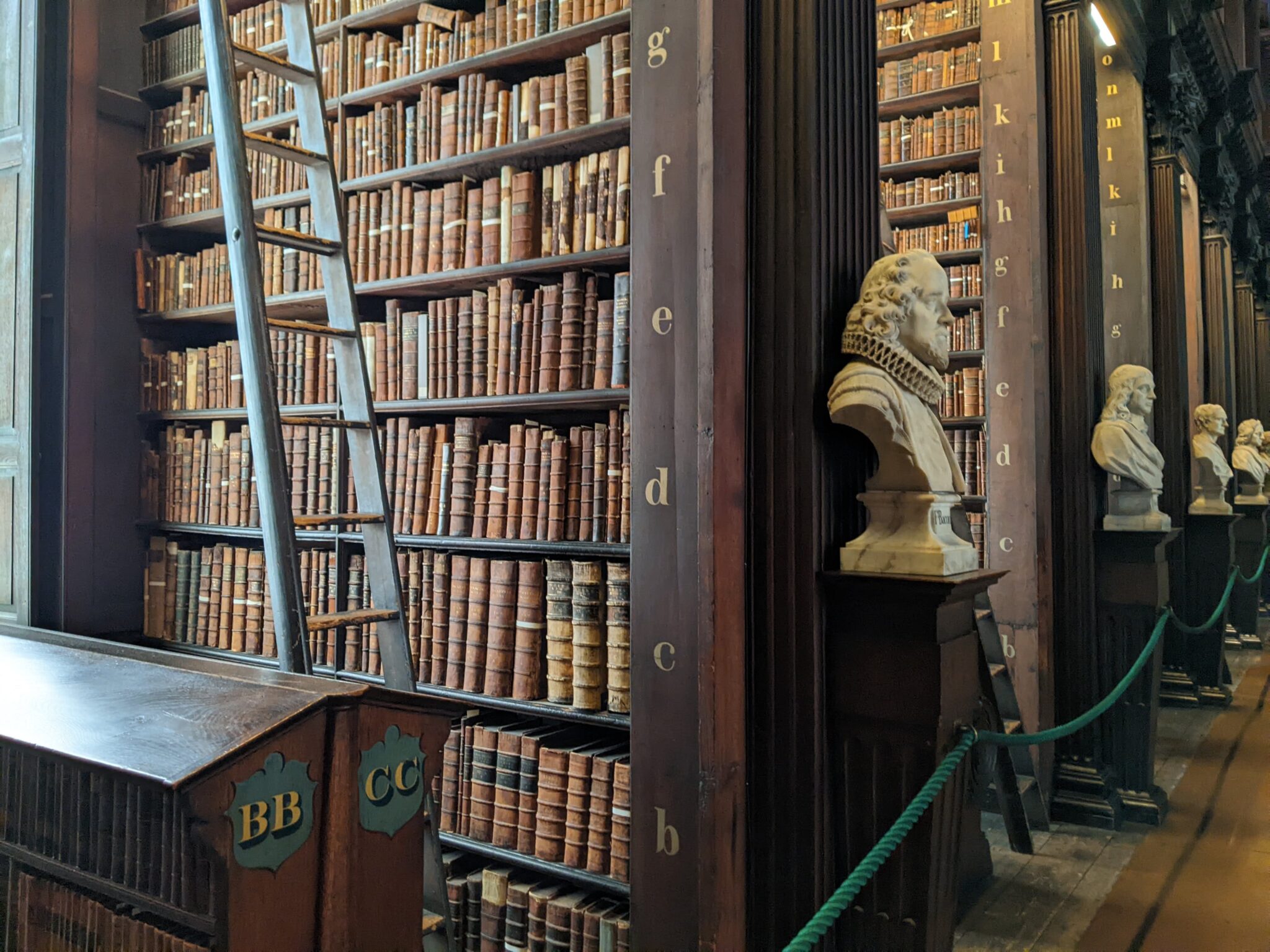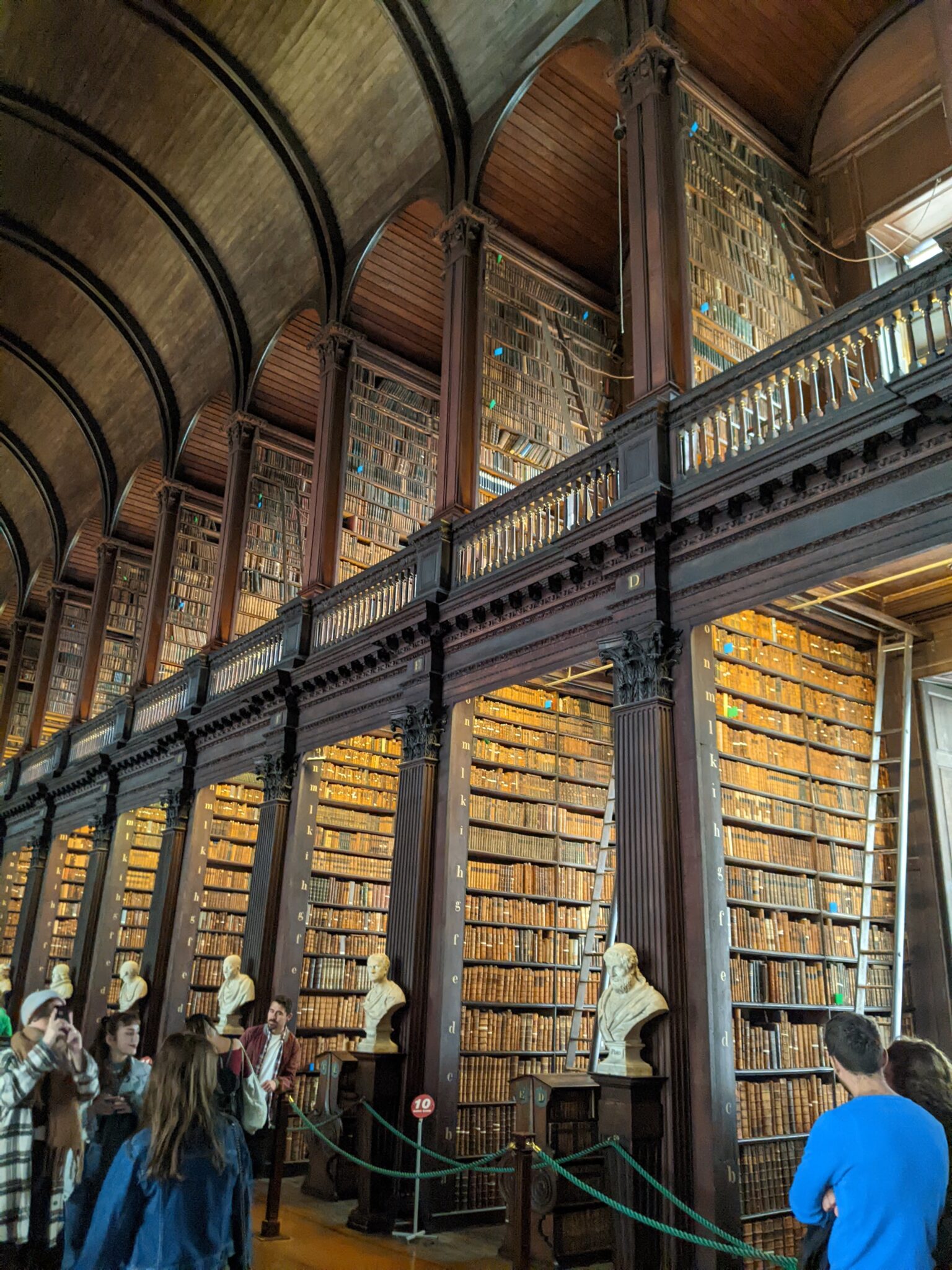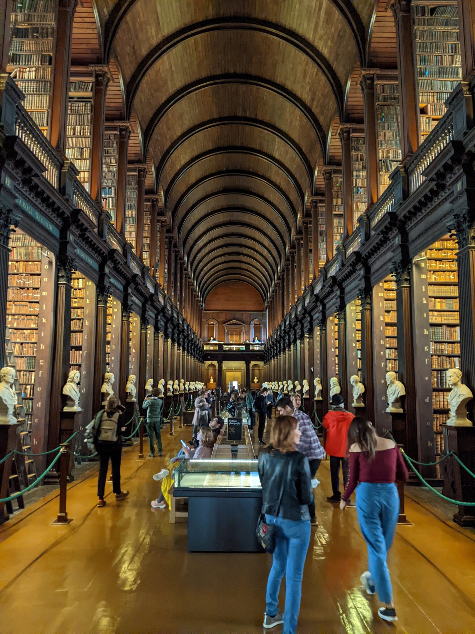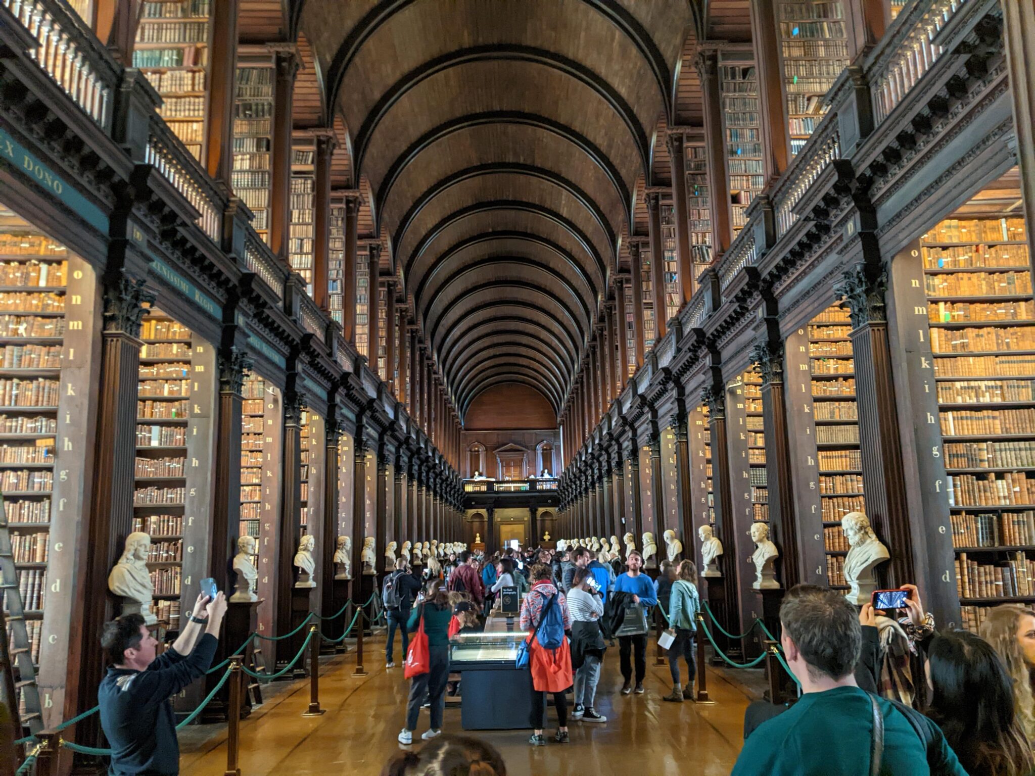 After the Book of Kells room, we arrive at the “Long Room“. This is literally a long library room which is home to some of Trinity College’s oldest books. There are floor to ceiling shelves full of books and busts of famous people in History limning the main hall. To be perfectly honest, I think the long room is more impressive to see than the book itself. Walking into the library, everything seems so grand. Knowing that there are very historical and rare books on the shelves adds to the allure of the room!