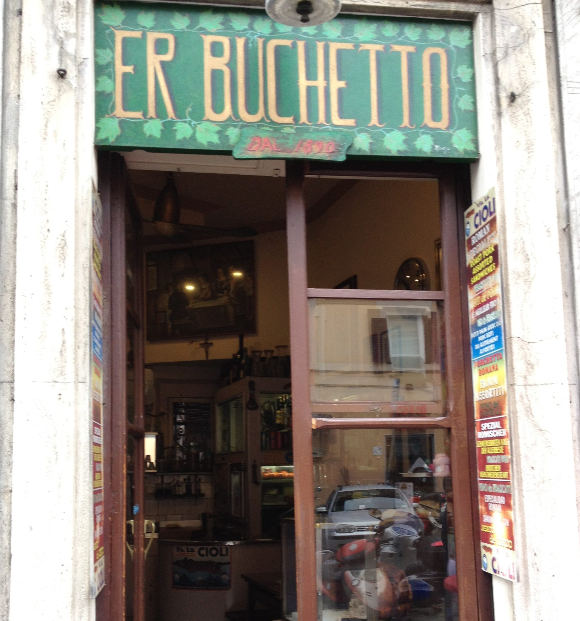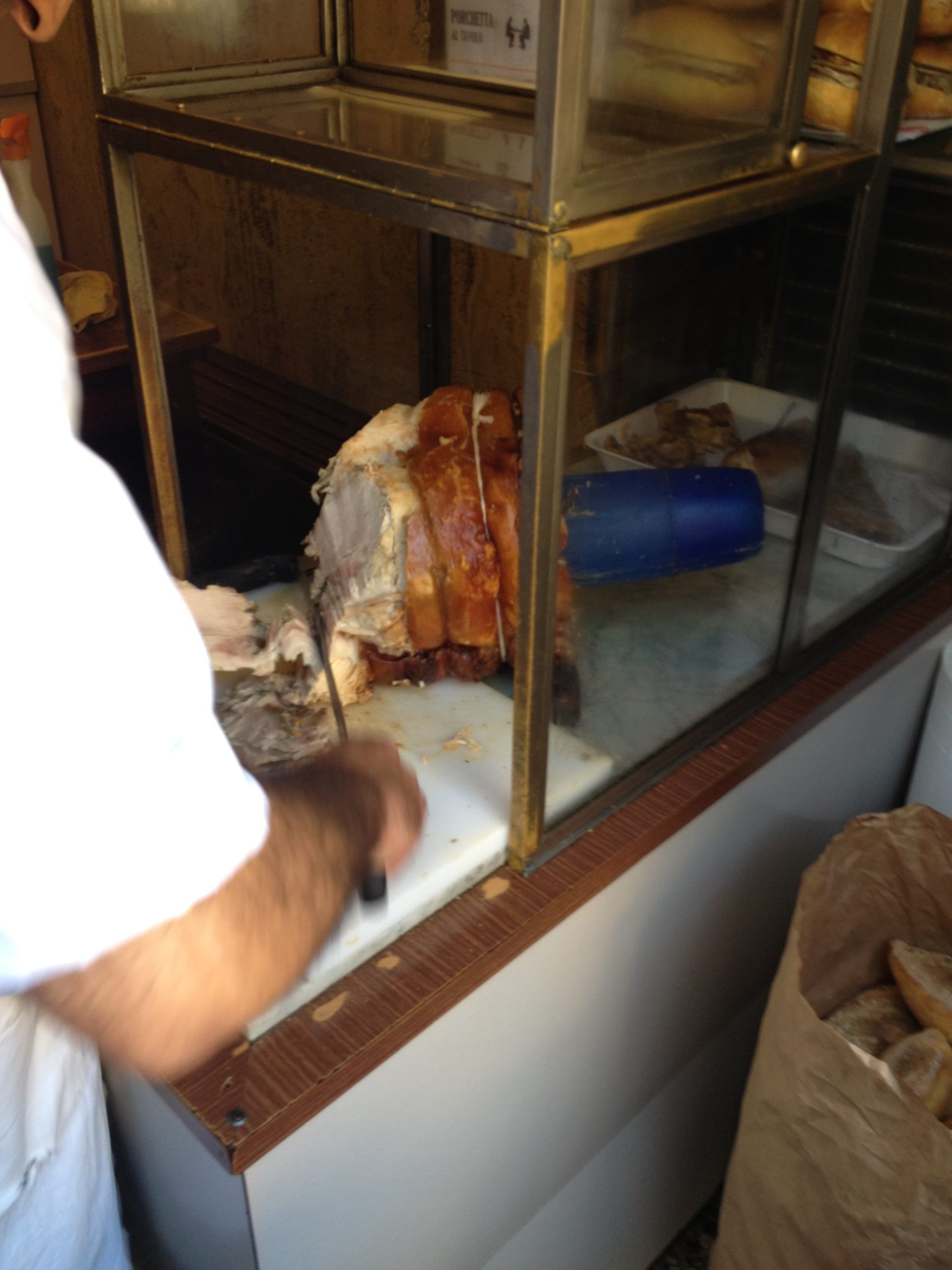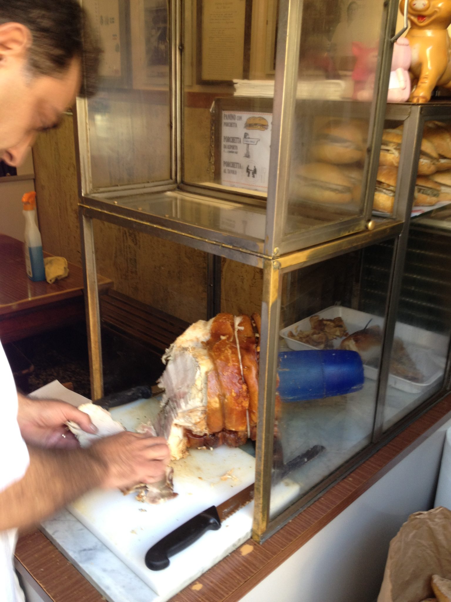 On my walkabout I stumbled upon this excellent hole in the wall sandwich stop called Er Buchetto. If you recall our family discovered and fell in love with these pork sandwiches in Modena. To my pleasant surprise, as I walked by I saw this roasted pig sitting on a cutting board with a bag full of bread right beside it! I obviously had to indulge and let me tell you it was just as good as the one in Modena!