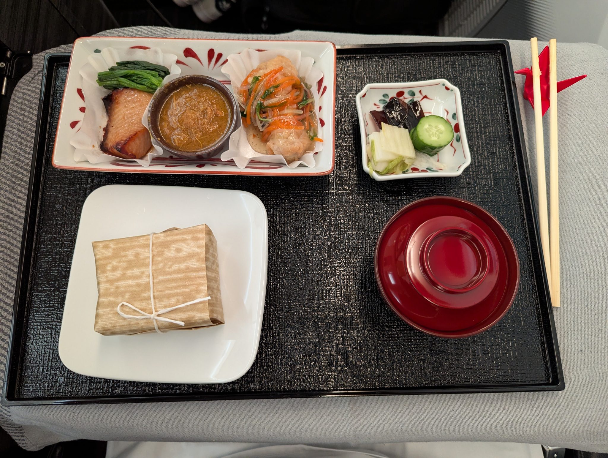 Eventually its time to board my flight to Seattle. I’ve been fortunate enough to fly a fair amount of business class flights but its always a treat when its a Japanese carrier. The onboard catering and service are spectacular and this flight is no different. For dinner I opt for the Washoku meal which starts with a selection of seasonal delicacies, then the main course which is a Grilled Marinated Black Cod, curry and deep-fried Chicken with Steamed rice. (image of menu included) For the pre-landing meal I opt for two a la carte selections in the katsu sandwich and the ramen. Sufficed to say EVERYTHING is very good and I am very satisfied with the food. The pods are also very comfortable. While not the most modern business class pods. They do provide a fair amount of privacy and space which isn’t always the case. All in all the flight across the ocean is smooth and relaxing and before I know it we are touching down in Seattle.