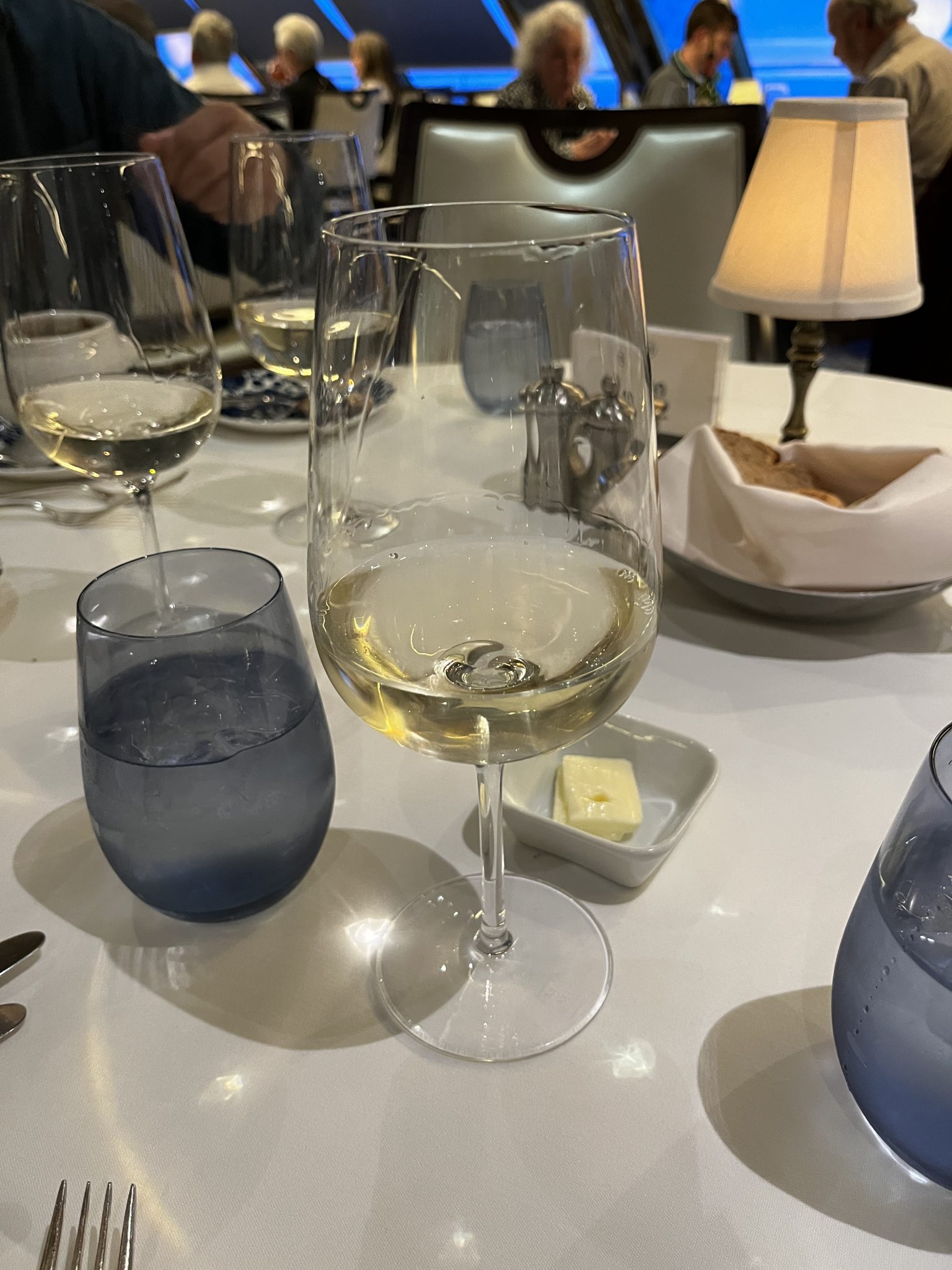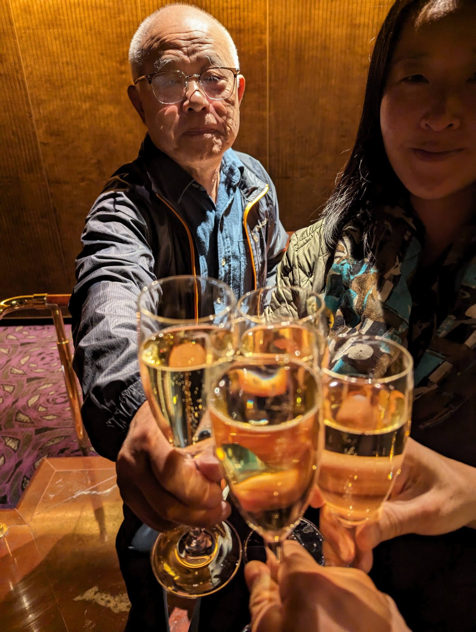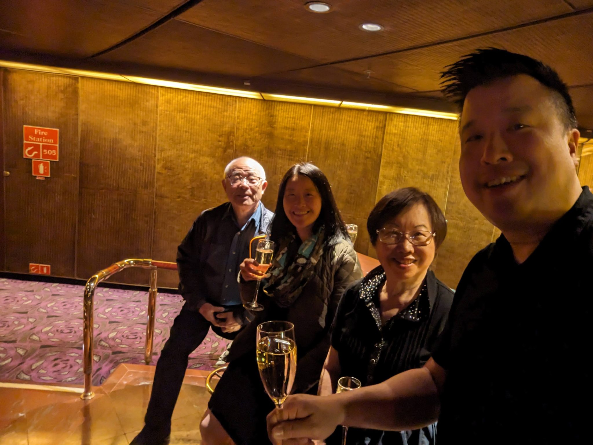 As evening rolls around, our thoughts turn to dinner. But before dinner, we make our way to the auditorium where the Captain is doing a champagne toast. I think the family is probably more keen for the free champagne than we are for the speeches, but nonetheless we find ourselves here for the toast!