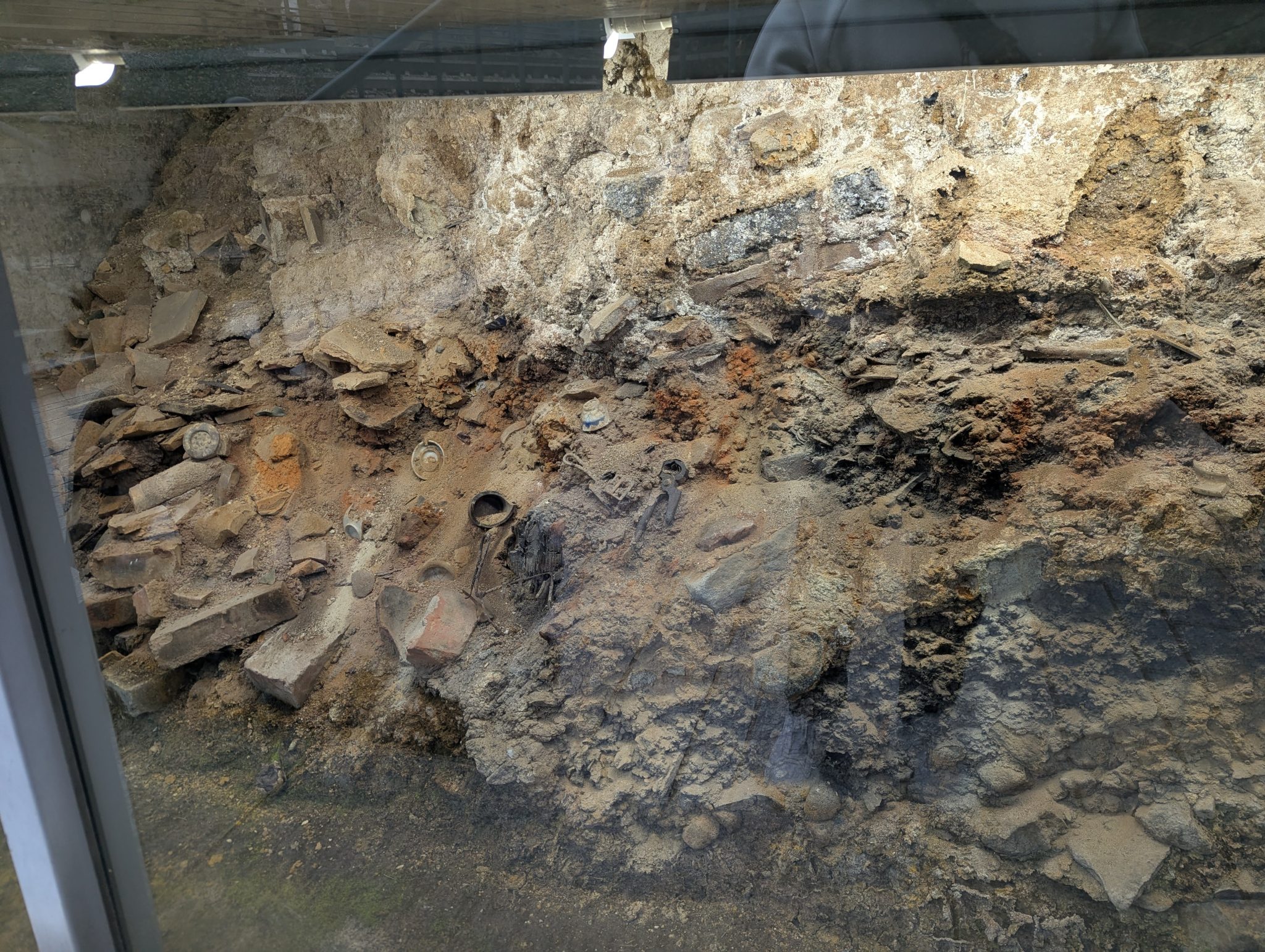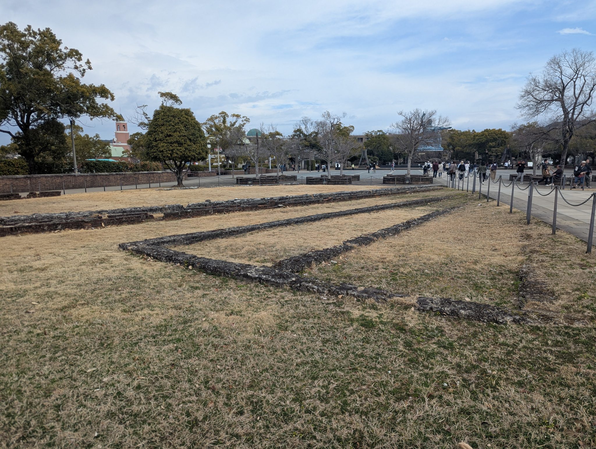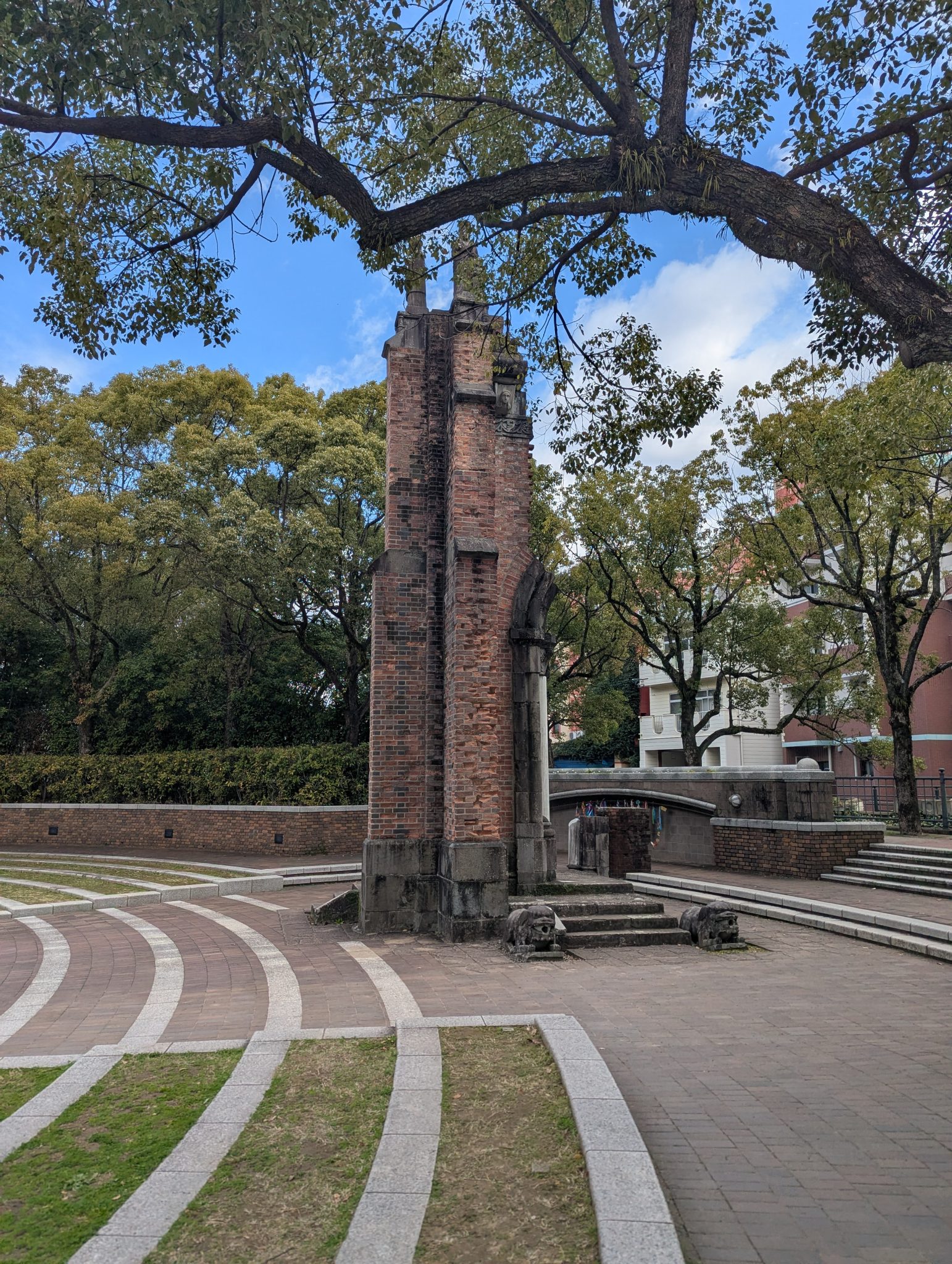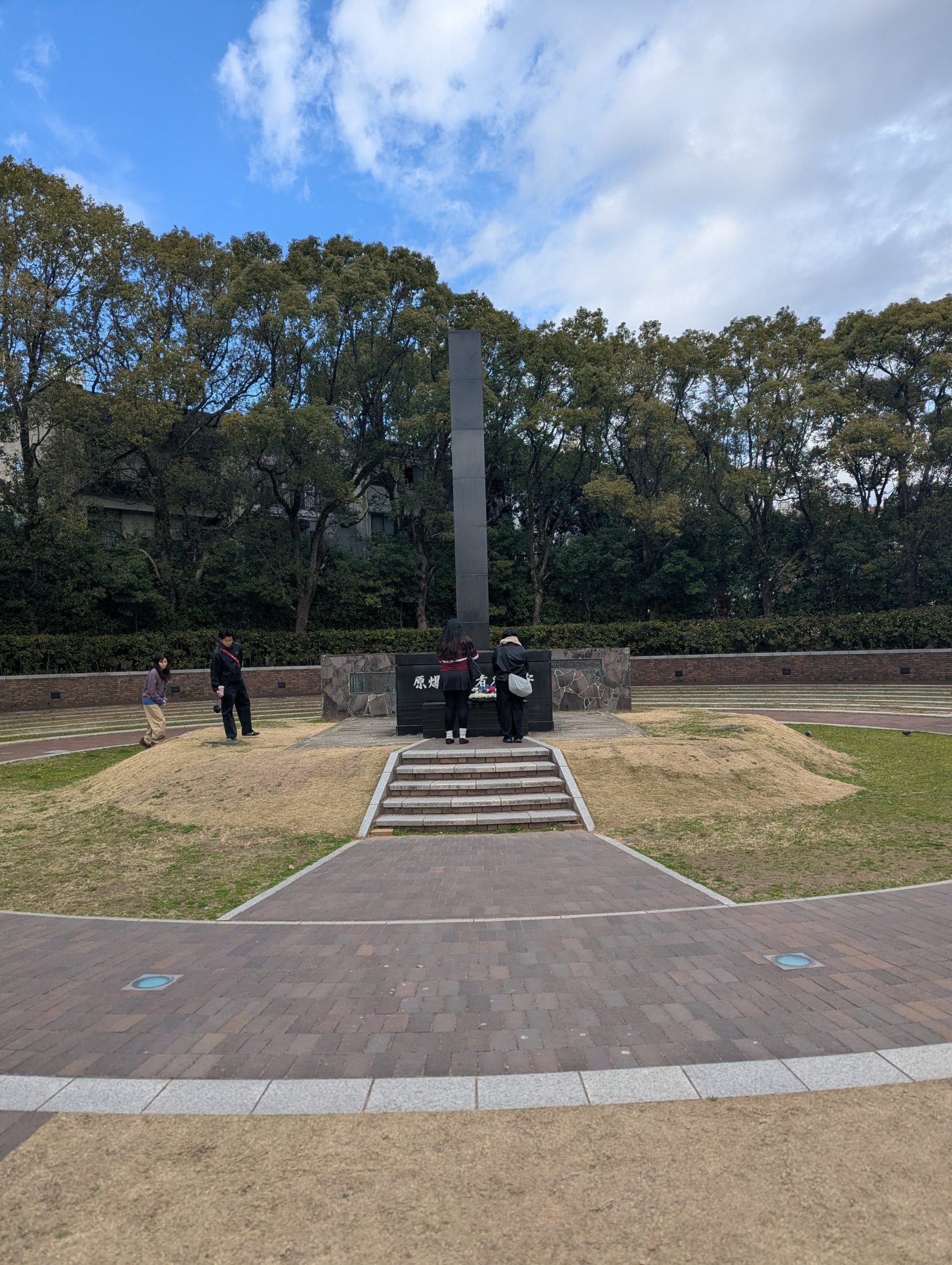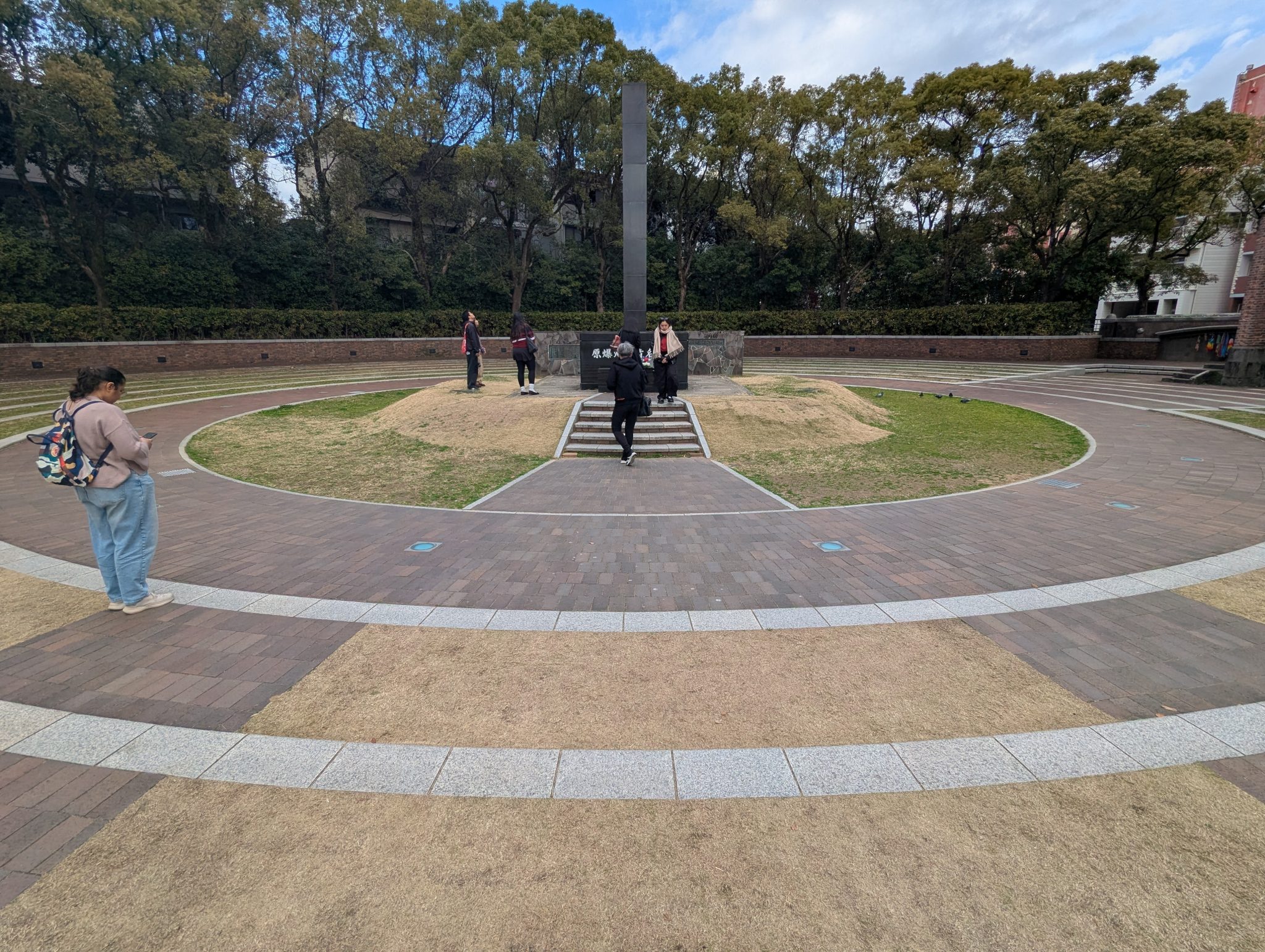 Across the street from the peace park is the Hypocenter Monument. This is “ground zero” of the atomic bomb blast. The bomb detonated in the air above this point and there are circular rings that emanate outwards from the monument. Seeing and being at this point brings about a heavier feeling and we spend some time to explore the area. There are other monuments along with an area that allows for you to get to the actual ground level of the blast. From there you can kind of see the debris that has formed an elevated ground level.